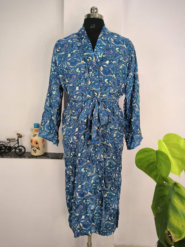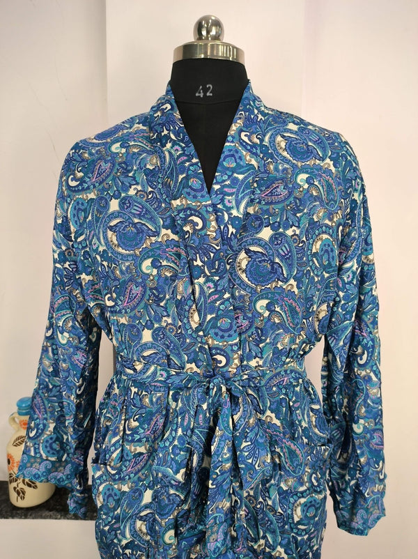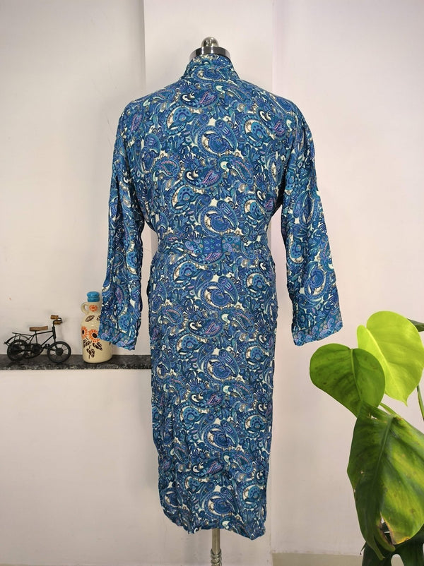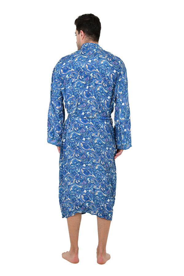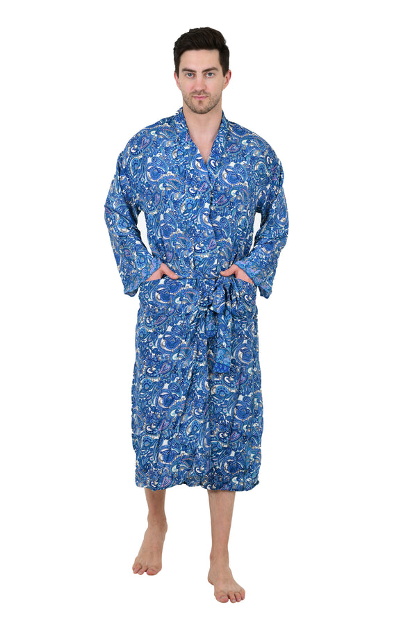 Boho Men's Soft Silk Kimono, Man Regal House Beach Robe, Persian King Paisley Elegant Blue Yellow Hues