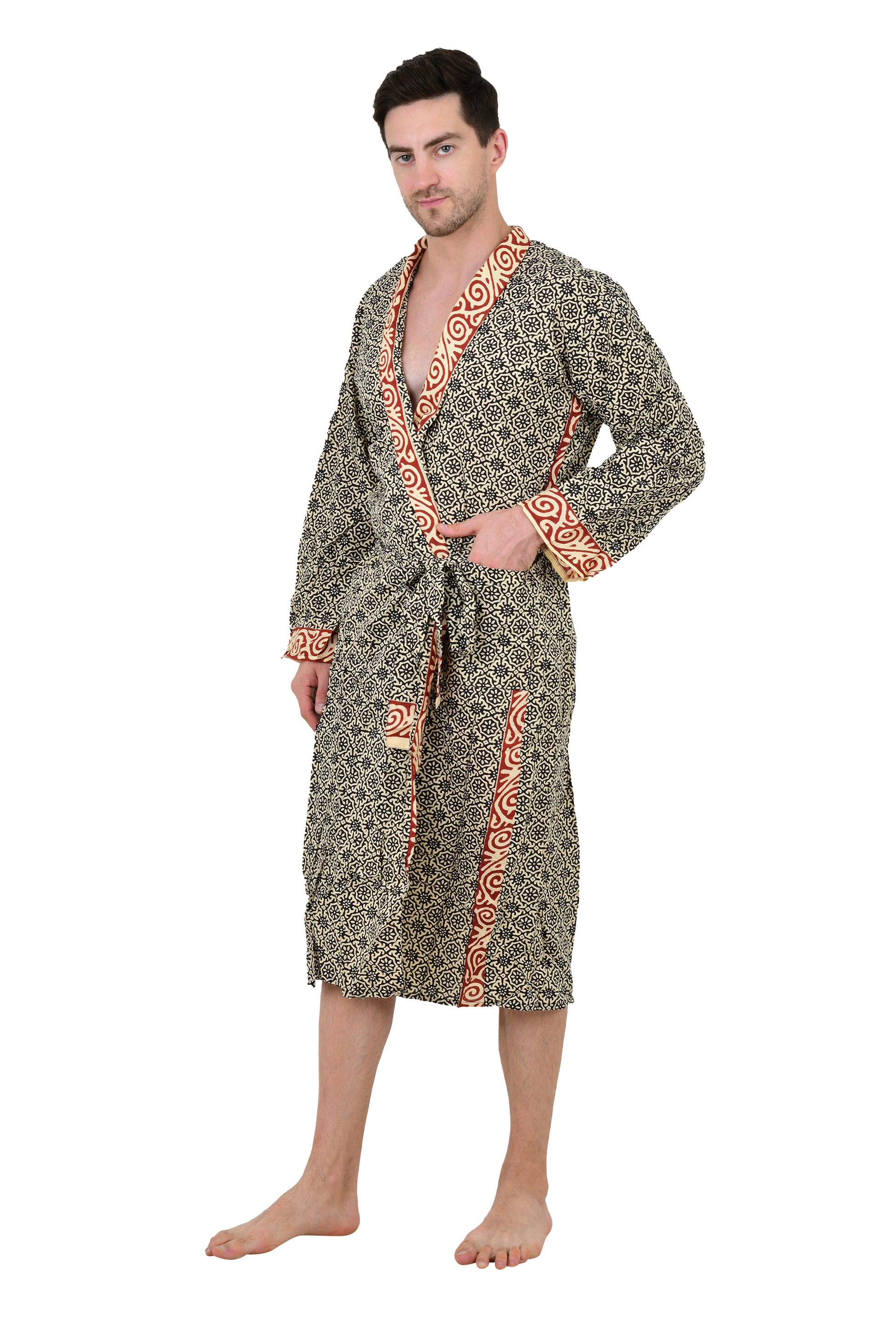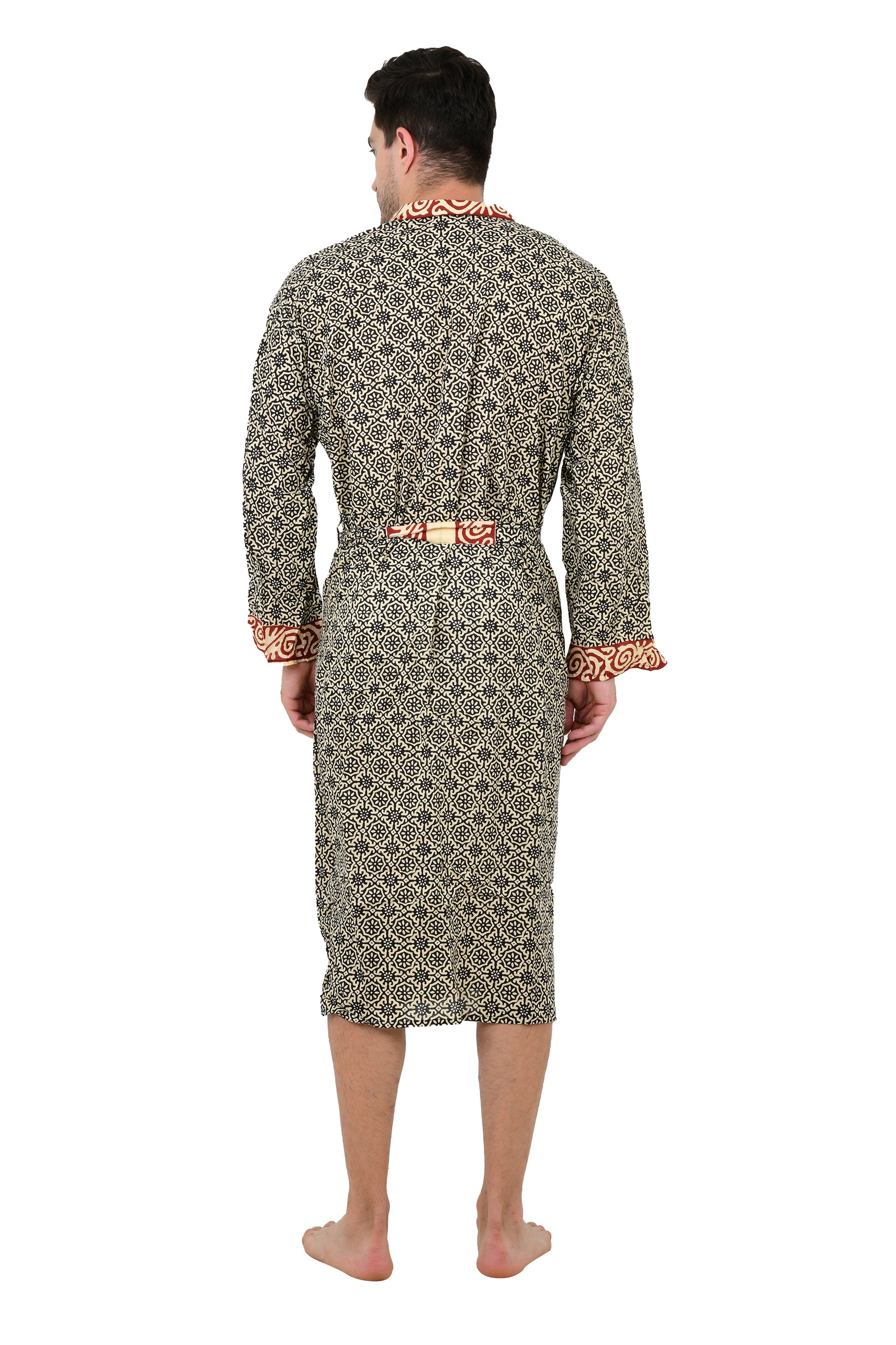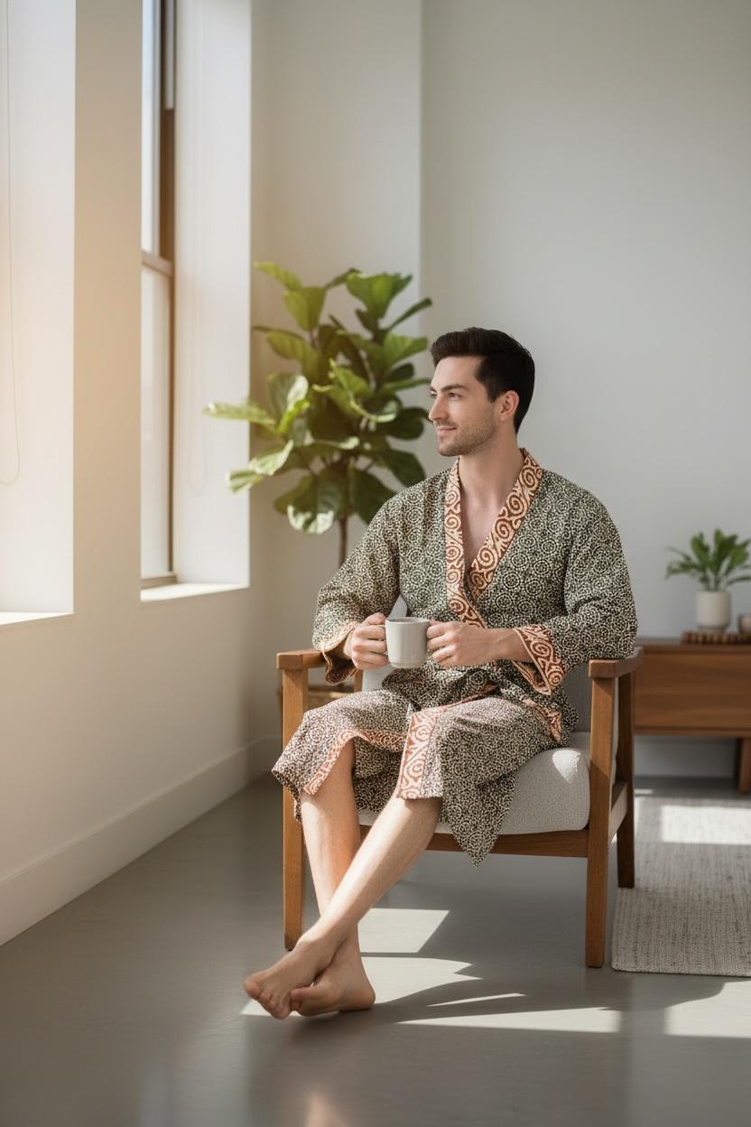 This Pure Cotton Handblock Kimono offers breathable comfort, artisan quality, and versatile styling—an effortless men’s house robe designed for everyday relaxation.