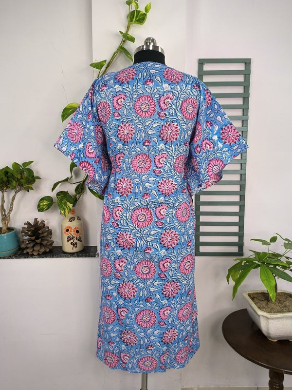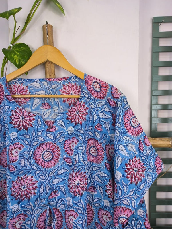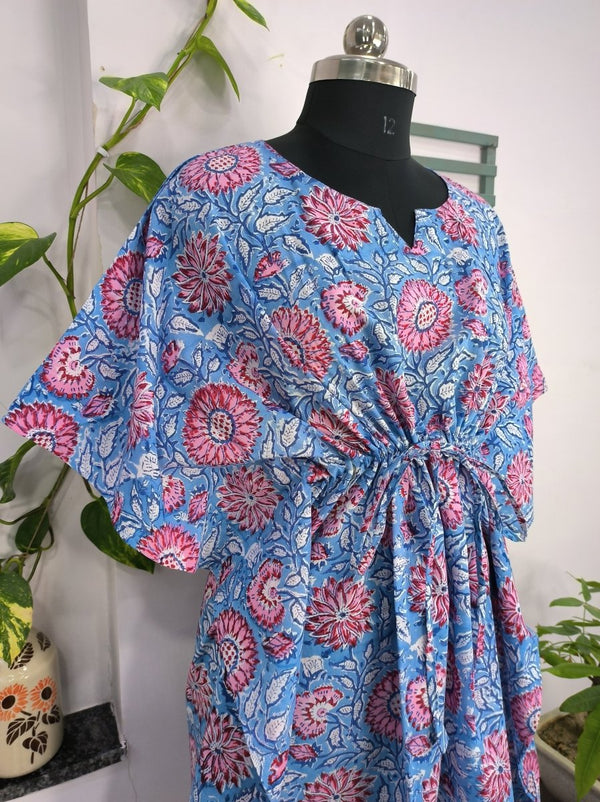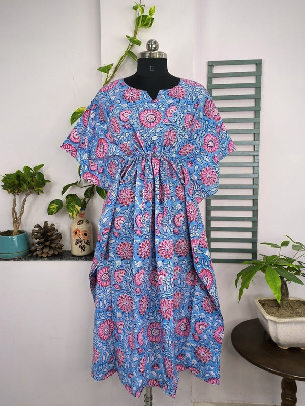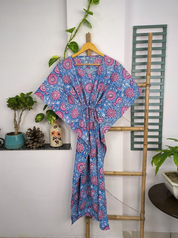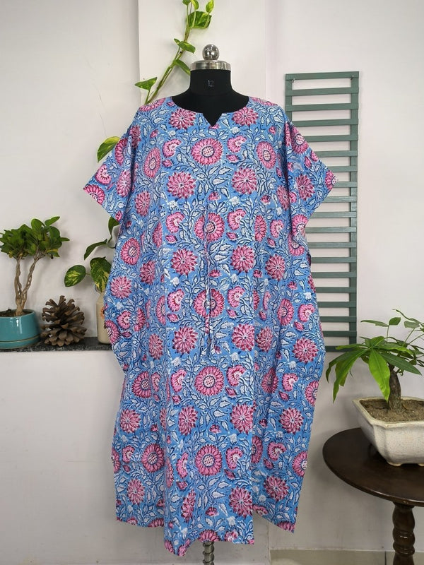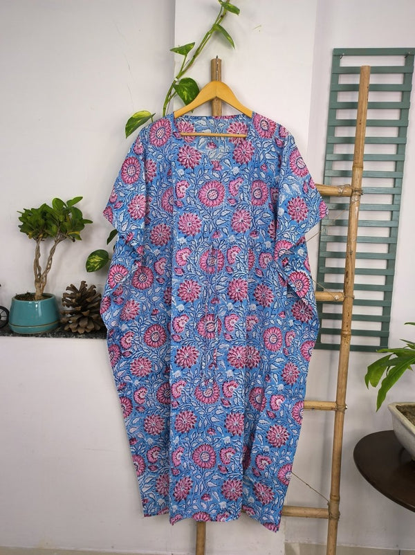 Boho Style Kaftan Dress | Indian Handprinted Blue Pink Sunflower Gardenia| Breathable Lightweight Cotton Fabric Comfortable Chic Summer Look