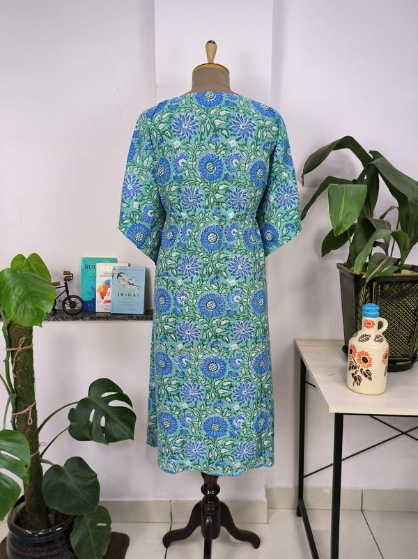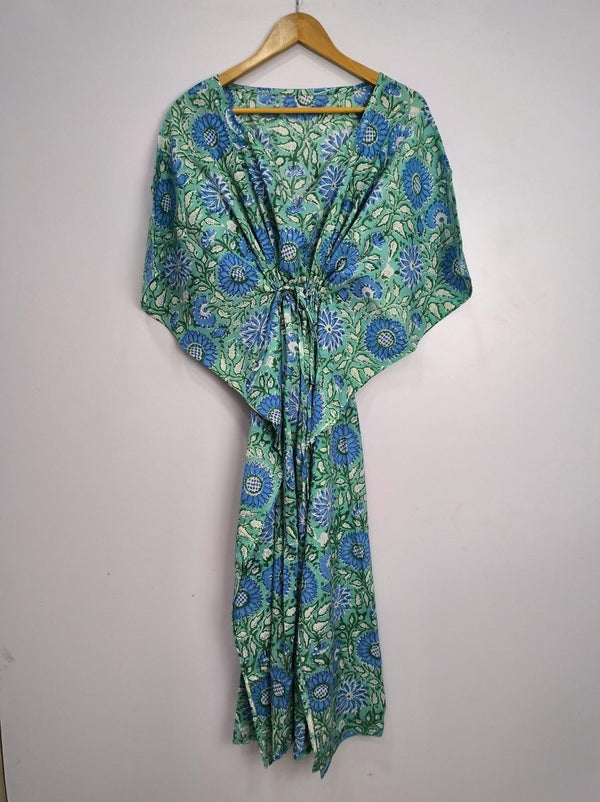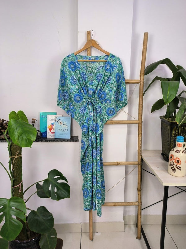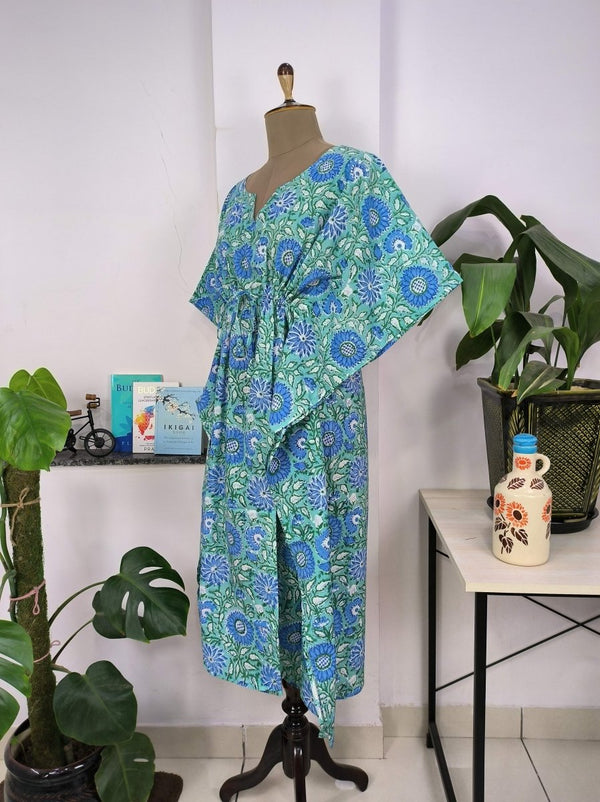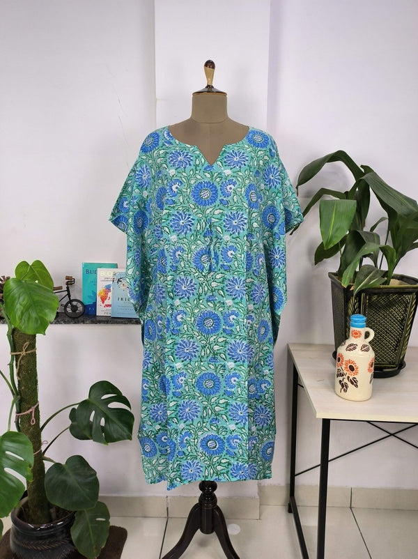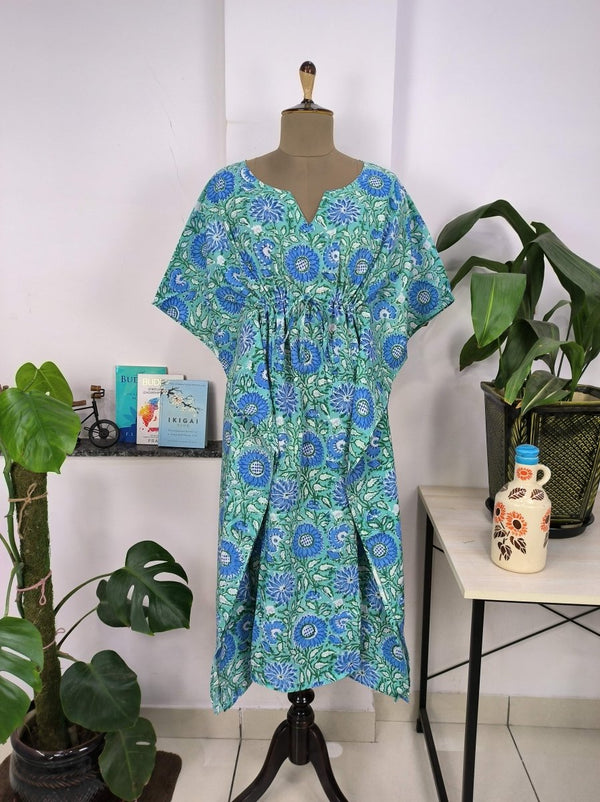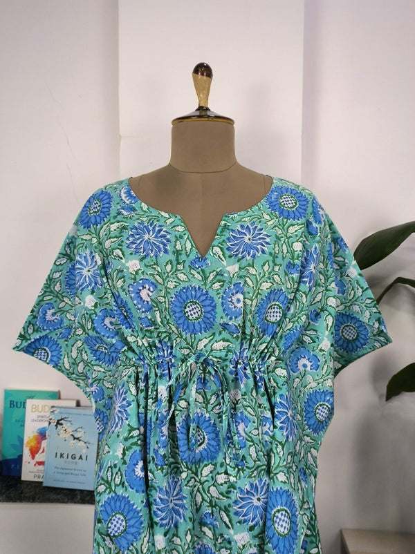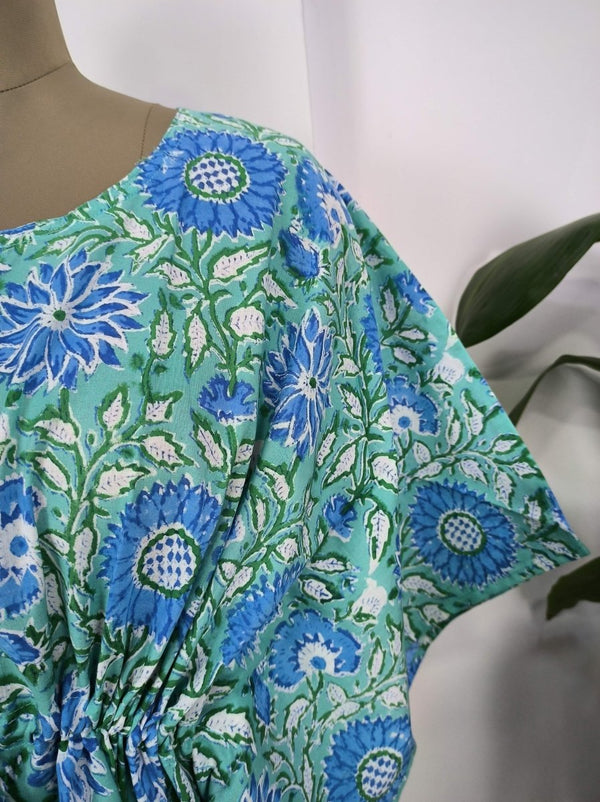 Boho Style Kaftan Dress | Indian Handprinted Sea Green Blue Sun Floral | Breathable Lightweight Cotton Fabric, Comfortable Chic Summer Look