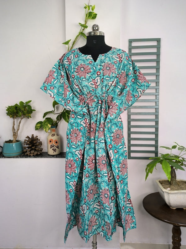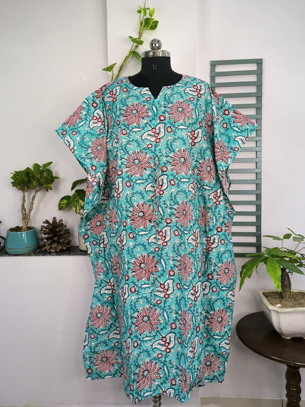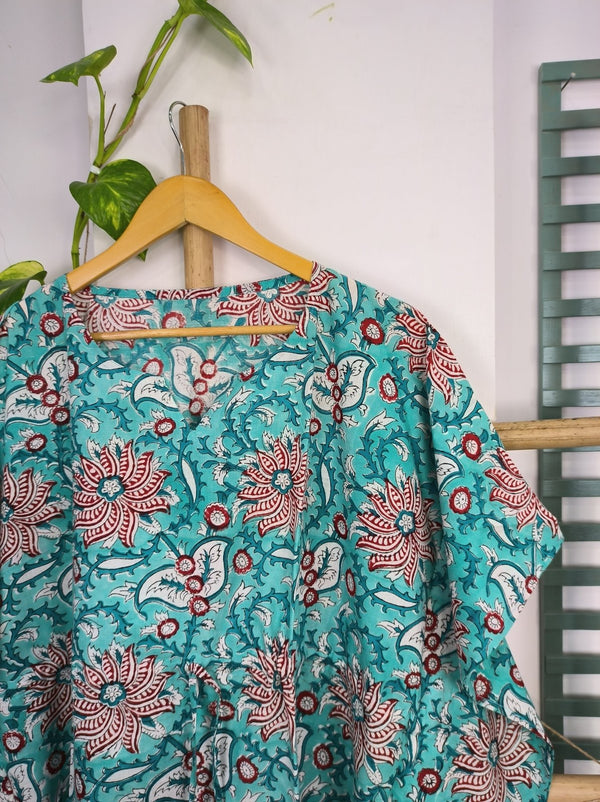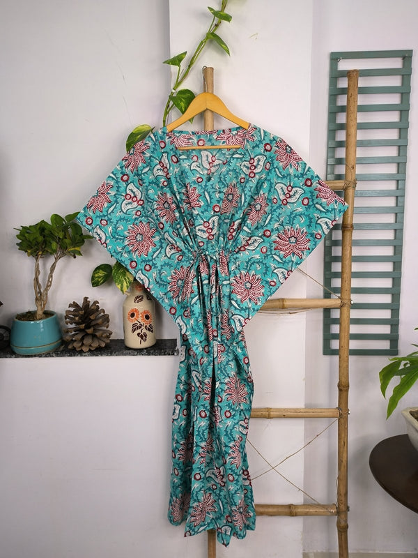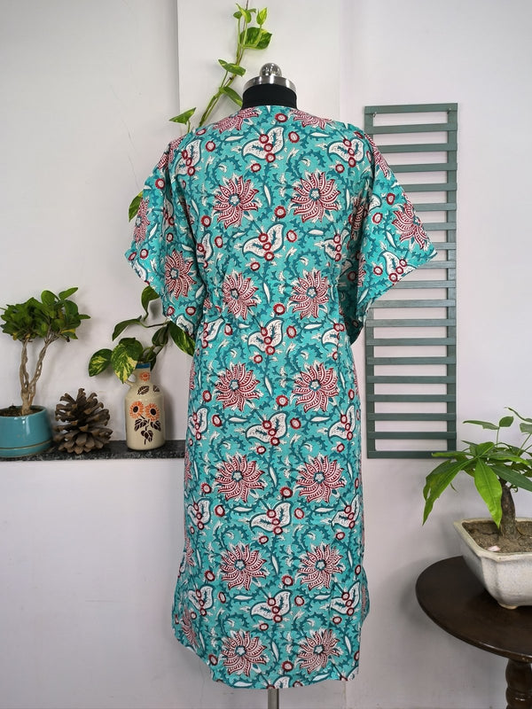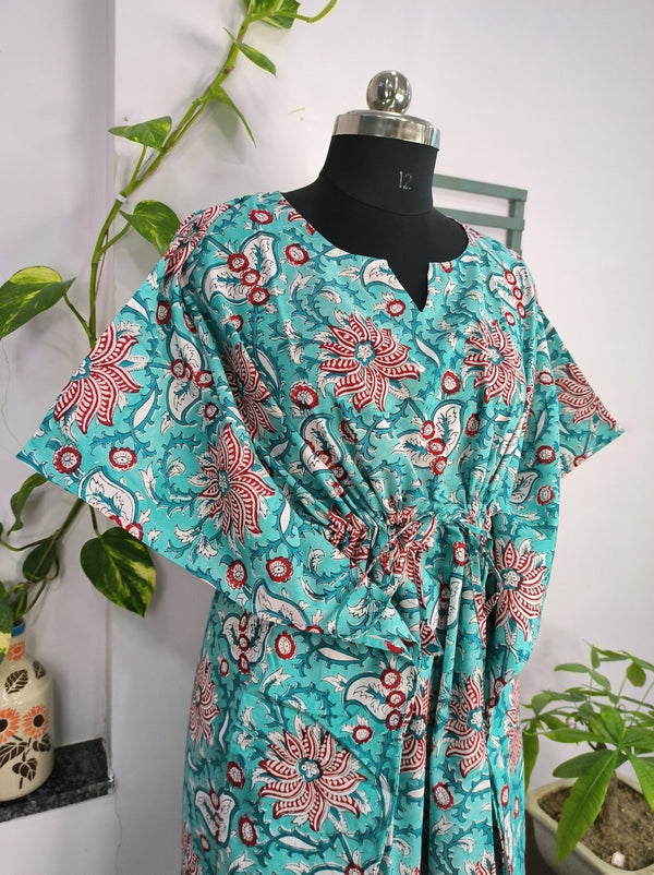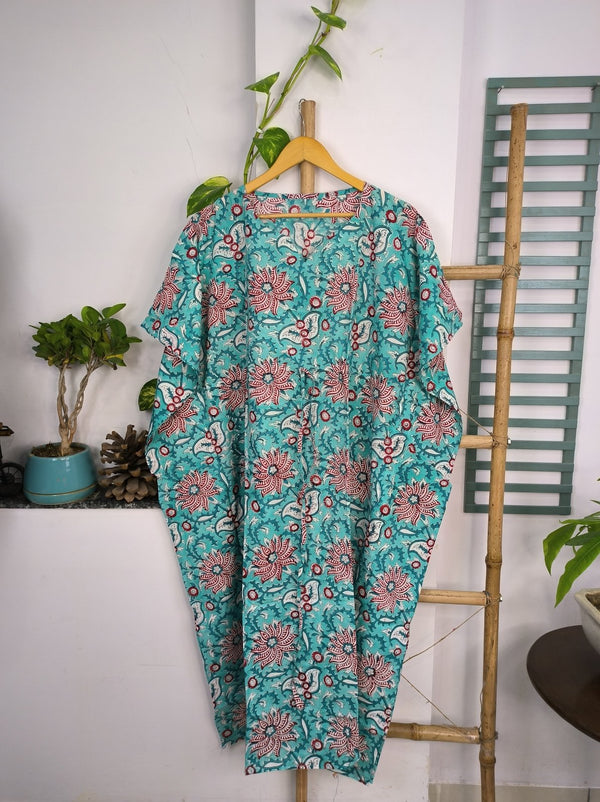 Boho Style Kaftan Dress | Indian Handprinted with Monte Carlo Lotus Bloom | Breathable Lightweight Cotton Fabric, Comfortable, Chic Summer Look