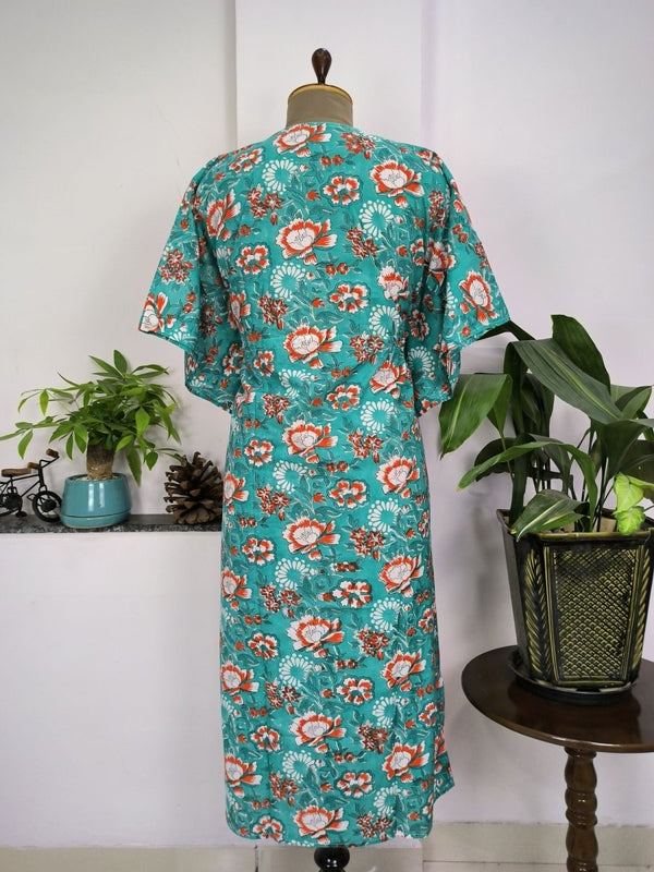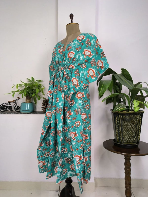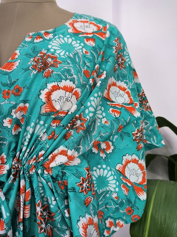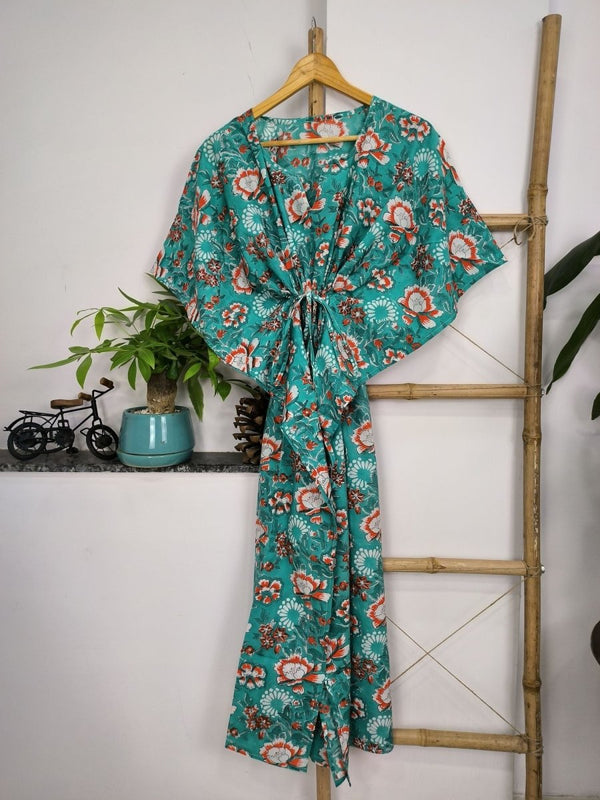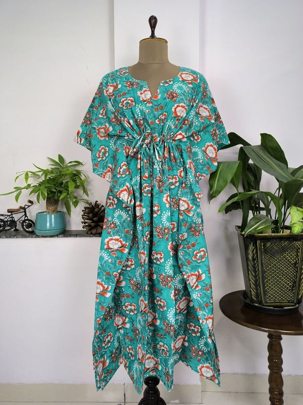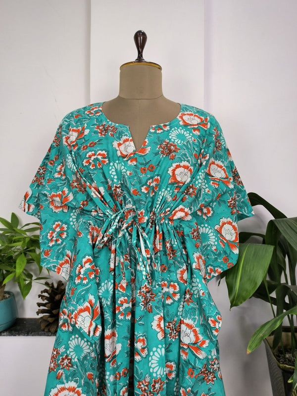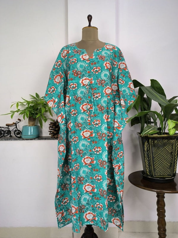 Pure Cotton Kaftan Summer Wear Indian Block Printed Floral Beach Coverup, Comfy Maternity Mom | Blue Hues Garden Floral For Her