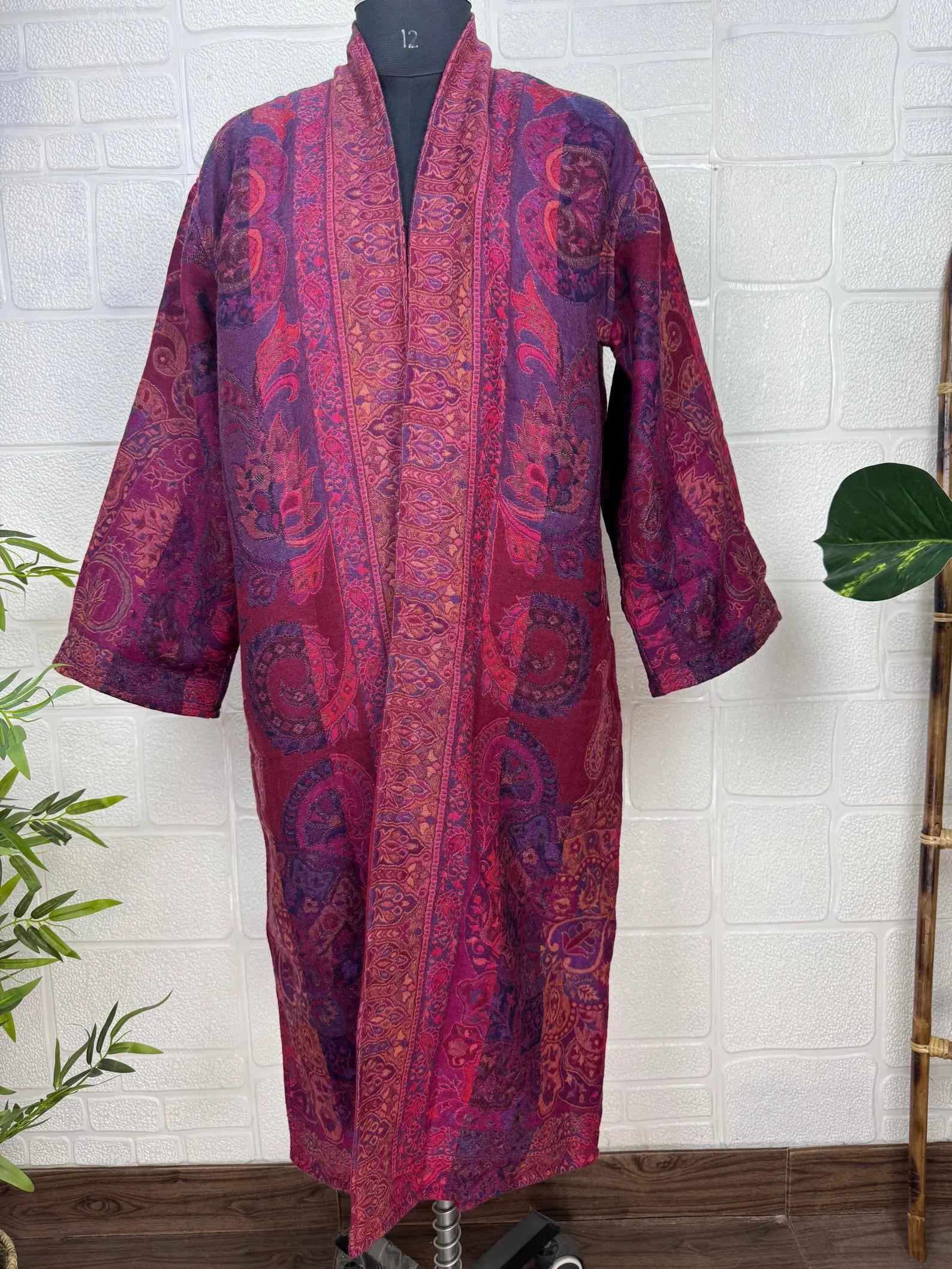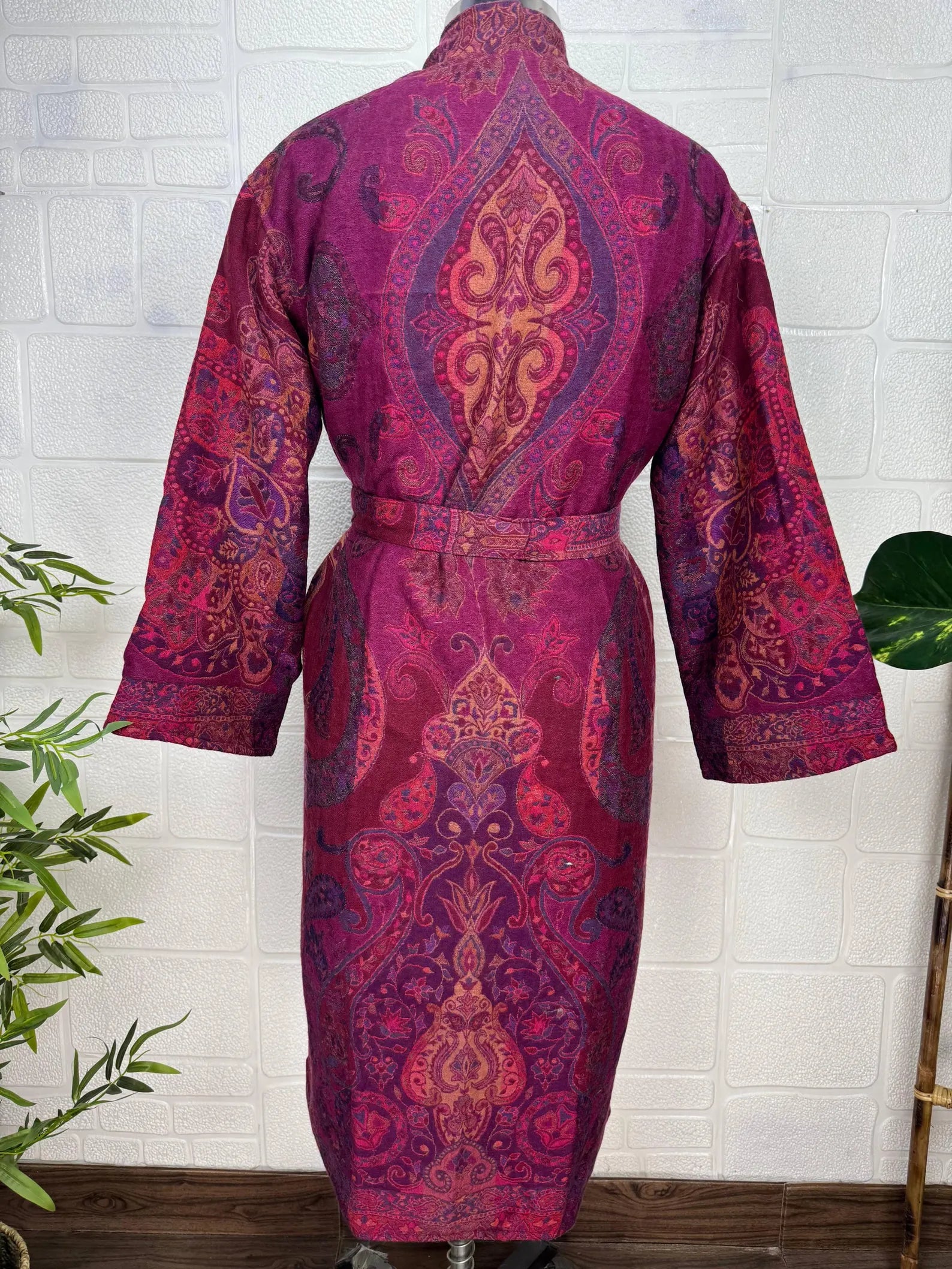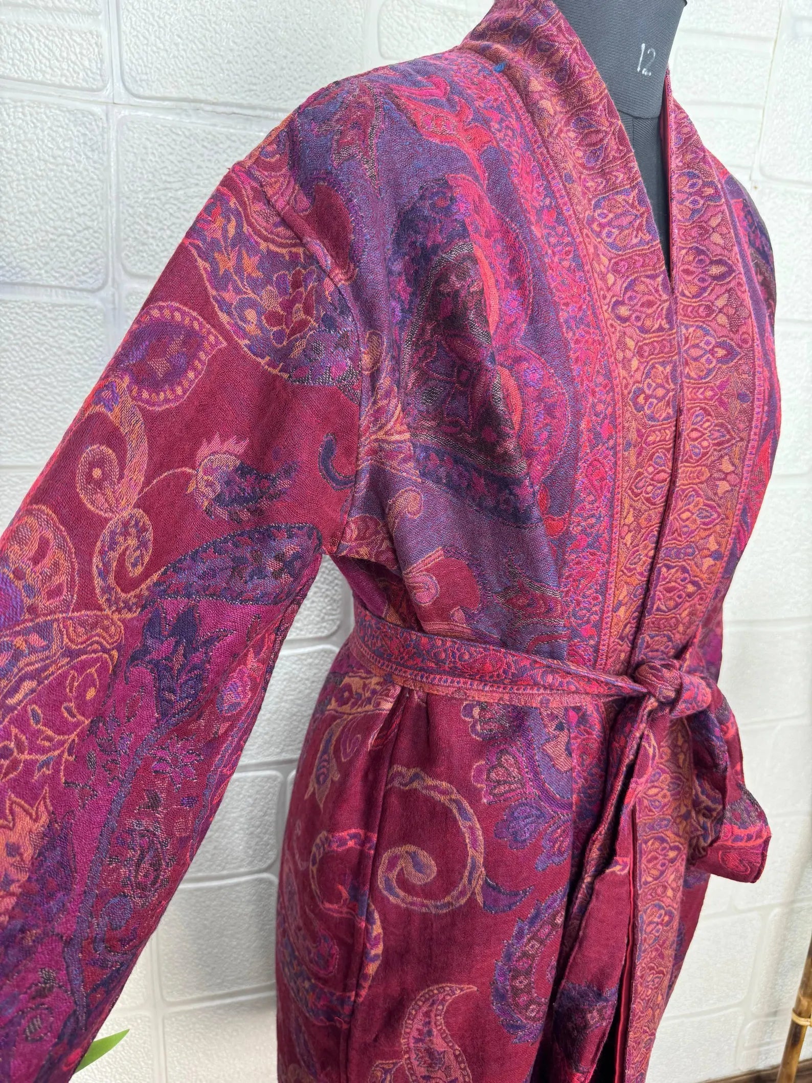Luxurious Paisley Design Open Jacket Robe, crafted from gorgeous Boiled Merino wool. This piece is designed to provide warmth and elegance, lined on the inside for extra coziness, yet remaining light and comfortable.
