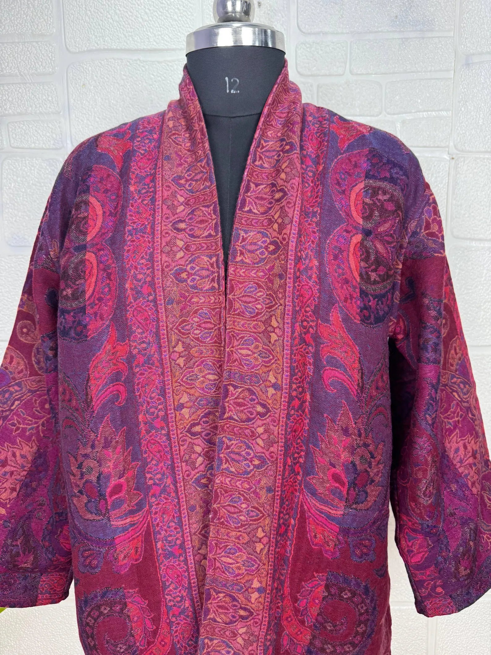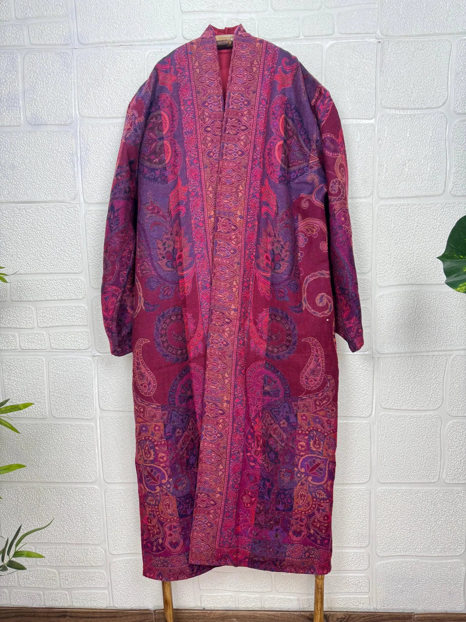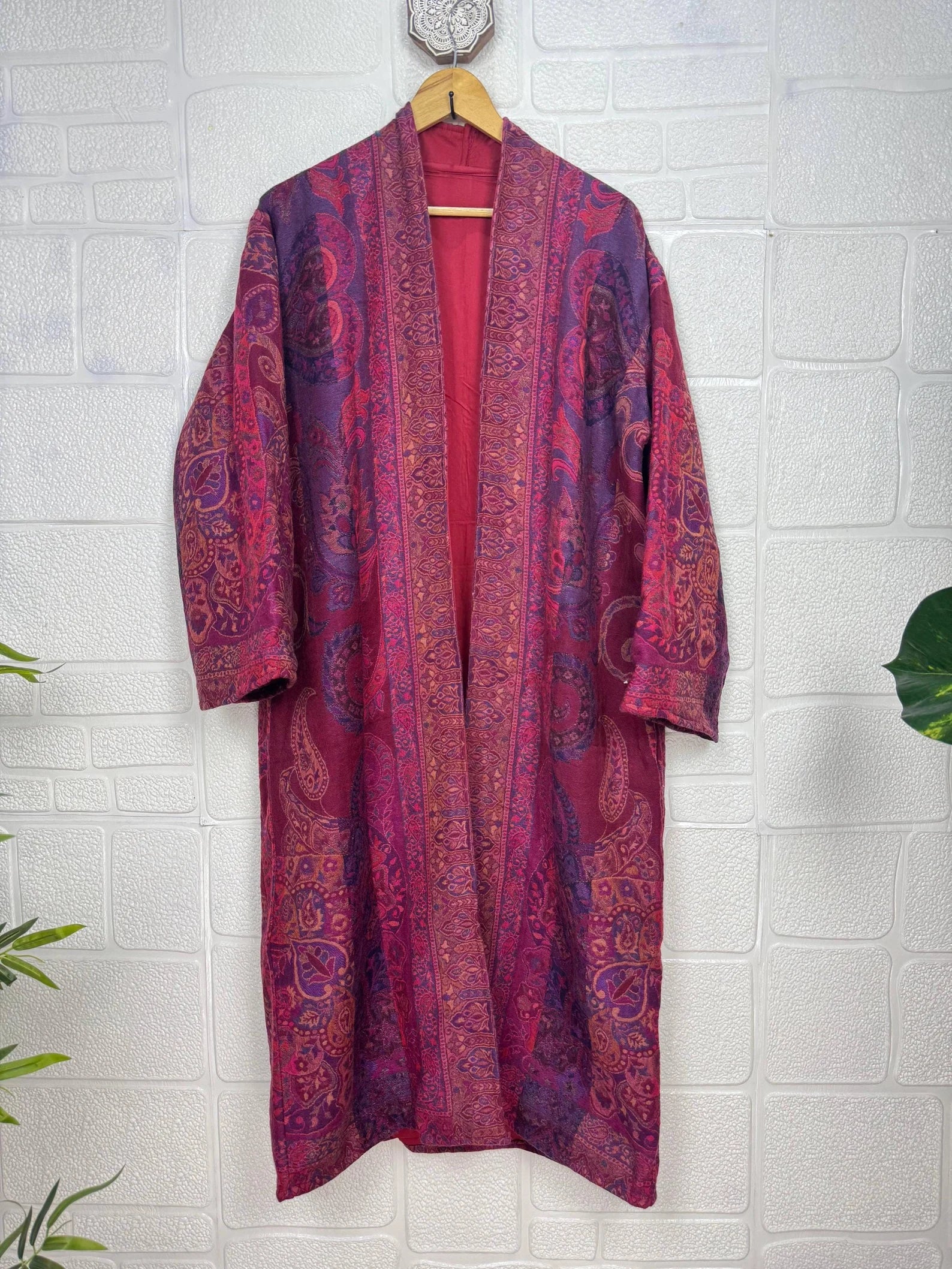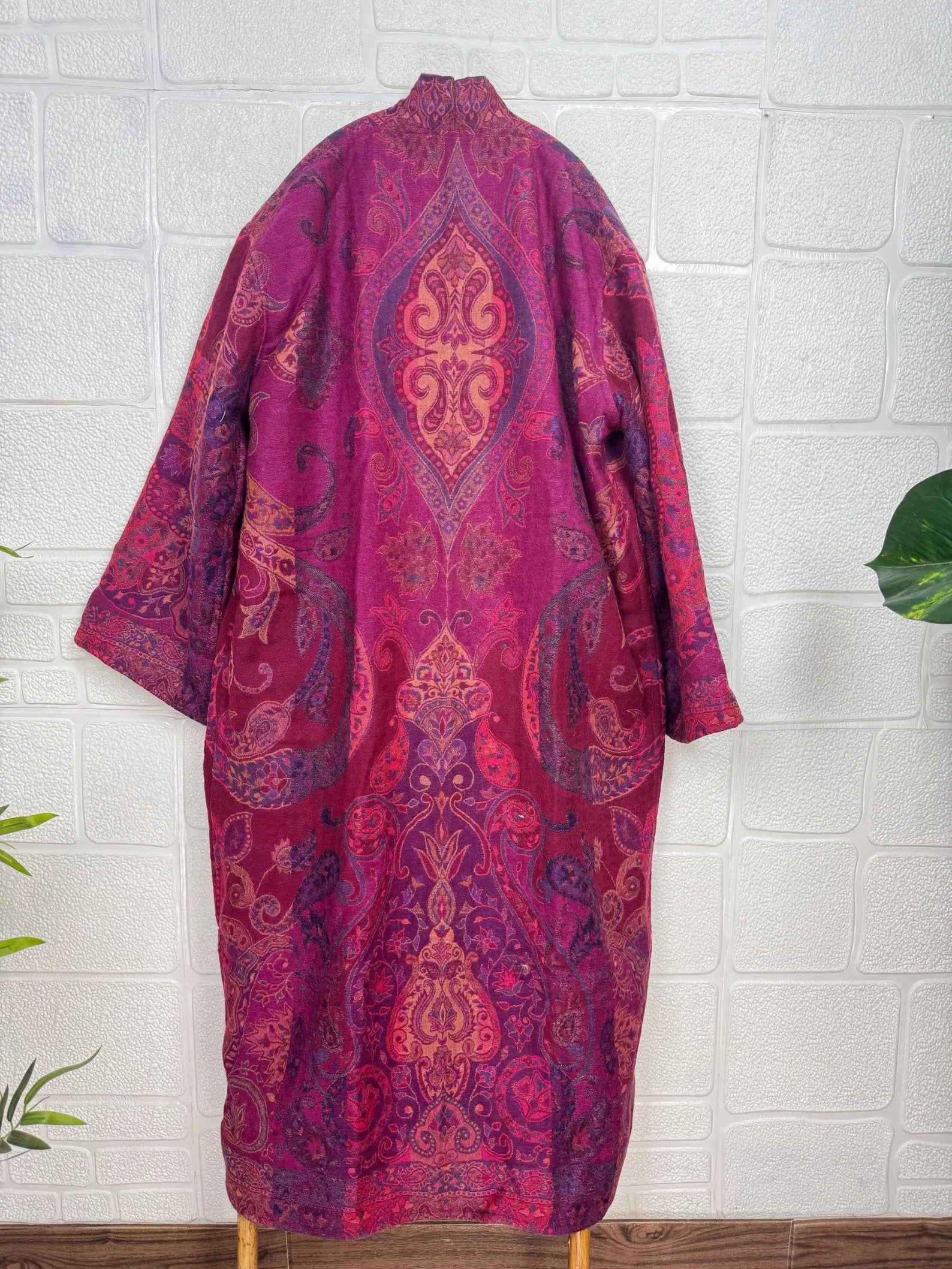 Luxurious Paisley Design Open Jacket Robe, crafted from gorgeous Boiled Merino wool. This piece is designed to provide warmth and elegance, lined on the inside for extra coziness, yet remaining light and comfortable.
