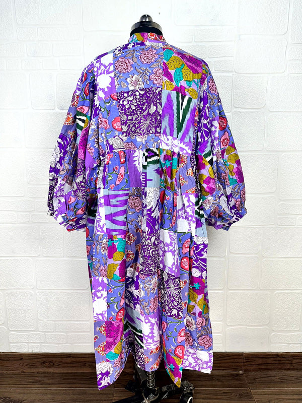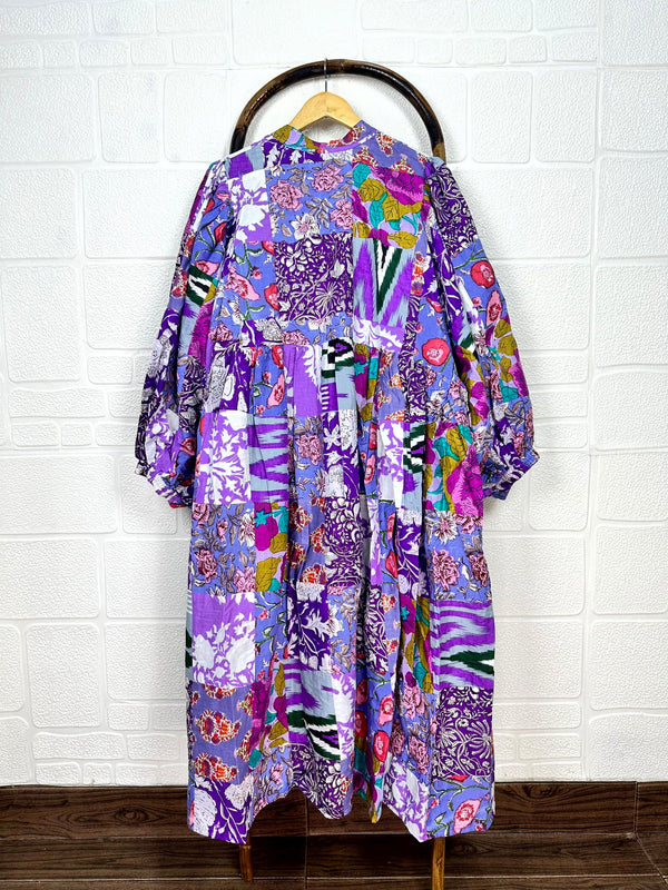 Dies ist ein handgenähtes Patchwork-Kleid, daher weist jedes Stück eine leichte Variation der Flicken auf, die Farbtöne sind jedoch ähnlich.