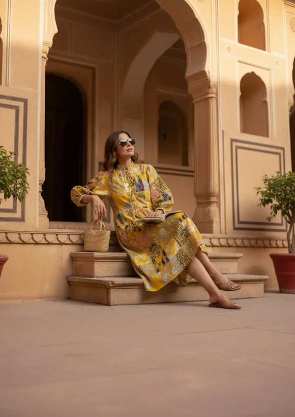 Beautiful Handprints made in small villages of Rajasthan using wooden blocks and natural dyes turned into gorgeous Dress.