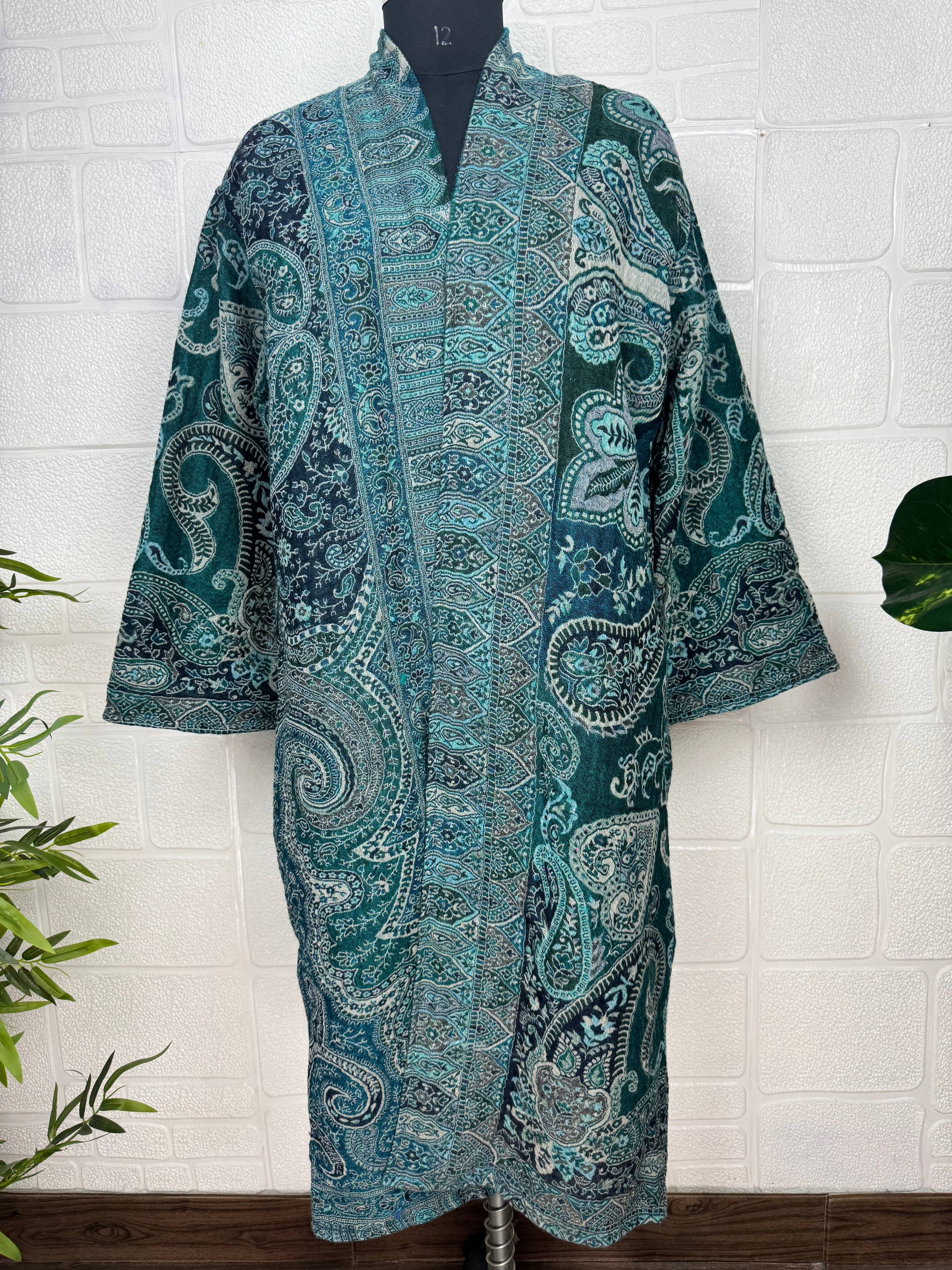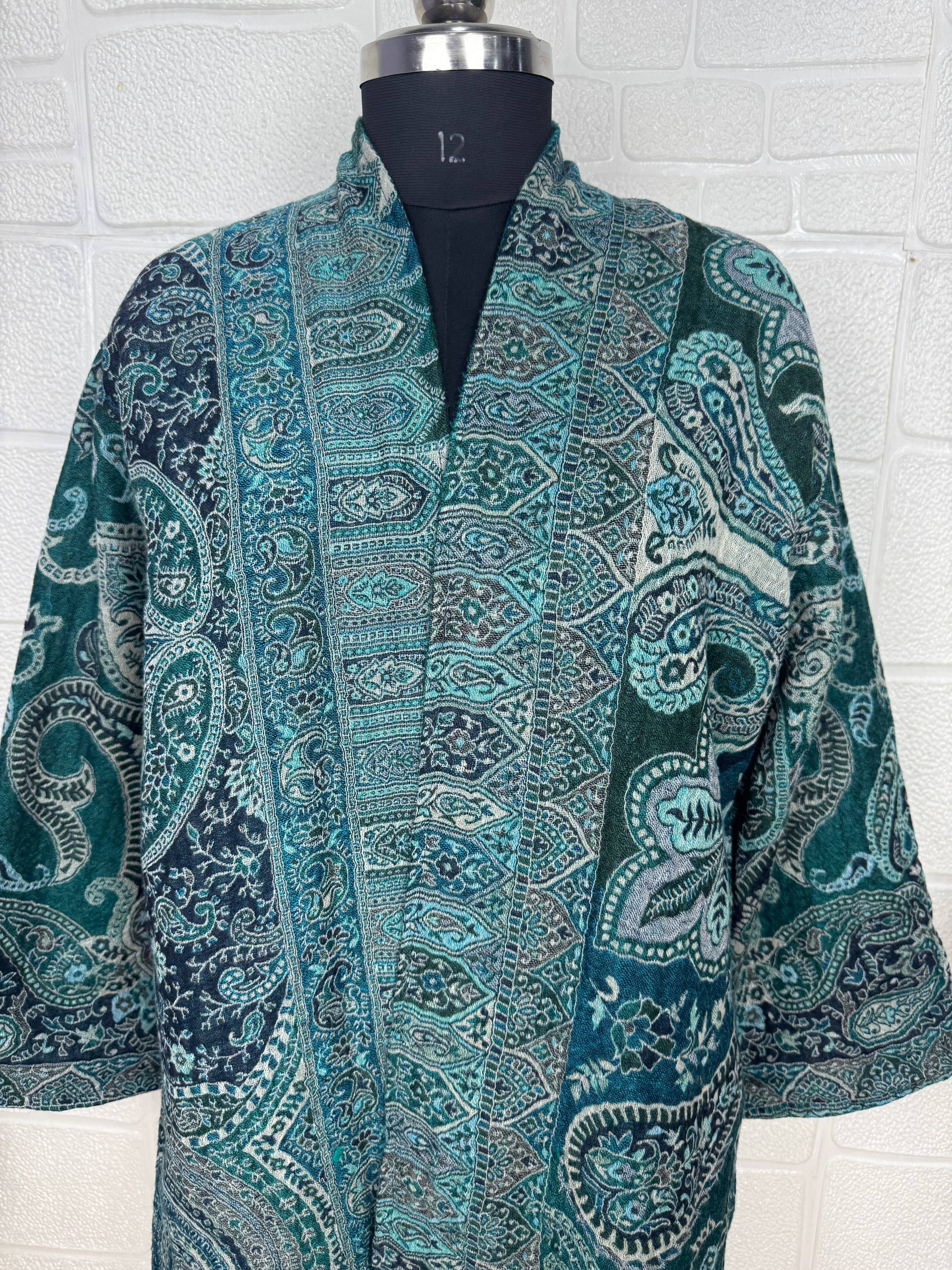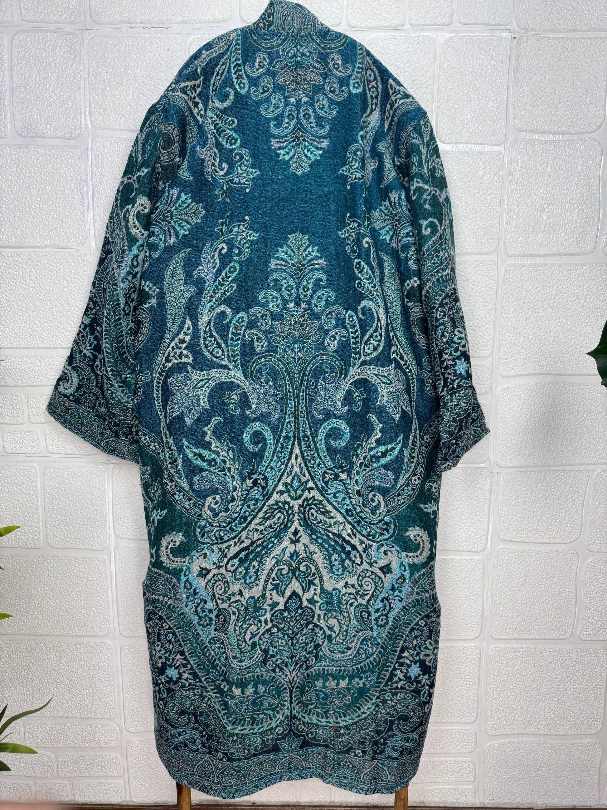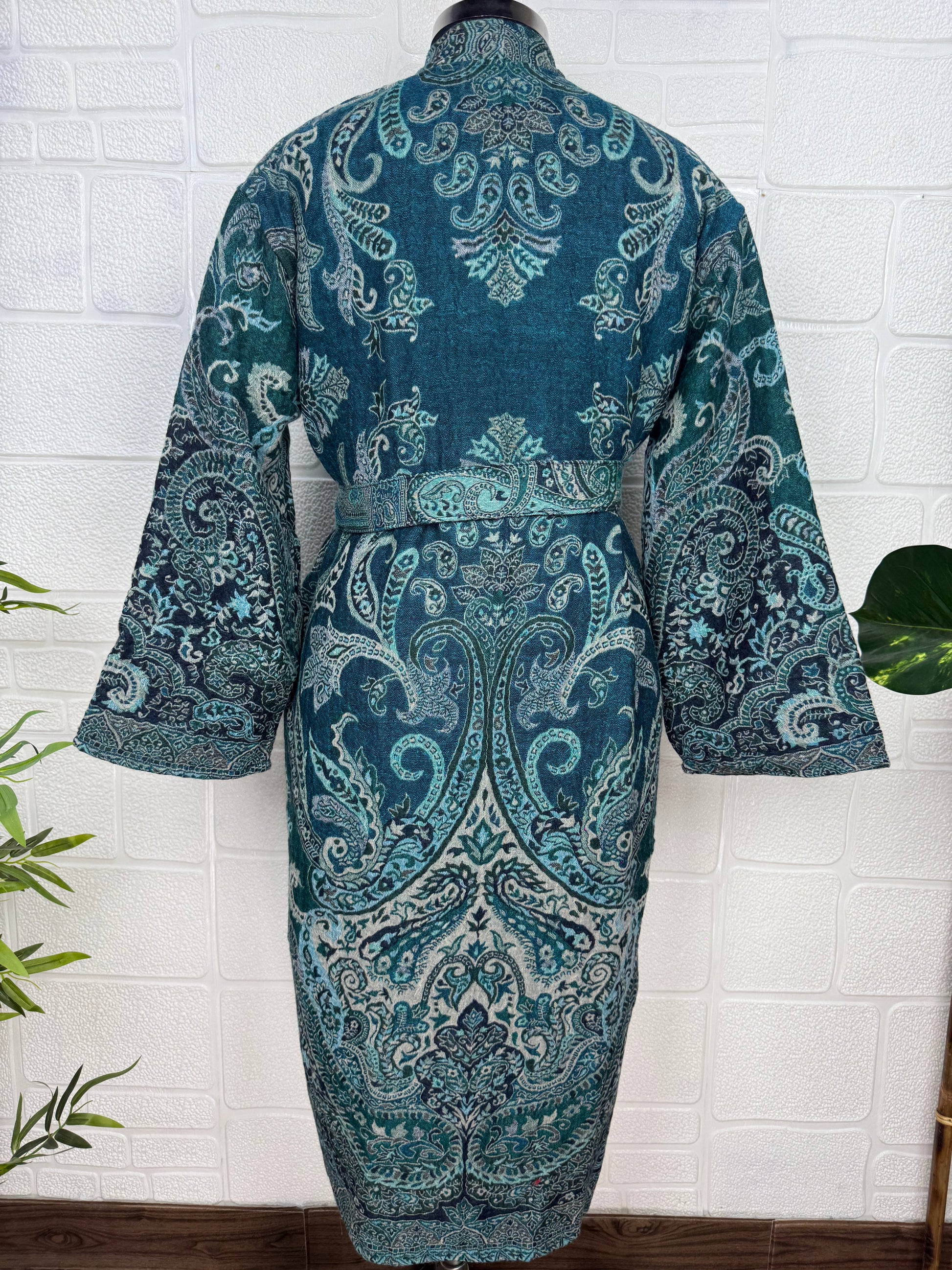 Luxurious Paisley Design Open Jacket Robe, crafted from gorgeous Boiled Merino wool. This piece is designed to provide warmth and elegance, lined on the inside for extra coziness, yet remaining light and comfortable.