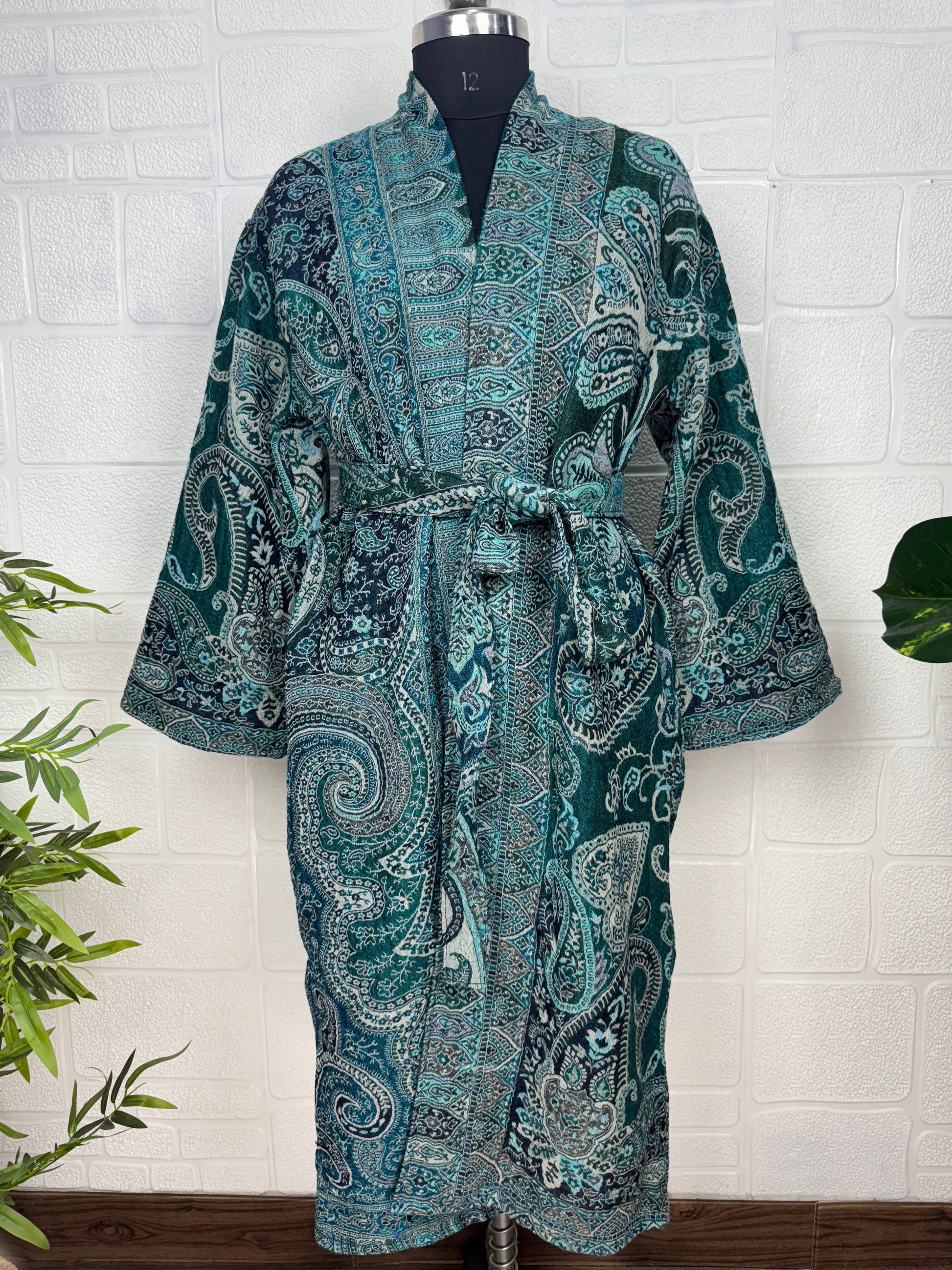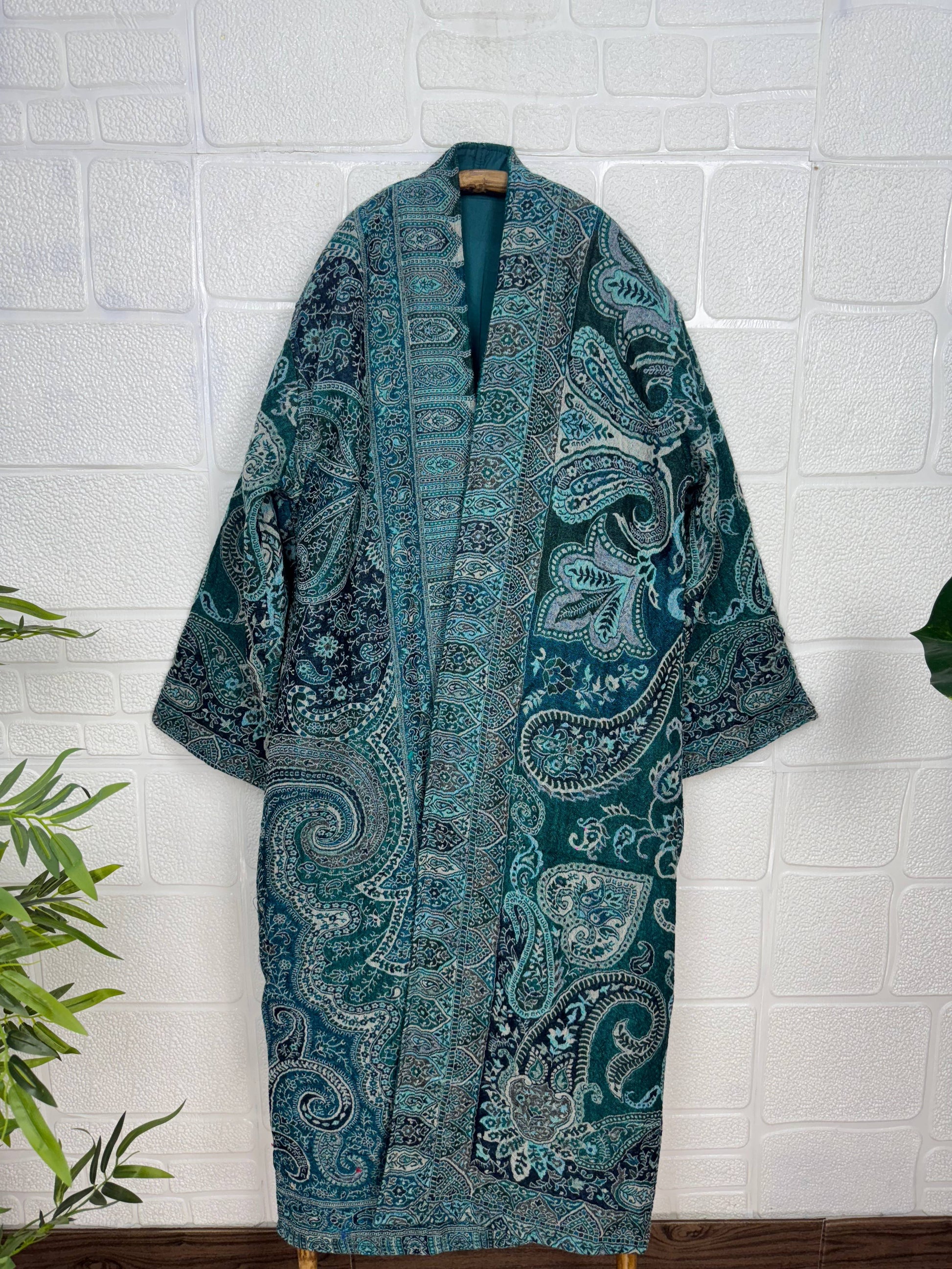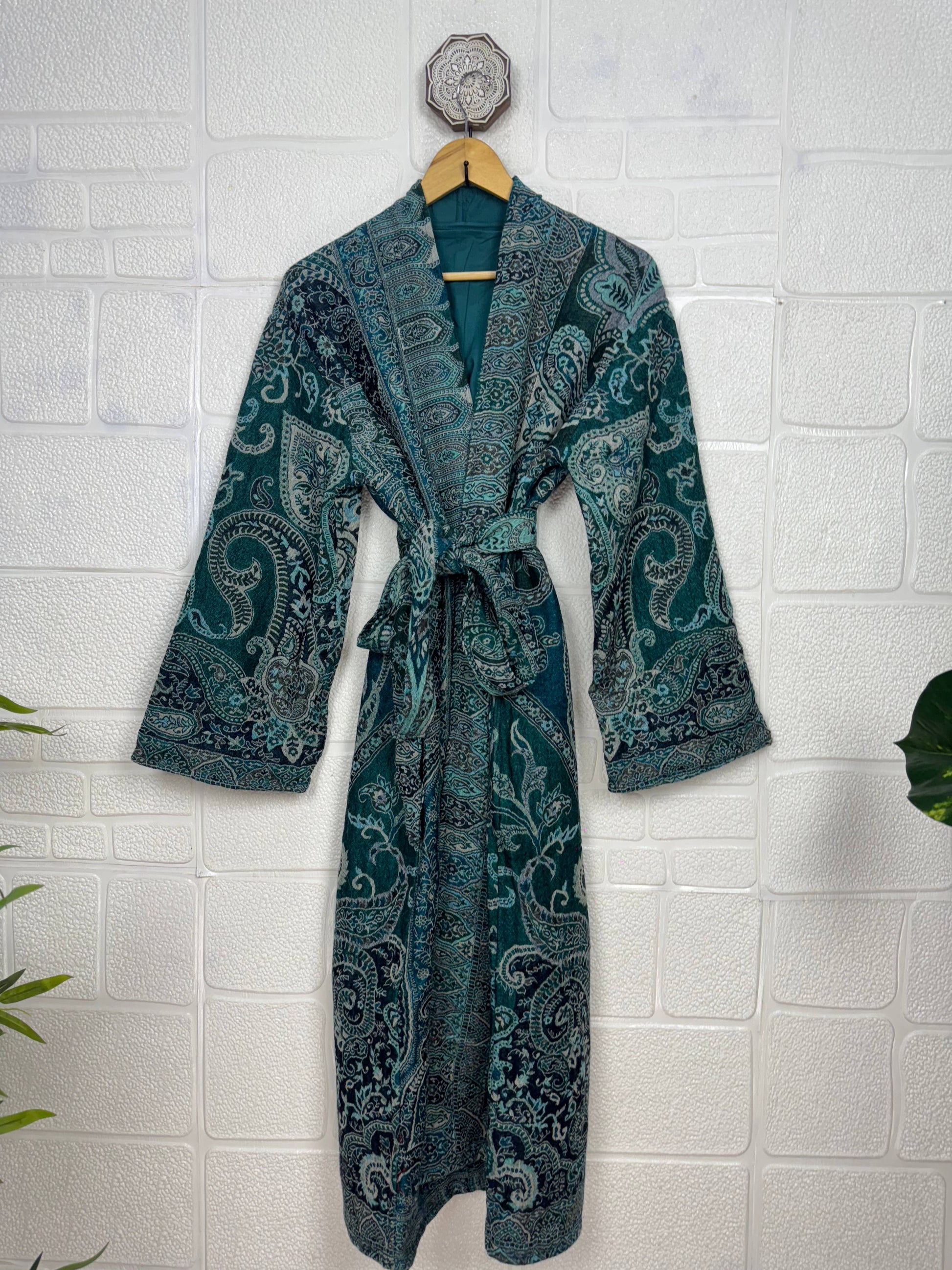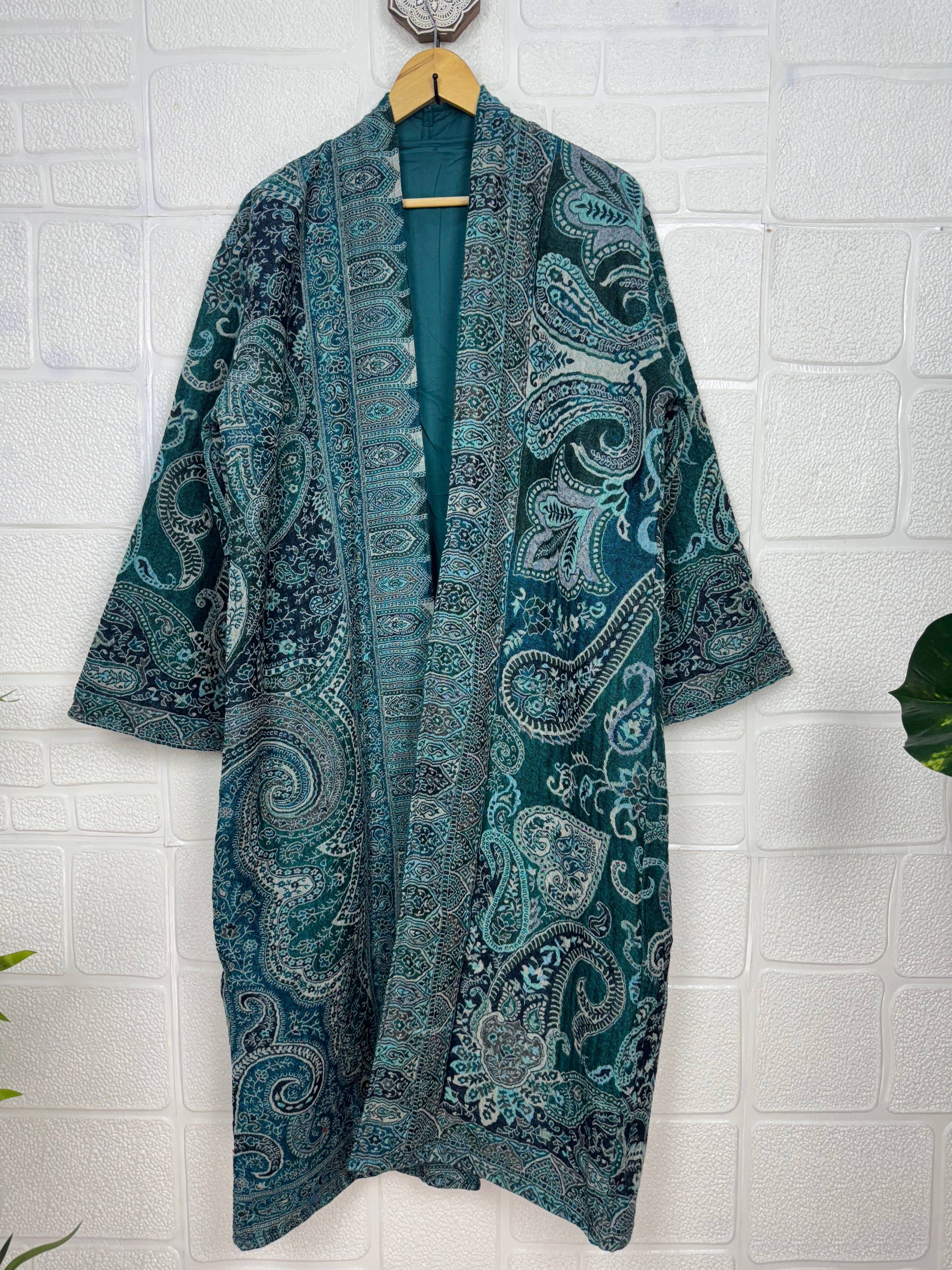 Luxurious Paisley Design Open Jacket Robe, crafted from gorgeous Boiled Merino wool. This piece is designed to provide warmth and elegance, lined on the inside for extra coziness, yet remaining light and comfortable.