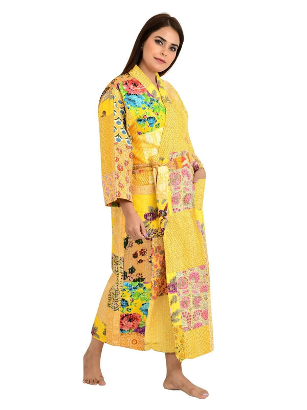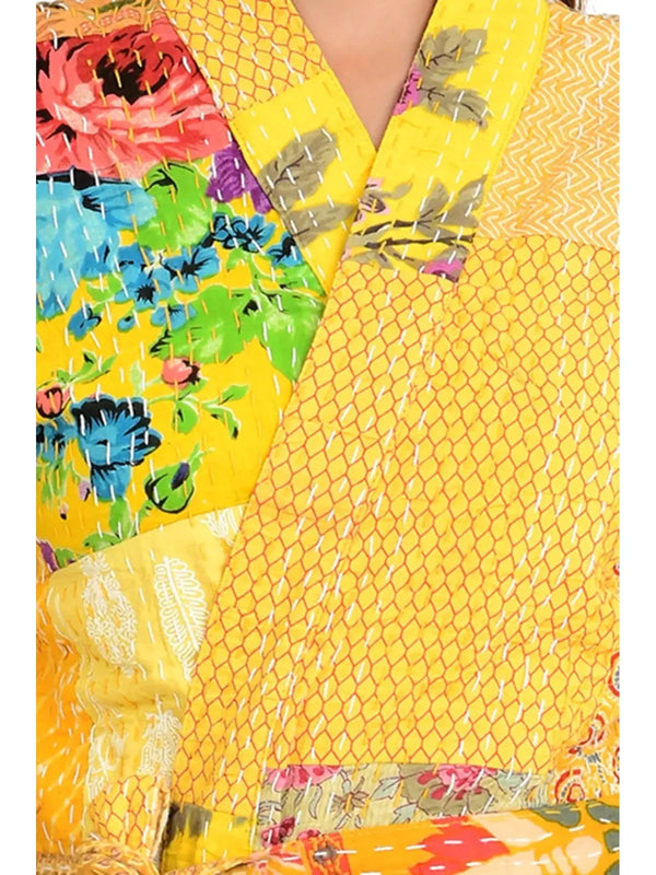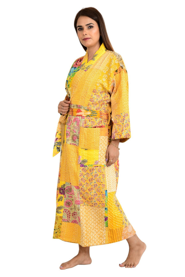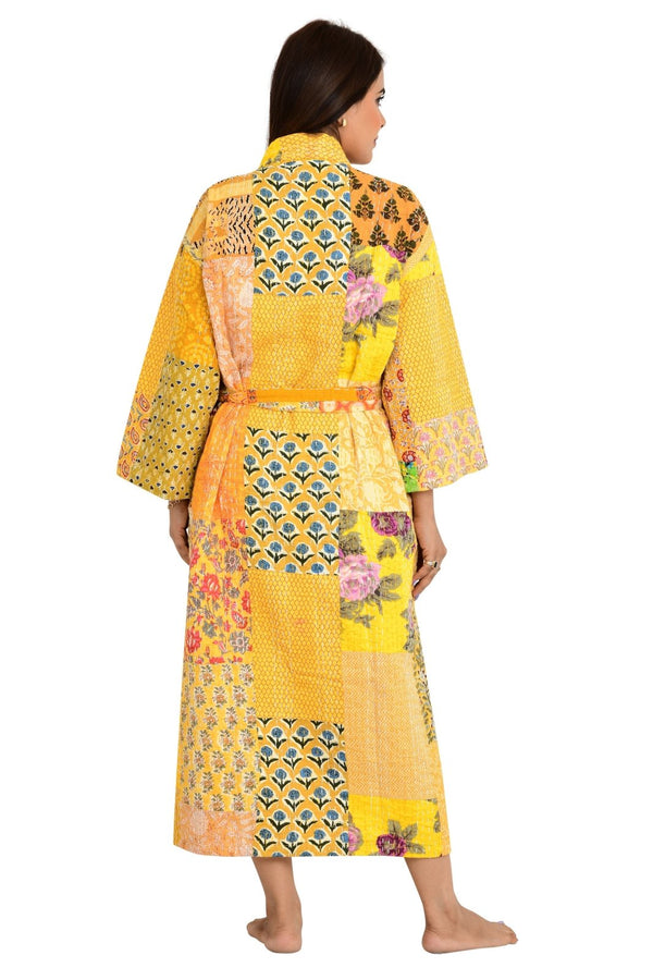 Kantha-Stich, 100 % Baumwolle, wendbar, langer Kimono für Damen | Handgemachter Maschenmantel | Unisex-Geschenk | Gelber Patchwork-Druck