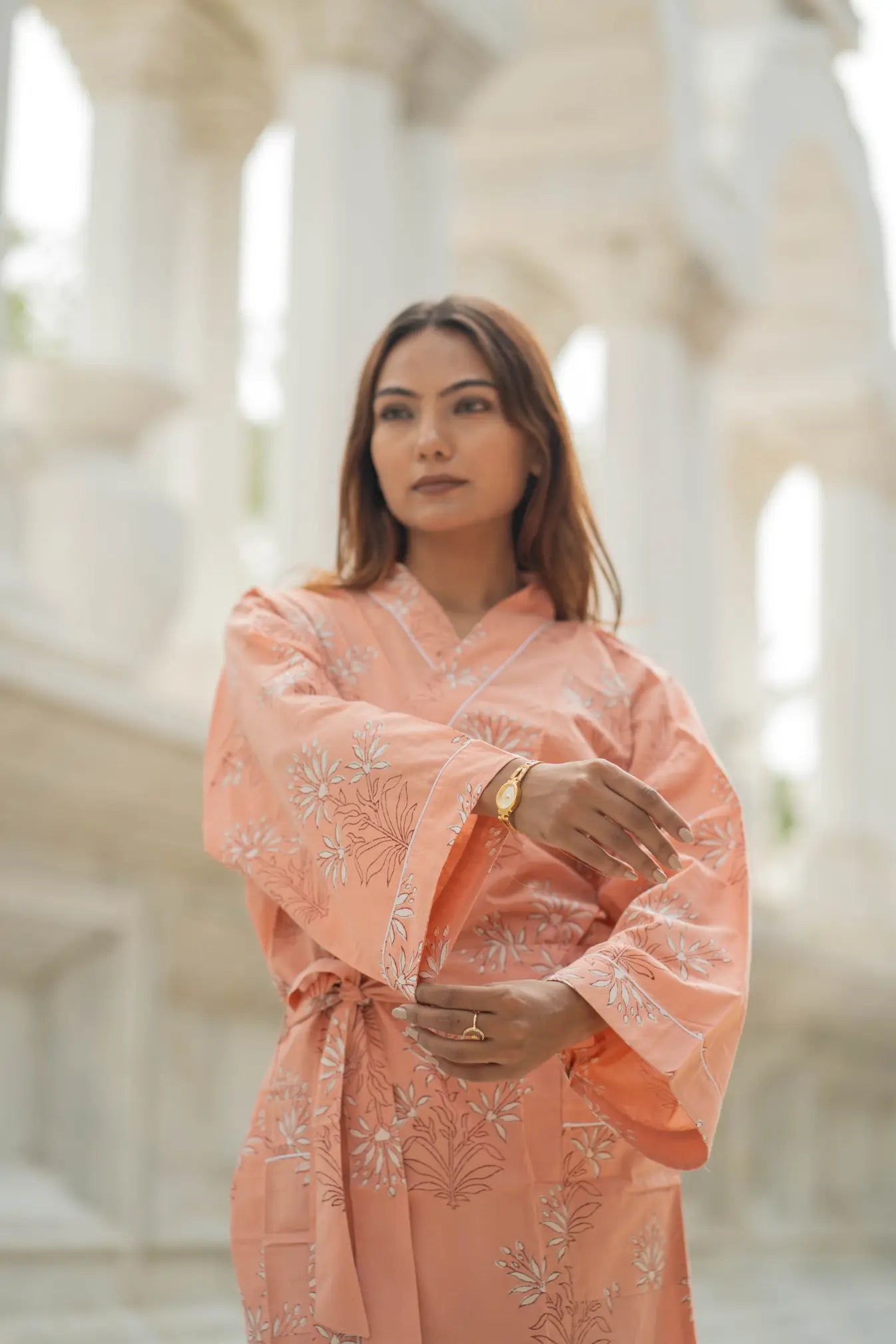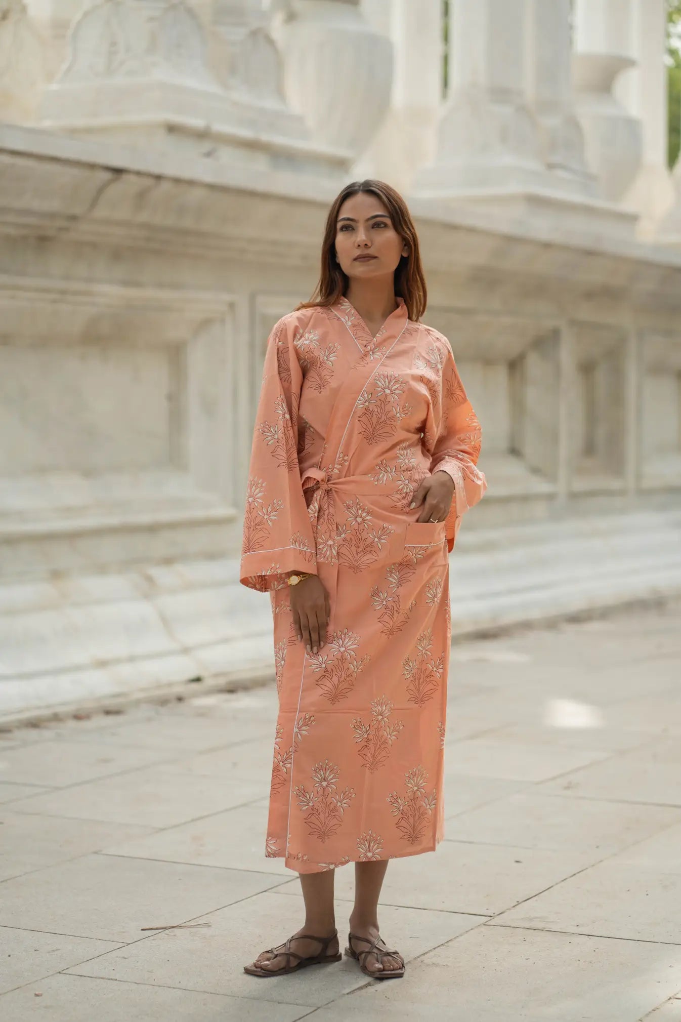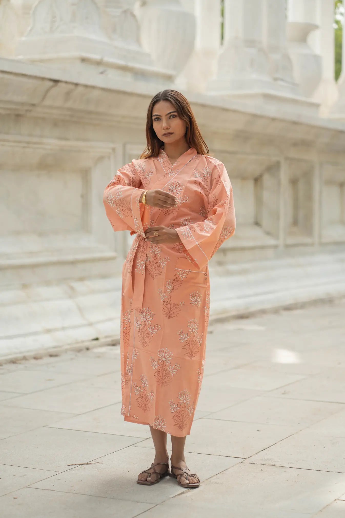 Experience the beauty of Indian artisan craftsmanship with this Luxury Cotton Kimono Robe for Women, a stunning blend of comfort, culture, and creativity. Handcrafted by female artisans in a small family-run studio in India, each robe is a true work of art — made using traditional handblock printing techniques that celebrate India’s centuries-old textile heritage.