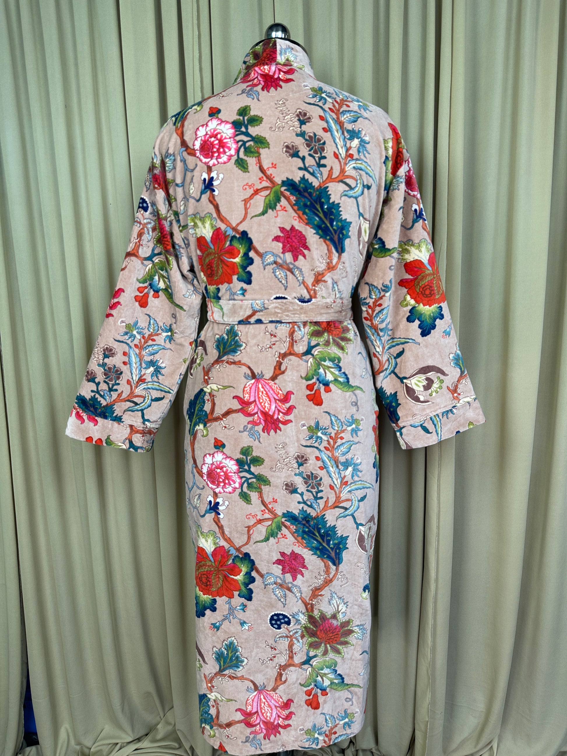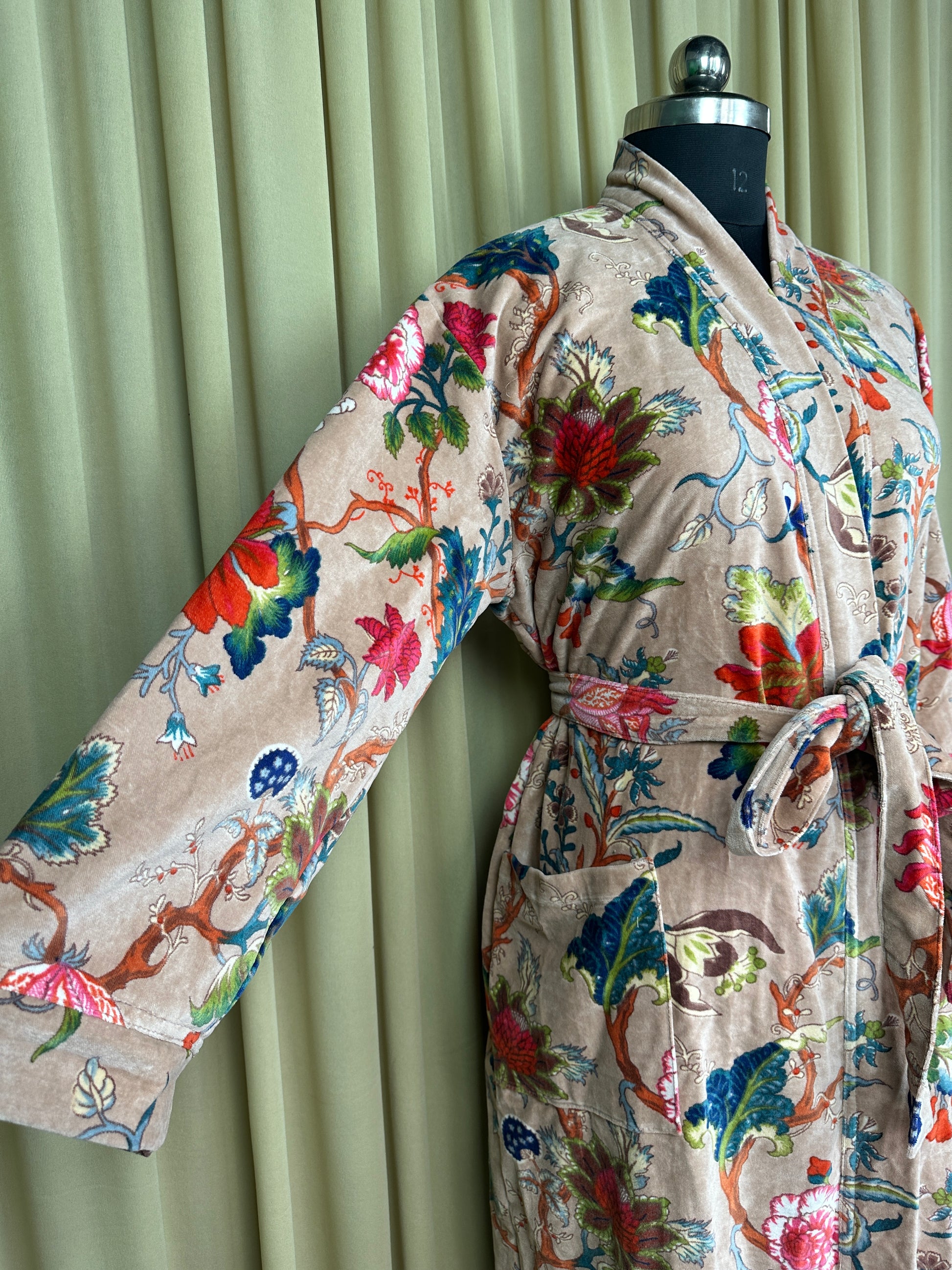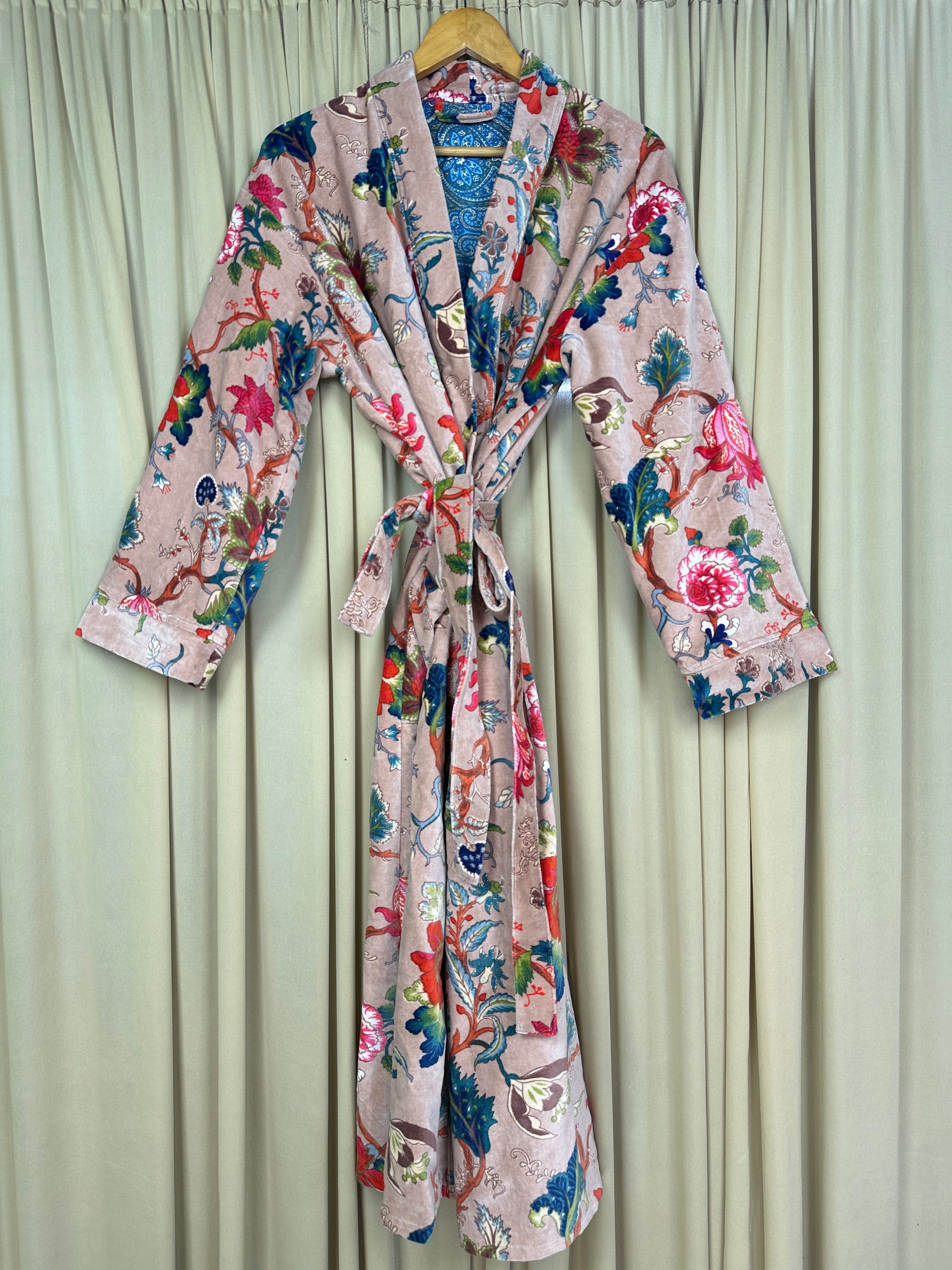 Indulge in the luscious luxury of our printed velvet robe, featuring a soft Silk lining. With its reversible design, you can choose between the stunning outer print or the comforting feel of the lining against your skin. Perfect for autumn and winter, this dressy robe is also a great choice for unpredictable cold weather.