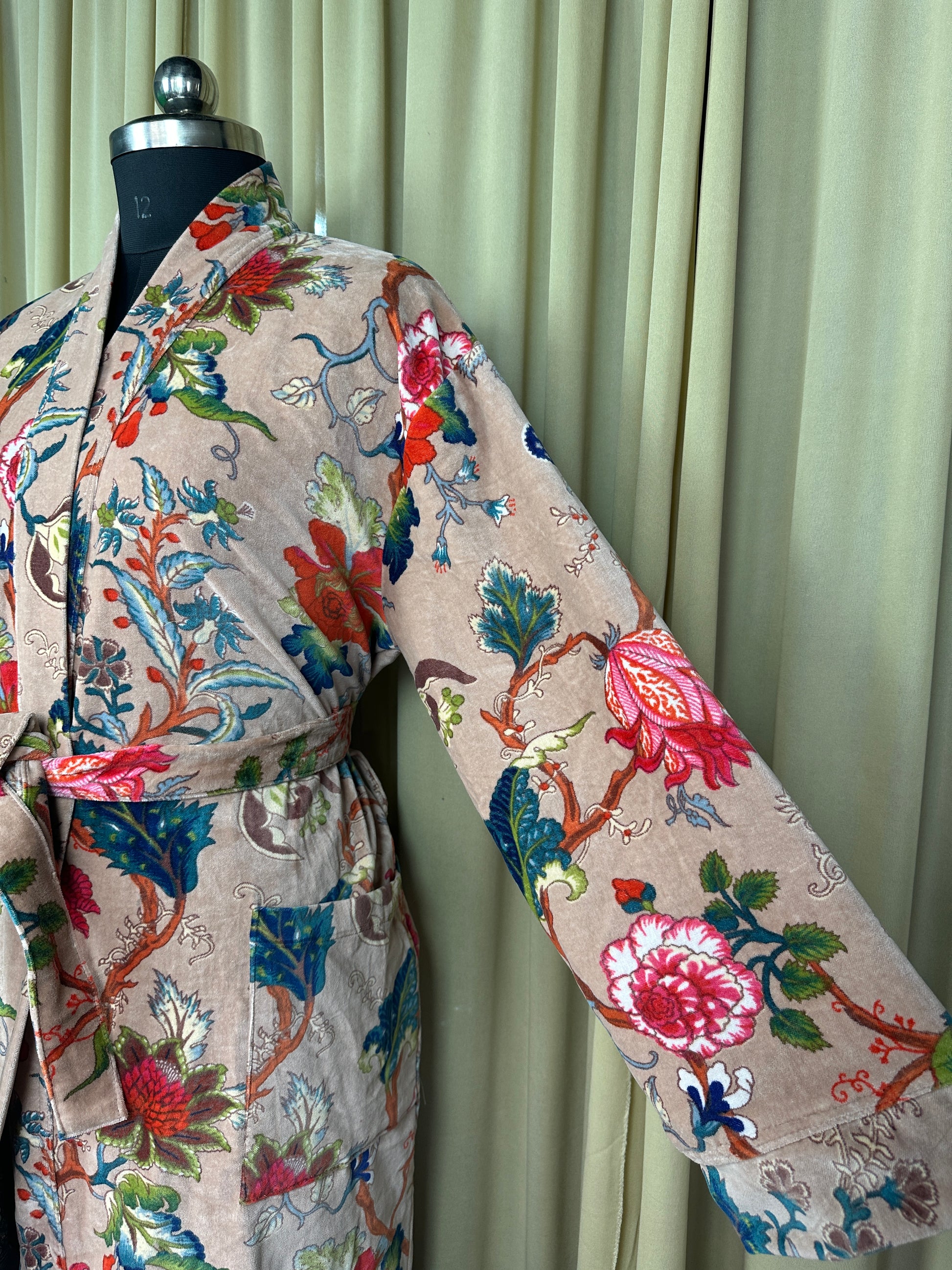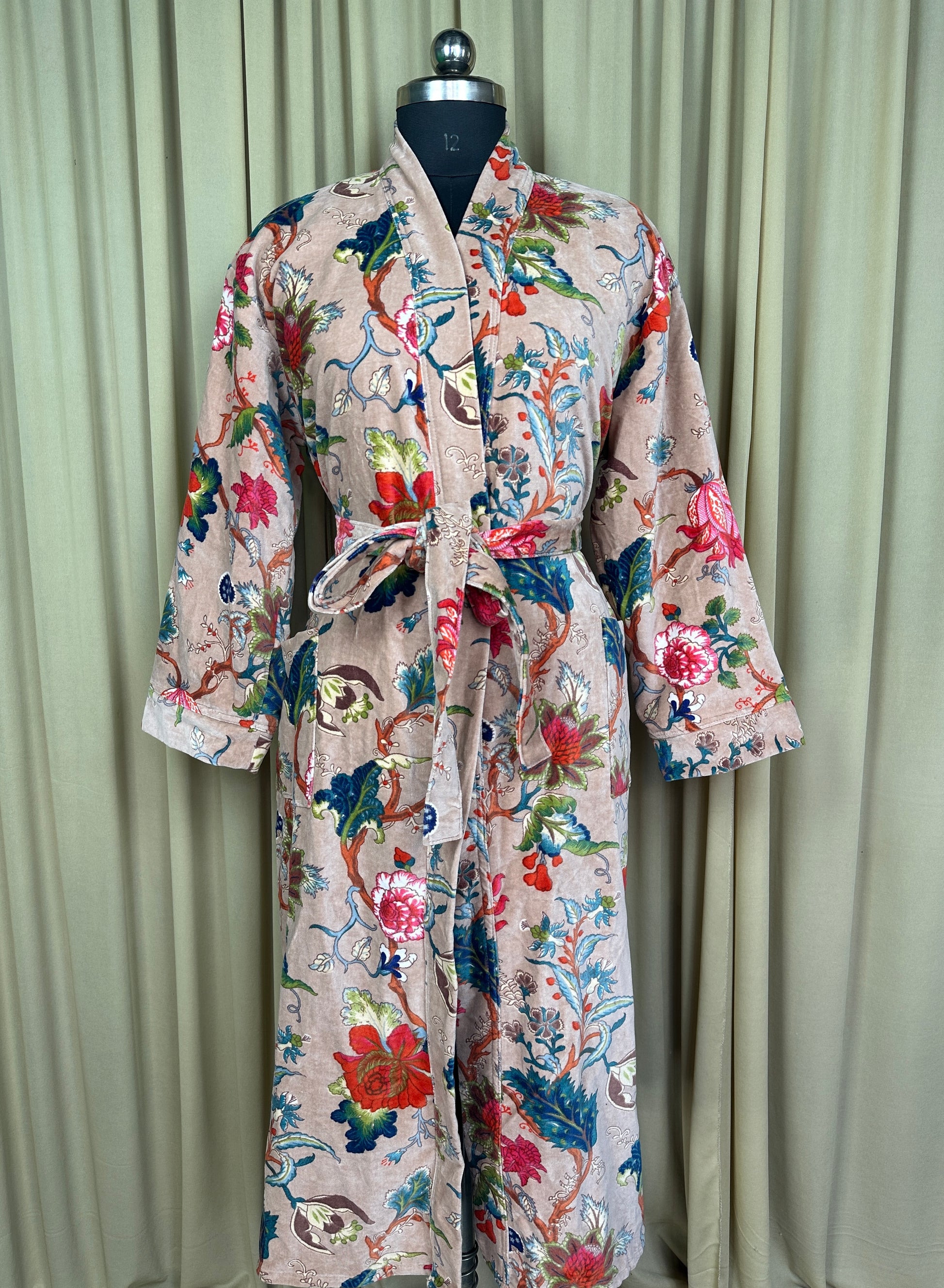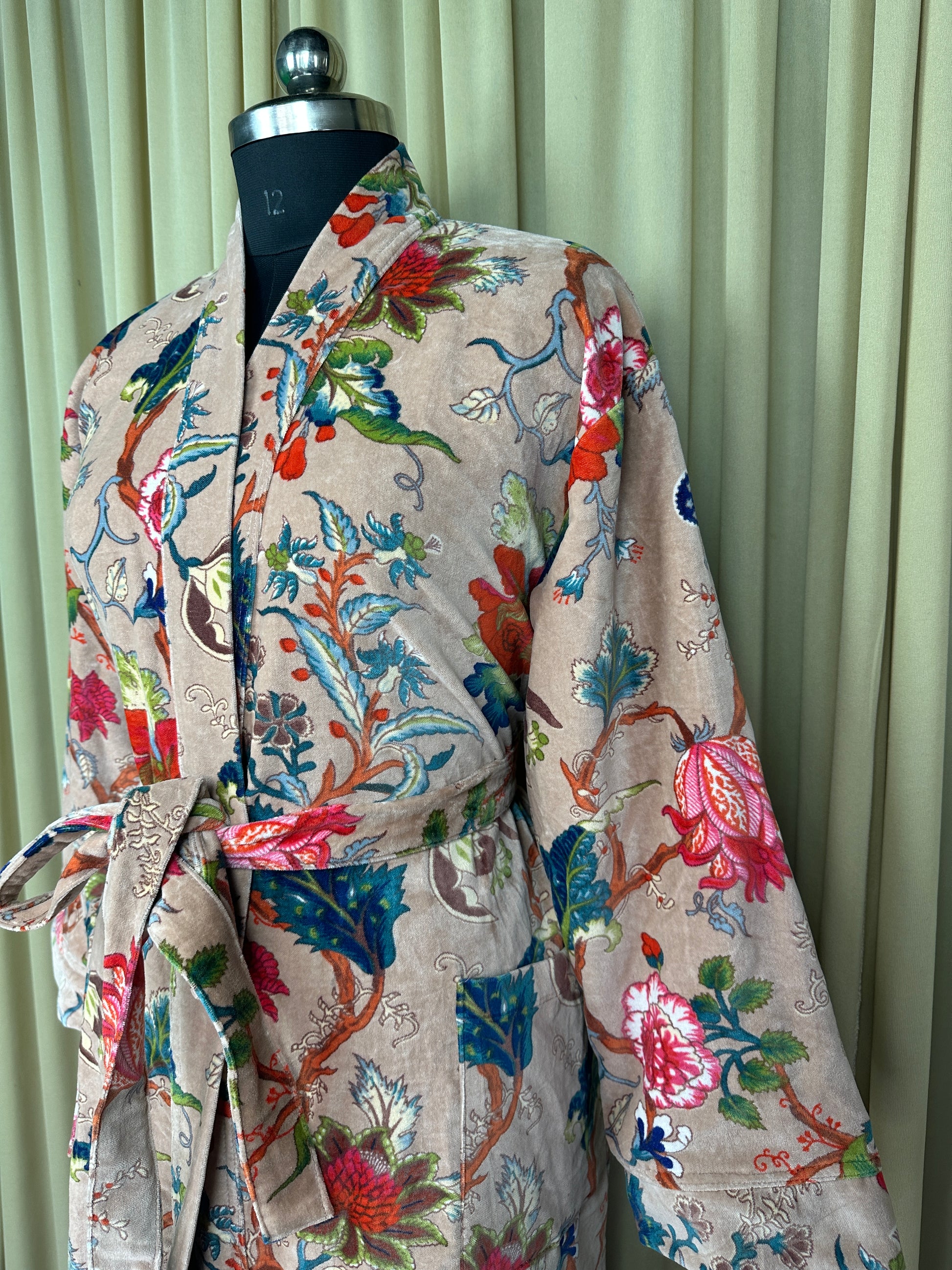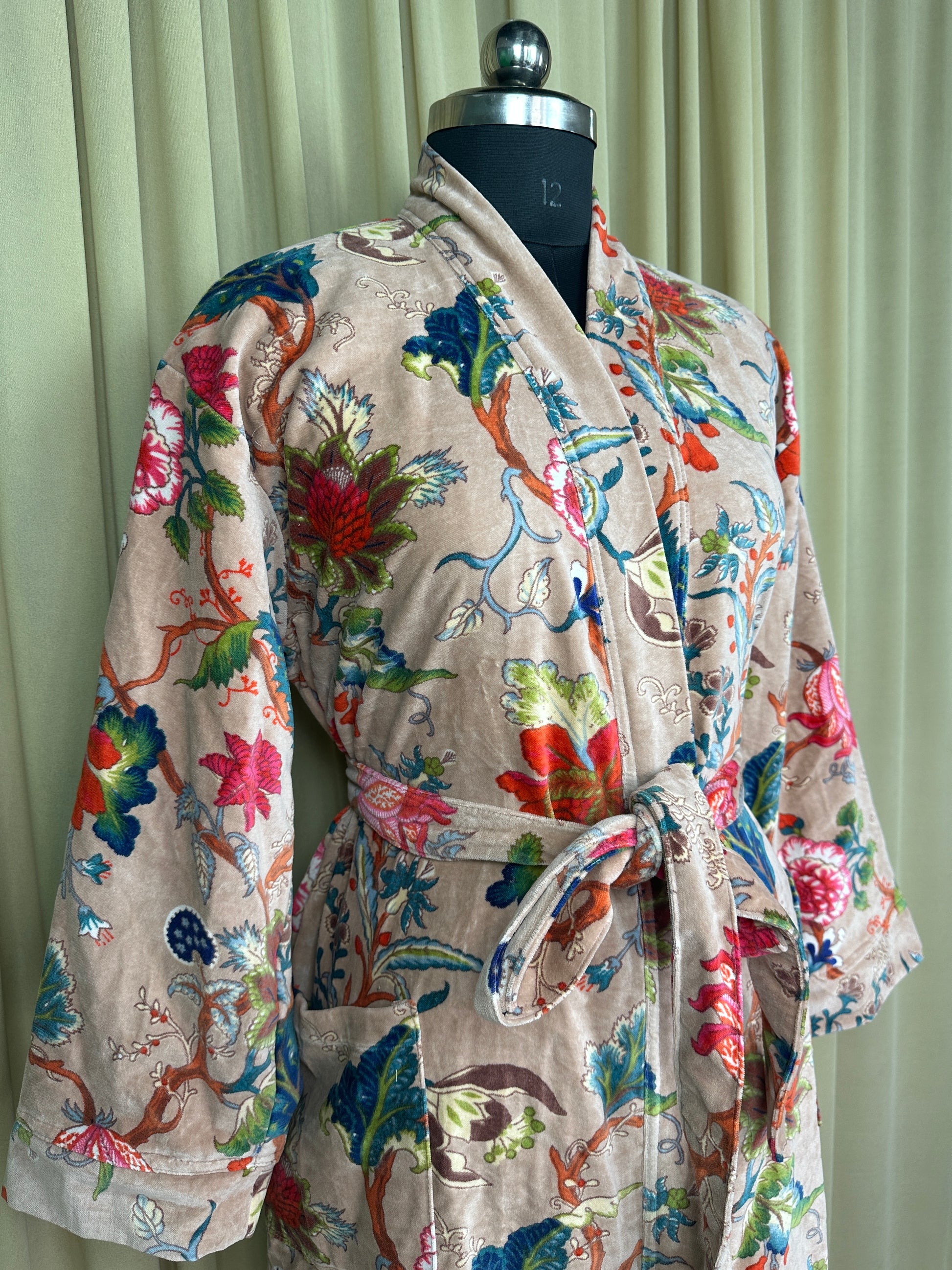 Indulge in the luscious luxury of our printed velvet robe, featuring a soft Silk lining. With its reversible design, you can choose between the stunning outer print or the comforting feel of the lining against your skin. Perfect for autumn and winter, this dressy robe is also a great choice for unpredictable cold weather.