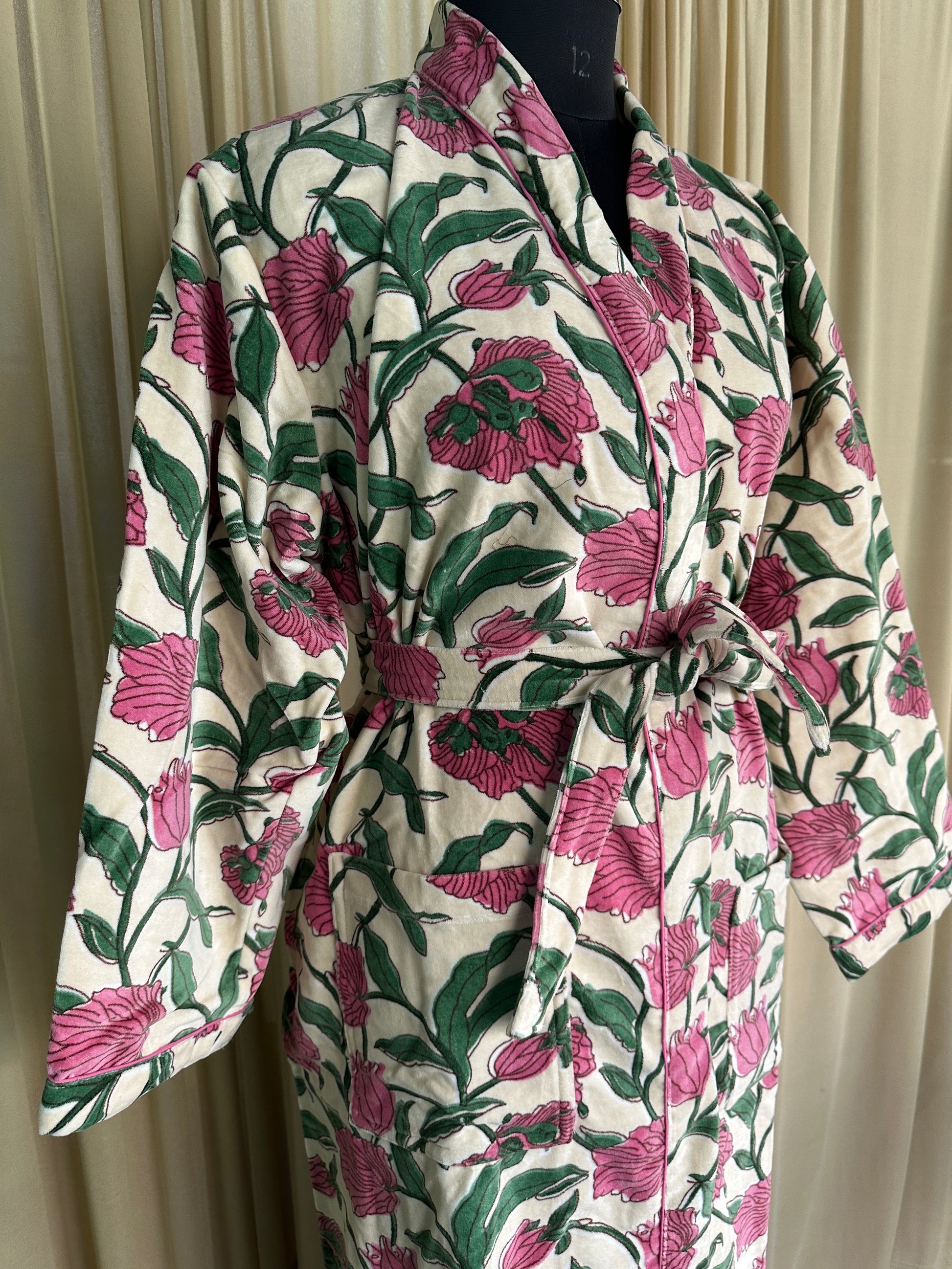 Luxury Velvet Kimono Unisex House Robe | Boho Jacket Autumn Winter Christmas Gift Elegant Reversible Silk Lined | Quirky Gown White Floral
