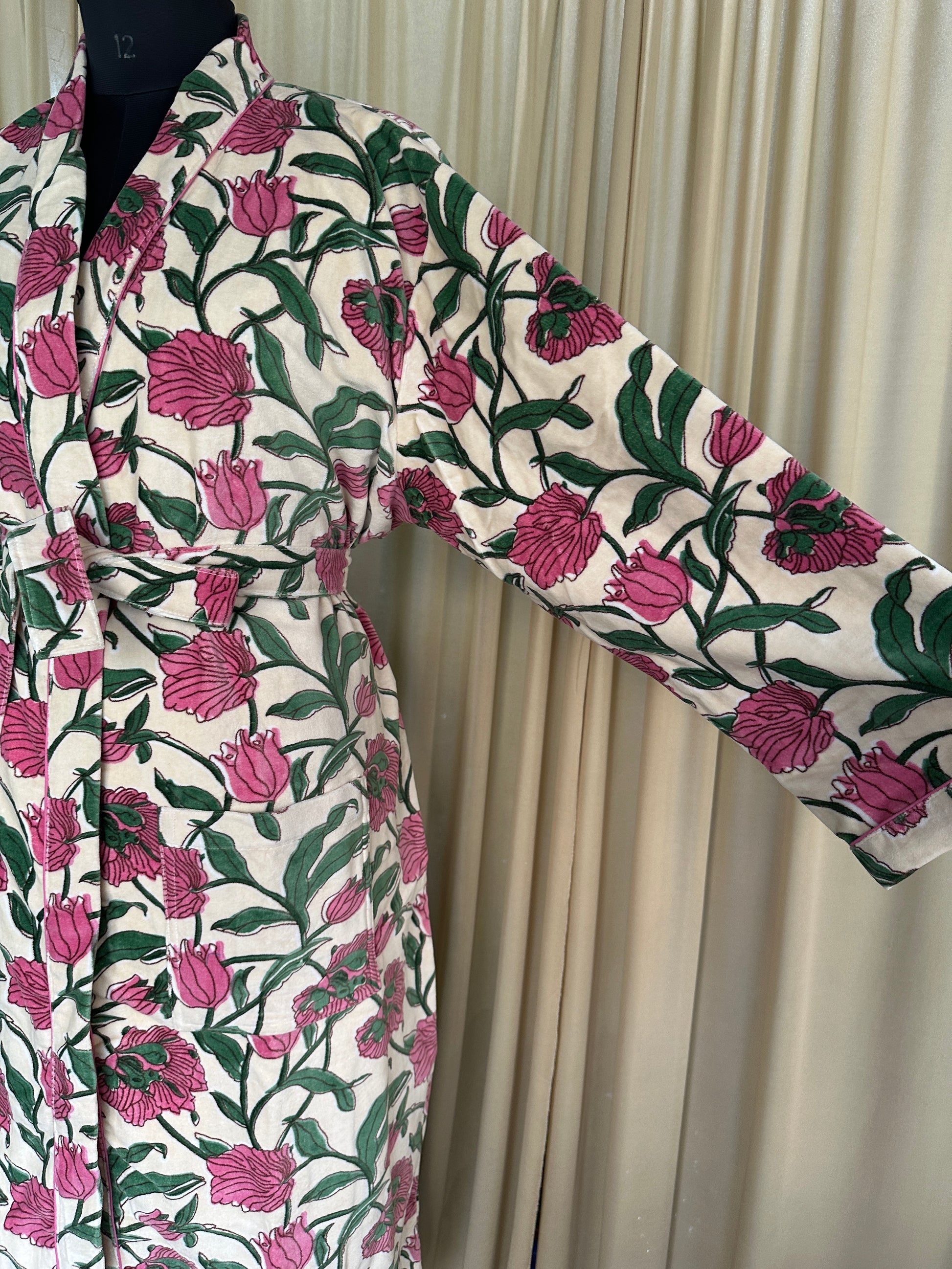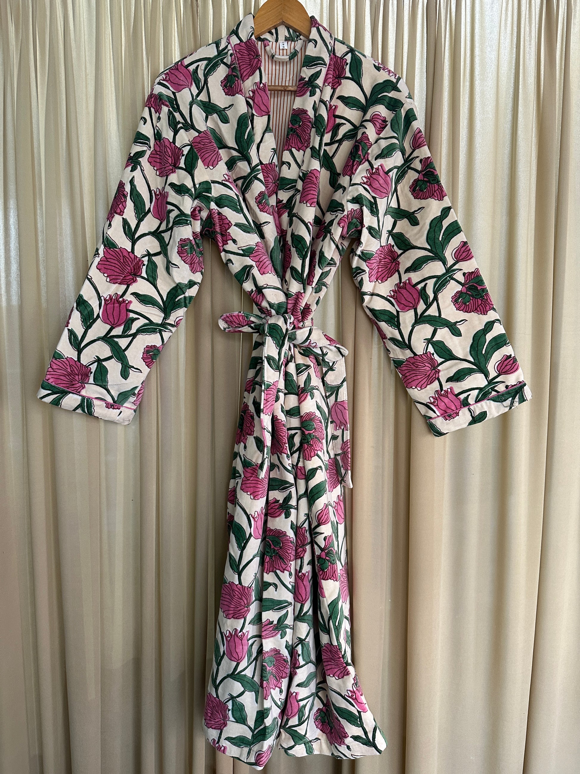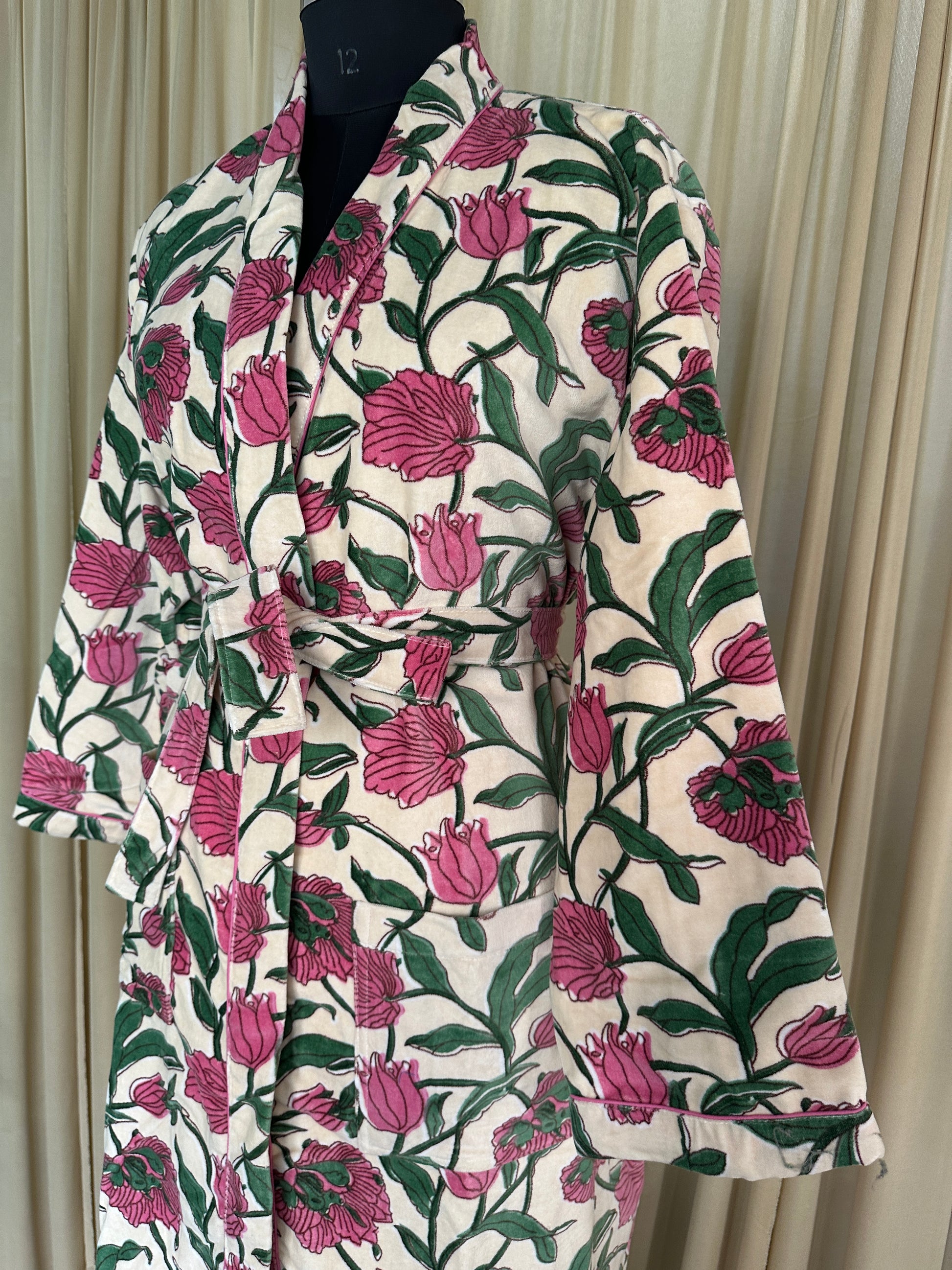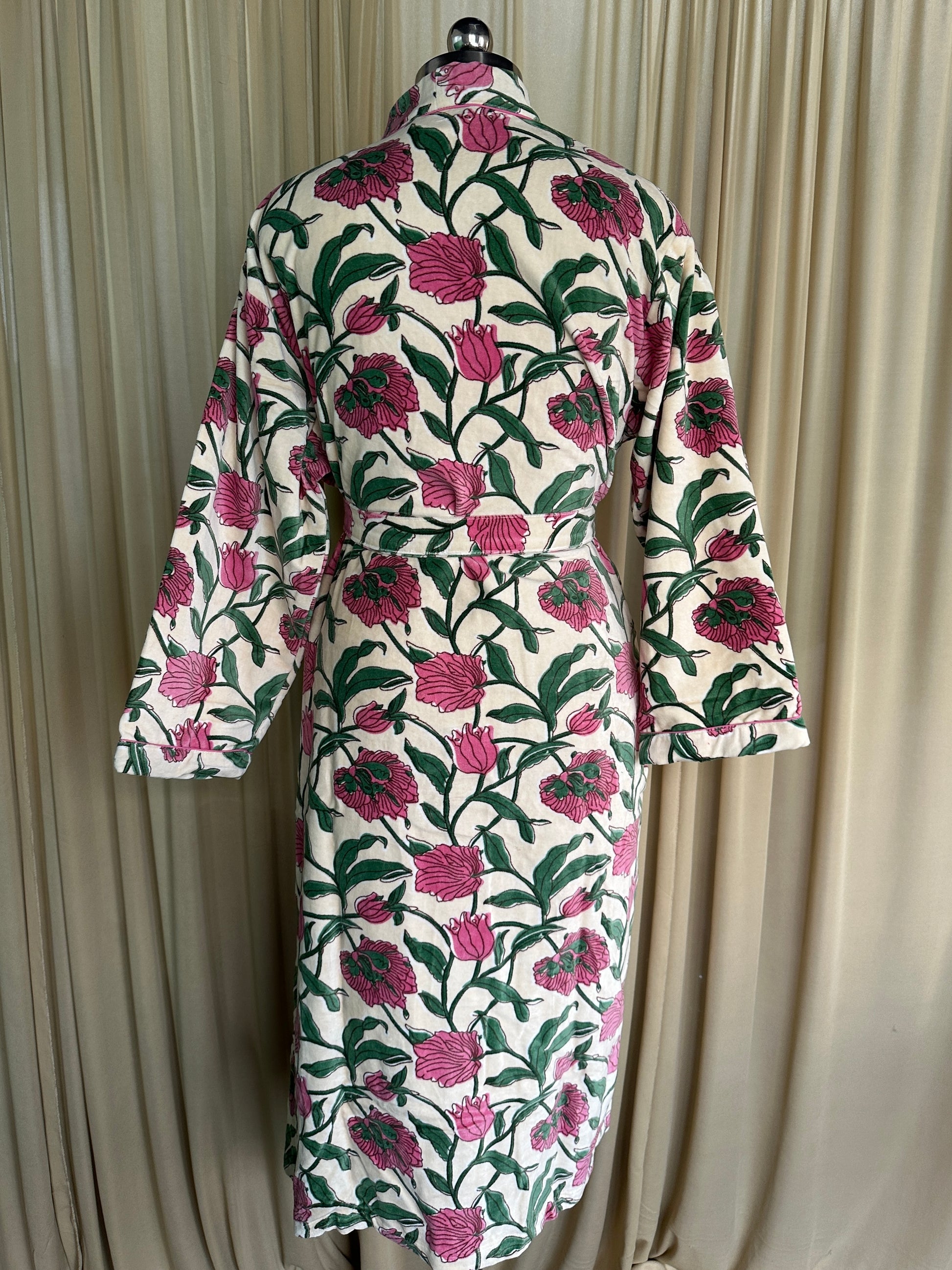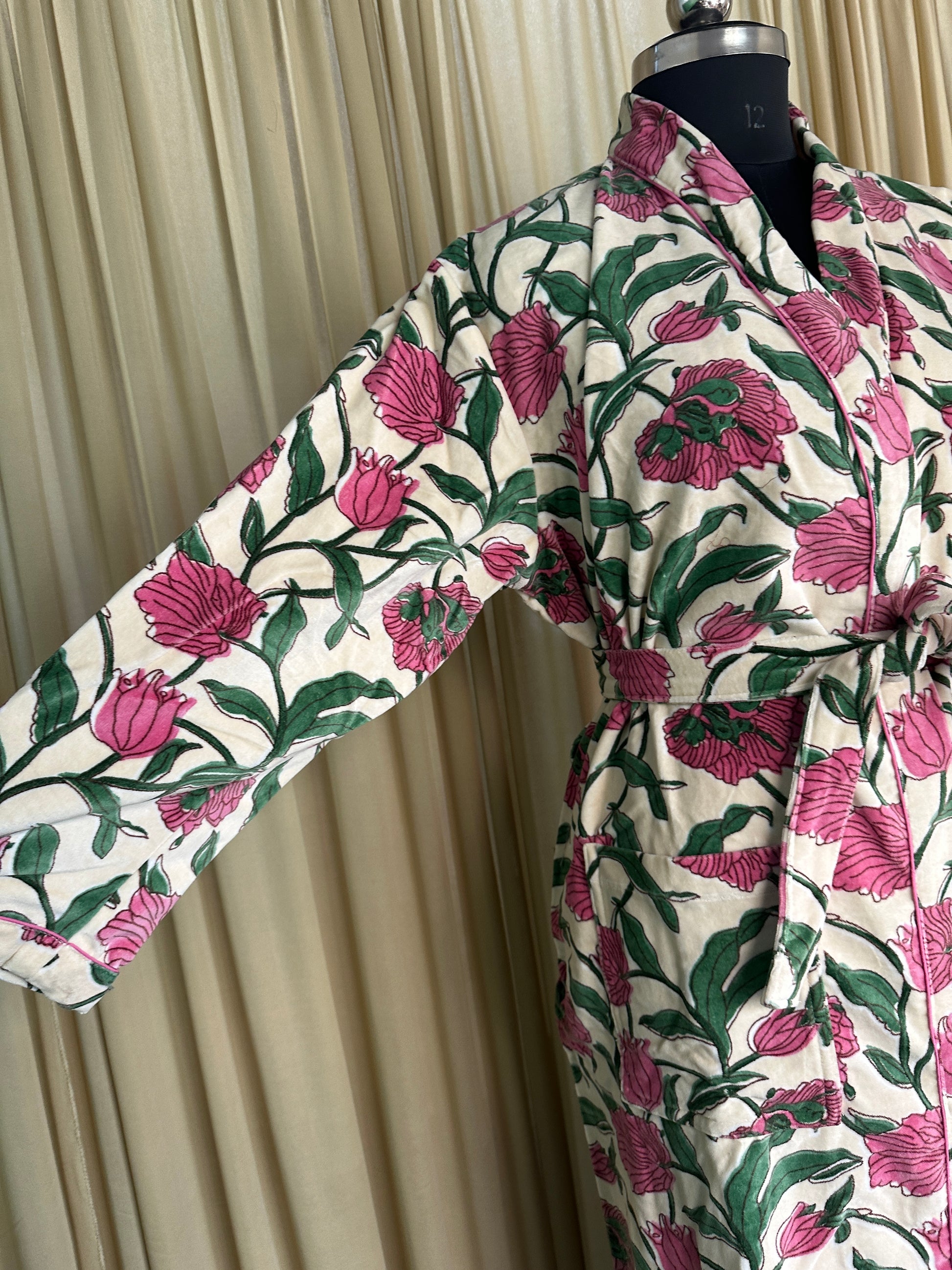 Indulge in the luscious luxury of our printed velvet robe, featuring a soft Silk lining. With its reversible design, you can choose between the stunning outer print or the comforting feel of the lining against your skin. Perfect for autumn and winter, this dressy robe is also a great choice for unpredictable cold weather.