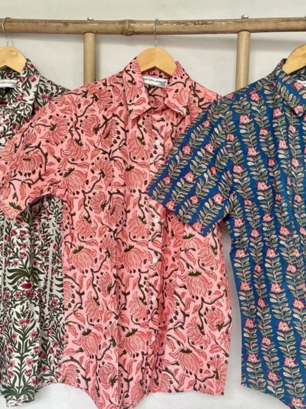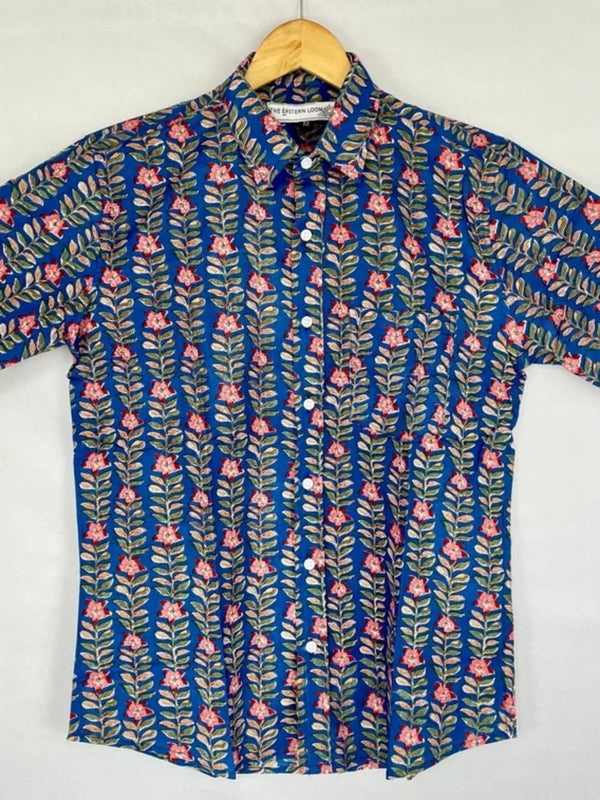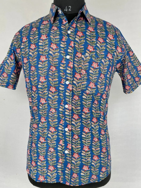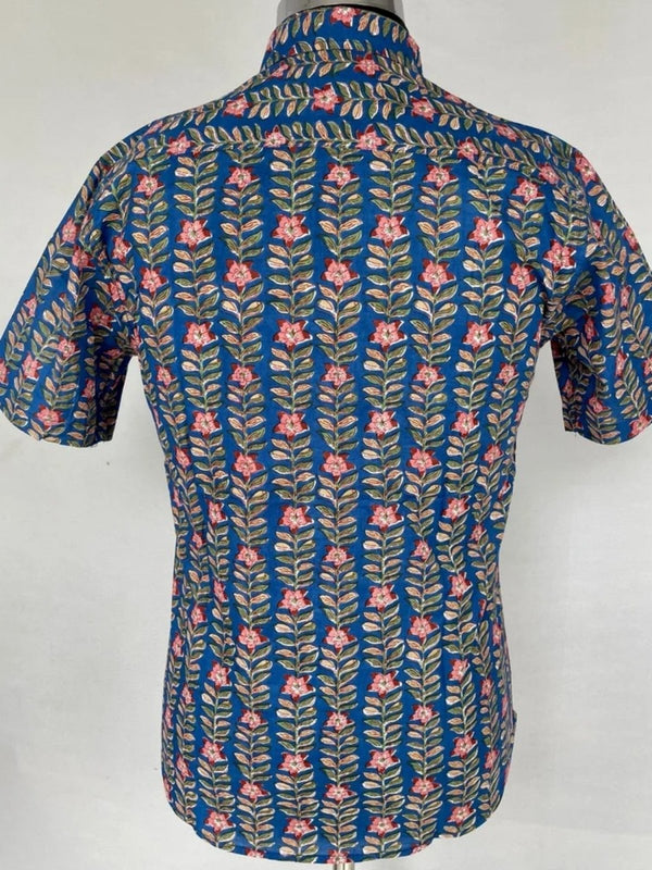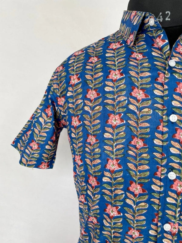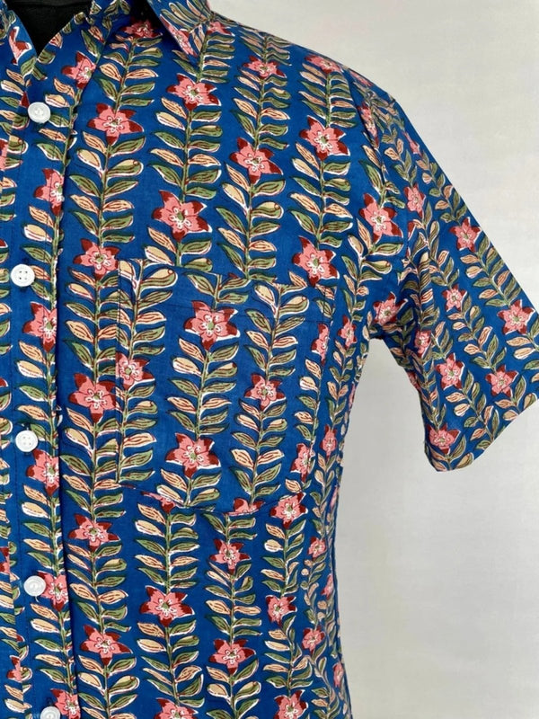 Men's Shirt Pure Cotton Handblock Print | Summer Cool Casual Beach Wear | Comfortable Garden Picnic Urban Man Dad Gift | Blue Floral Leaf