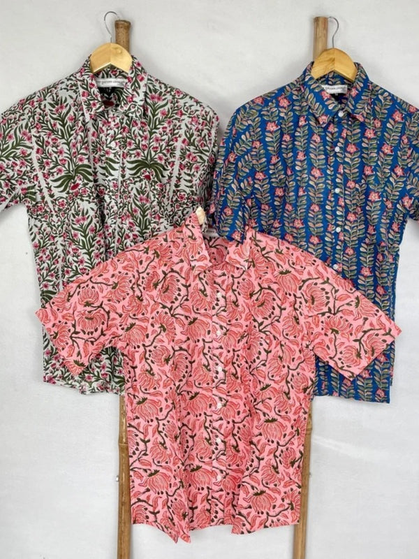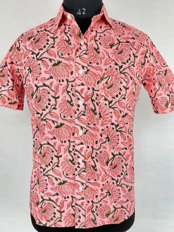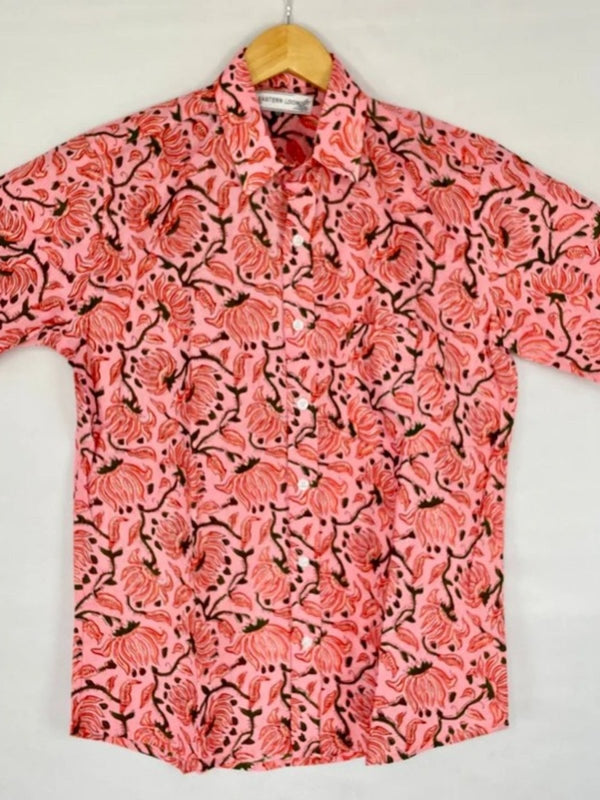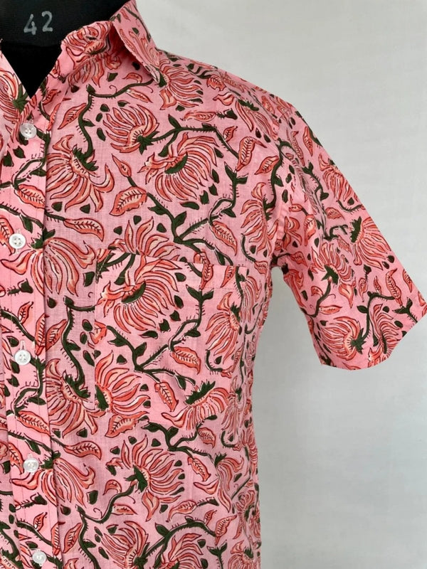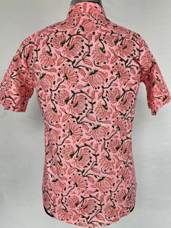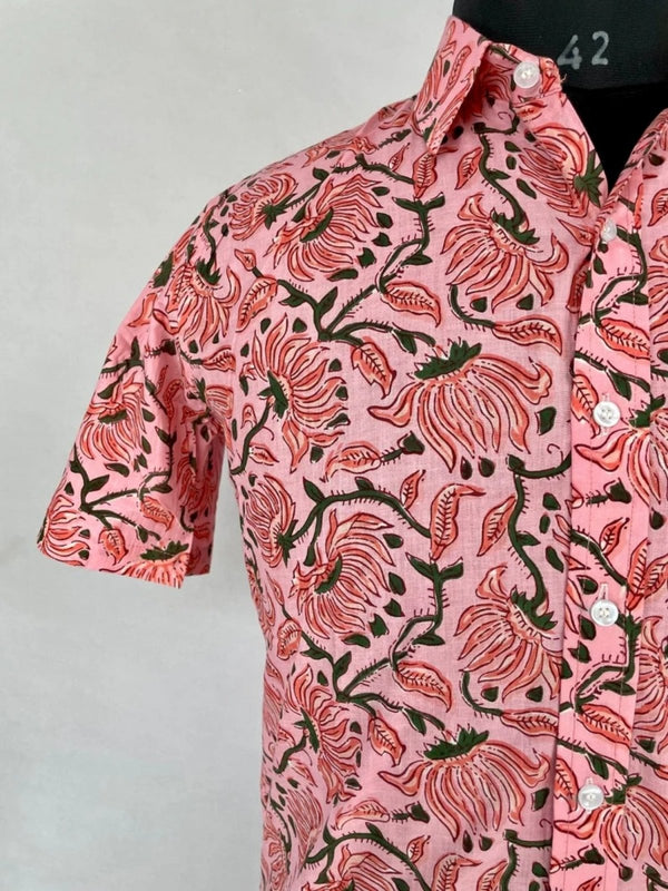 Herrenhemd aus reiner Baumwolle mit Handblockdruck | Coole, lässige Strandkleidung für den Sommer, bequemes Gartenpicknick, Geschenk für Stadtmensch und Papa | Flamingo, rosa, Lotus