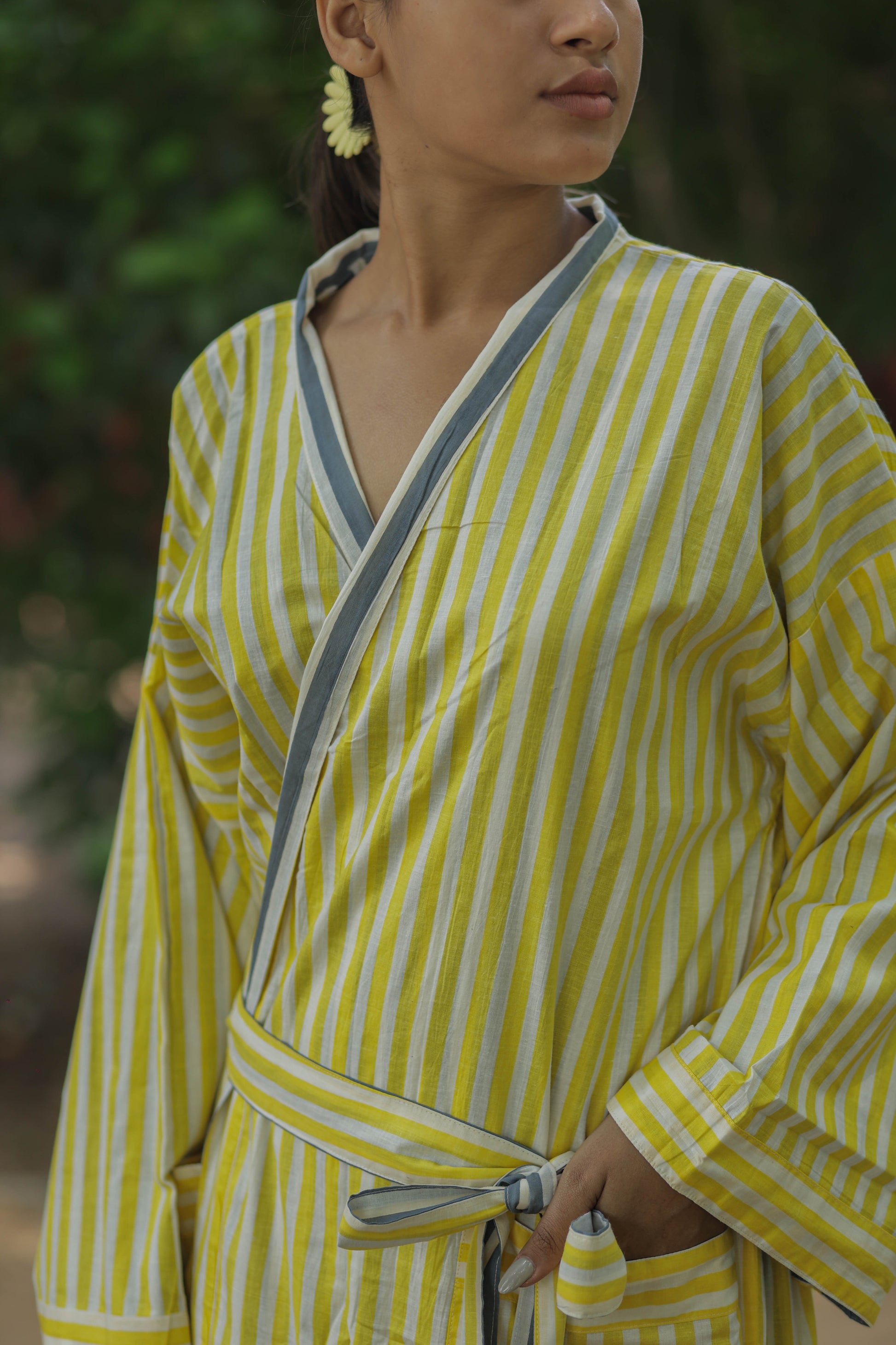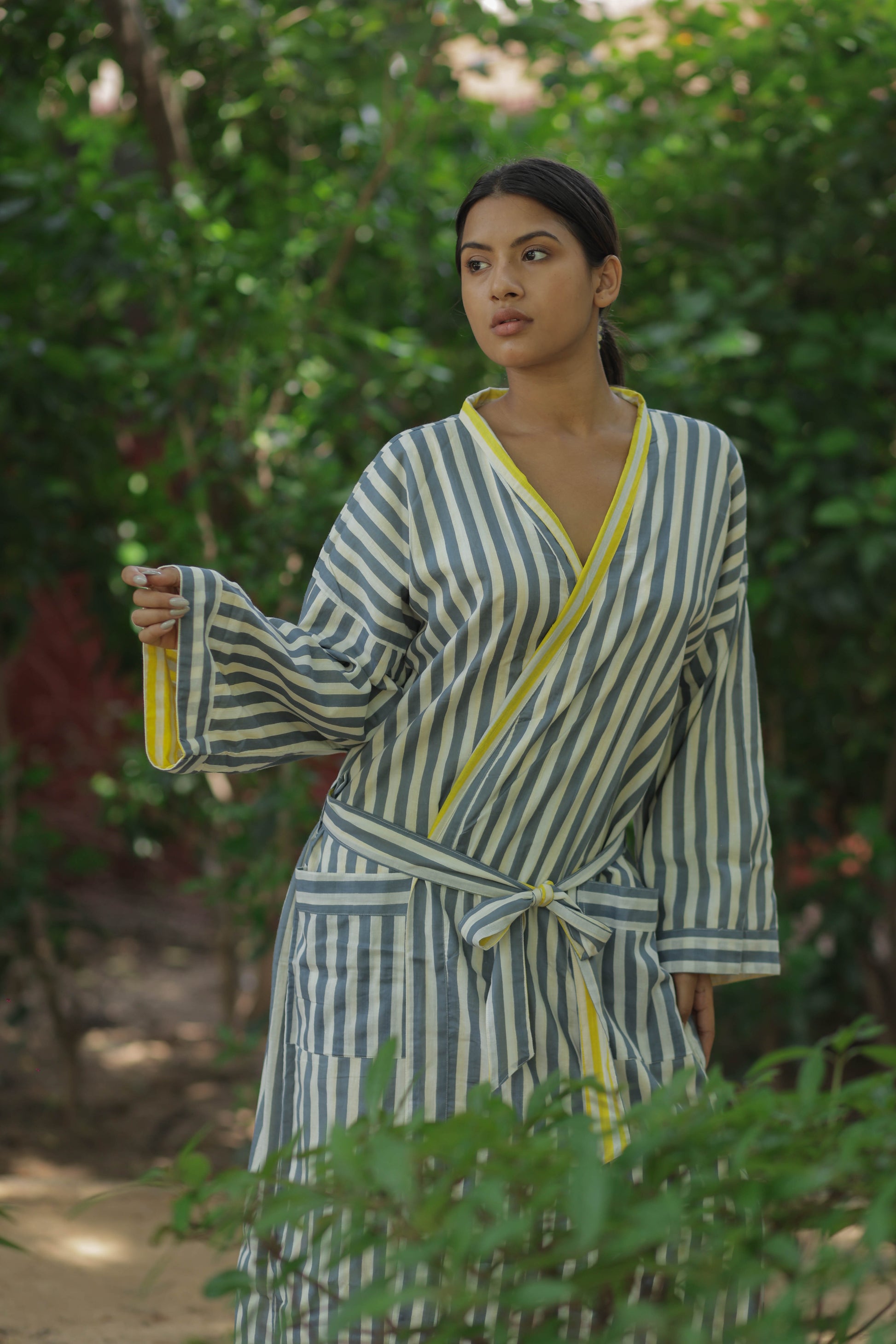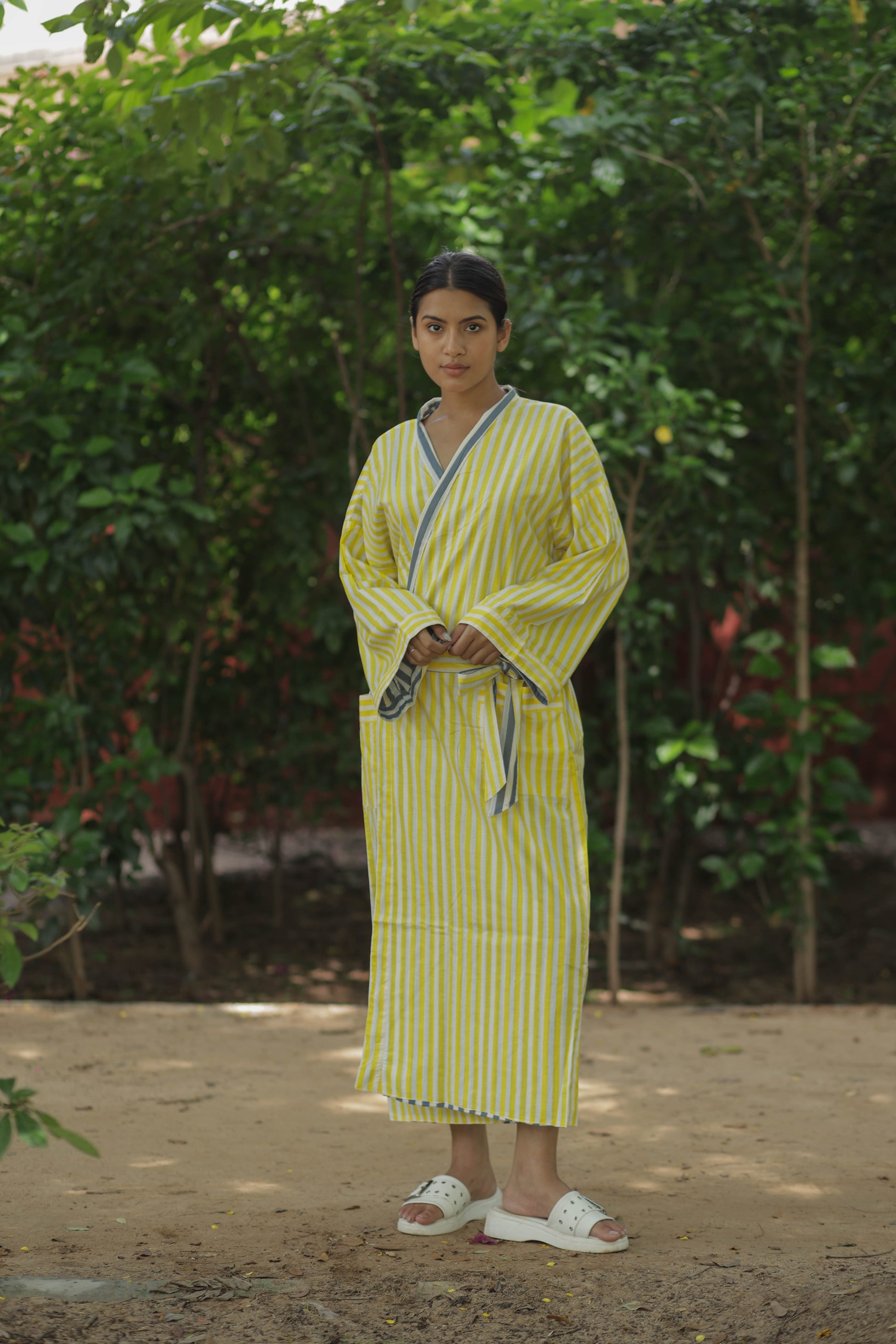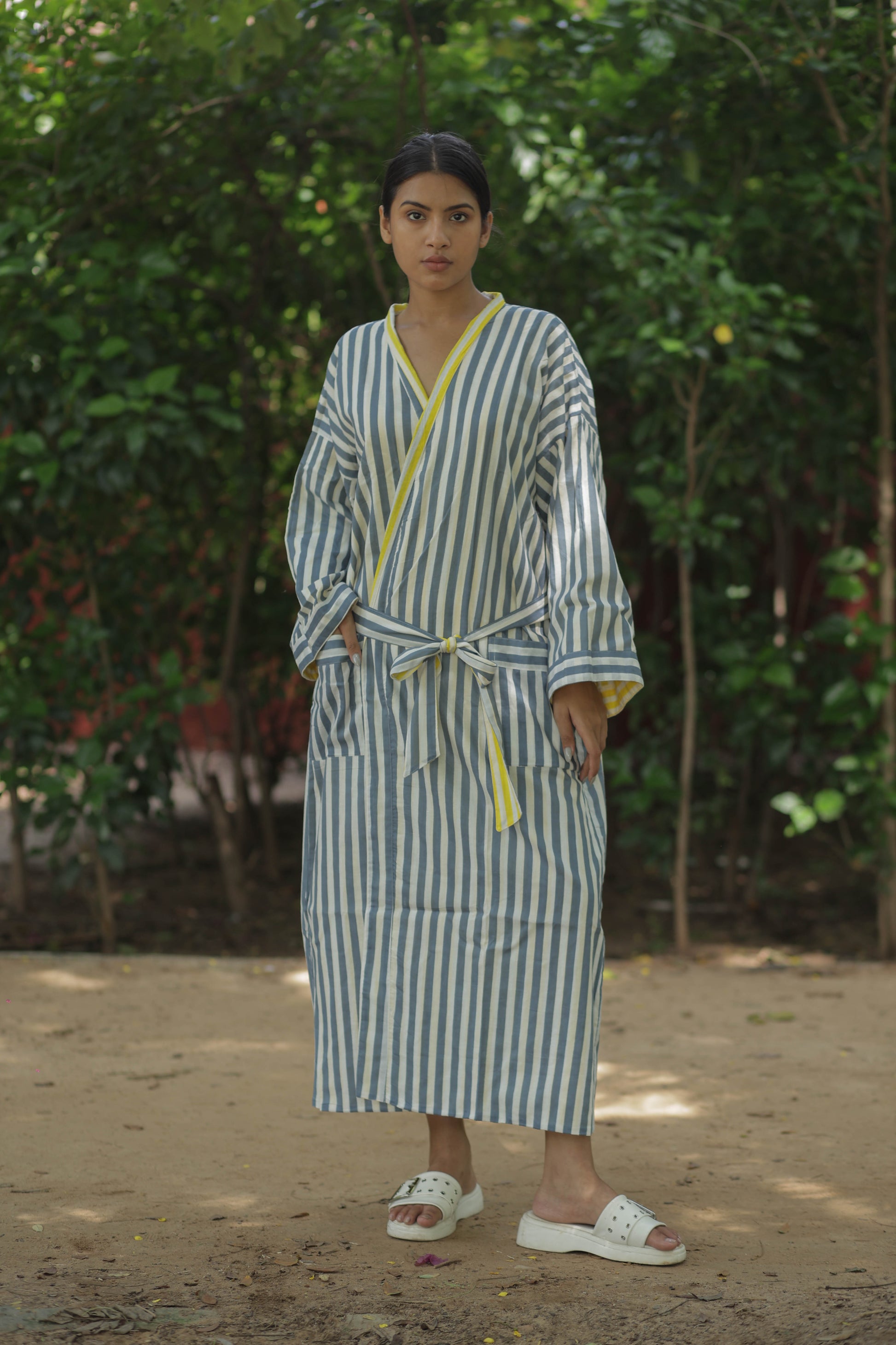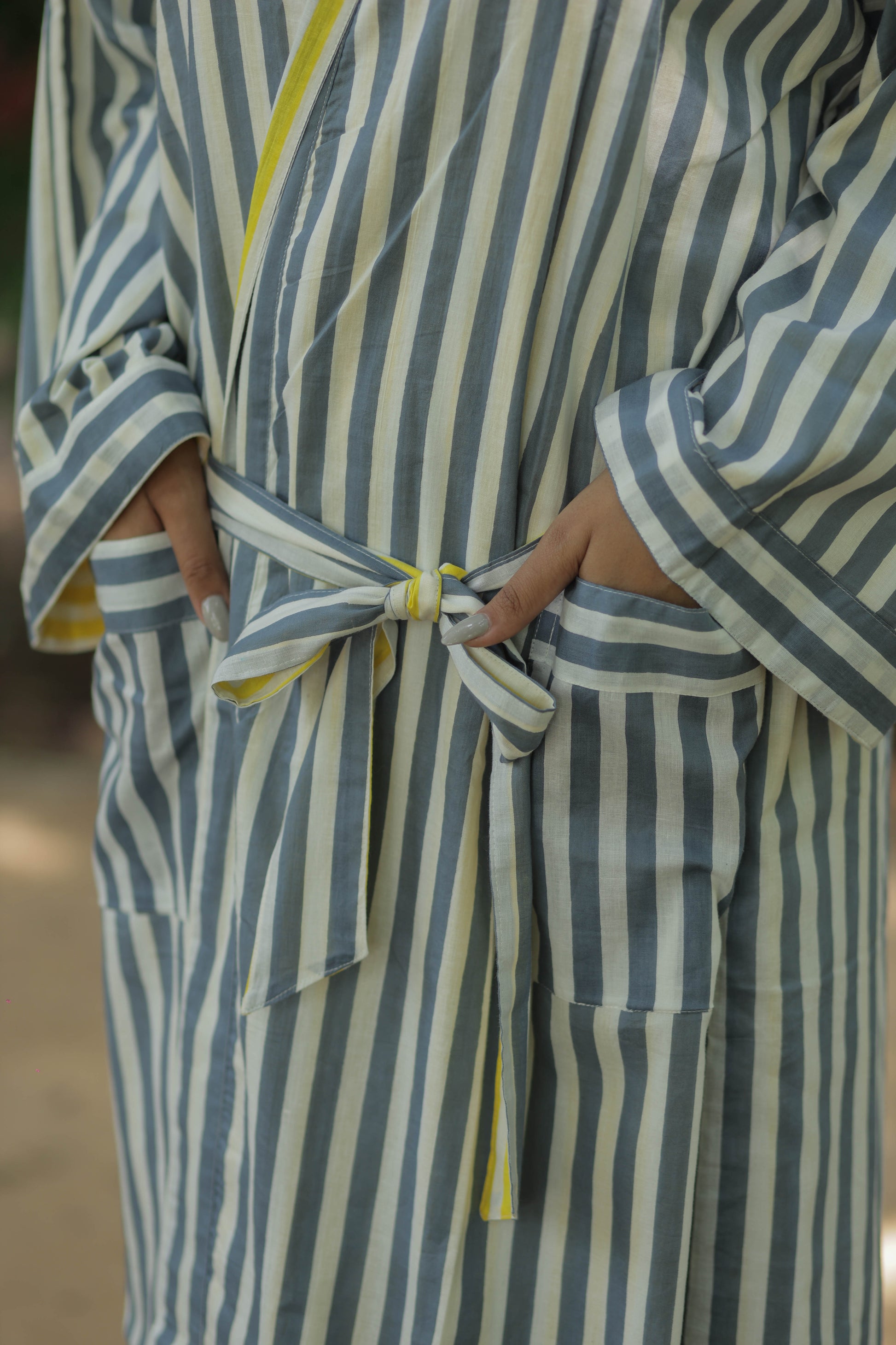 Discover the ultimate in comfort and style with The Eastern Loom’s Men Kimono Robe, crafted from 100% breathable cotton. This long kimono robe features a timeless striped print and a unique reversible design, allowing you to enjoy two looks in one. With spacious pockets on both sides, this robe is as practical as it is stylish, perfect for lounging at home, relaxing on holiday, or making a statement at festivals and resorts. The boho-inspired look adds a touch of effortless sophistication, while the one-size fit ensures comfort for a wide range of body types.