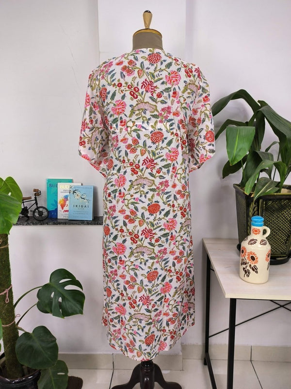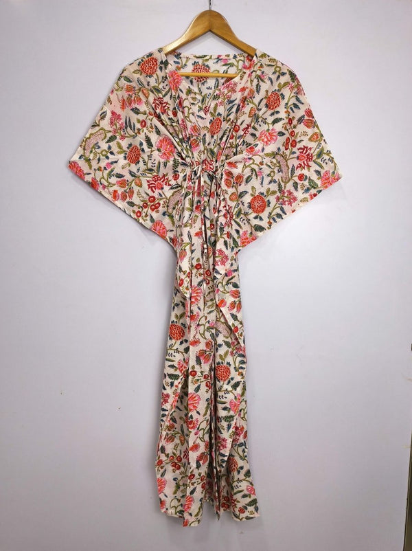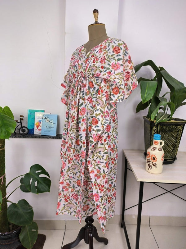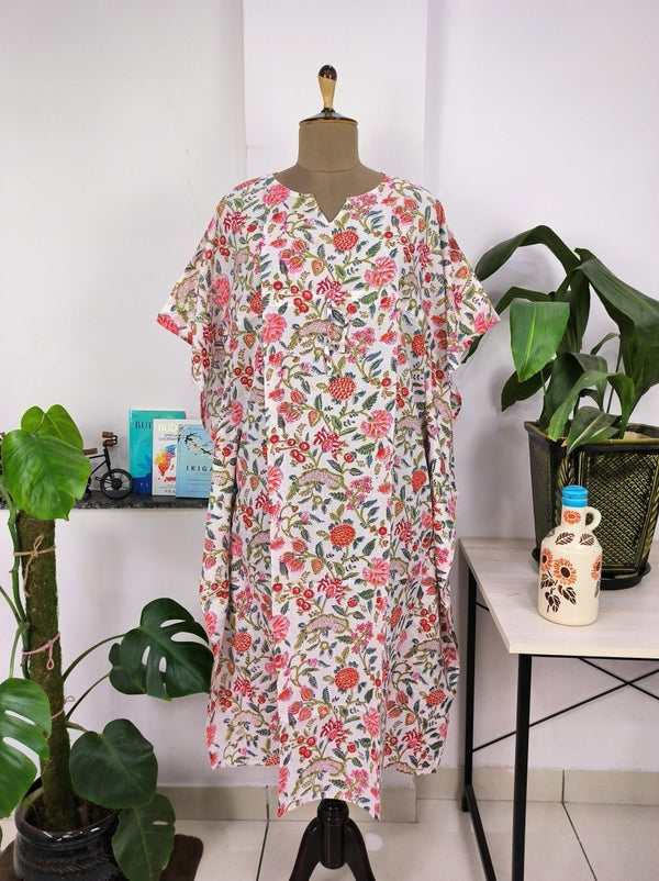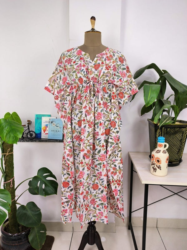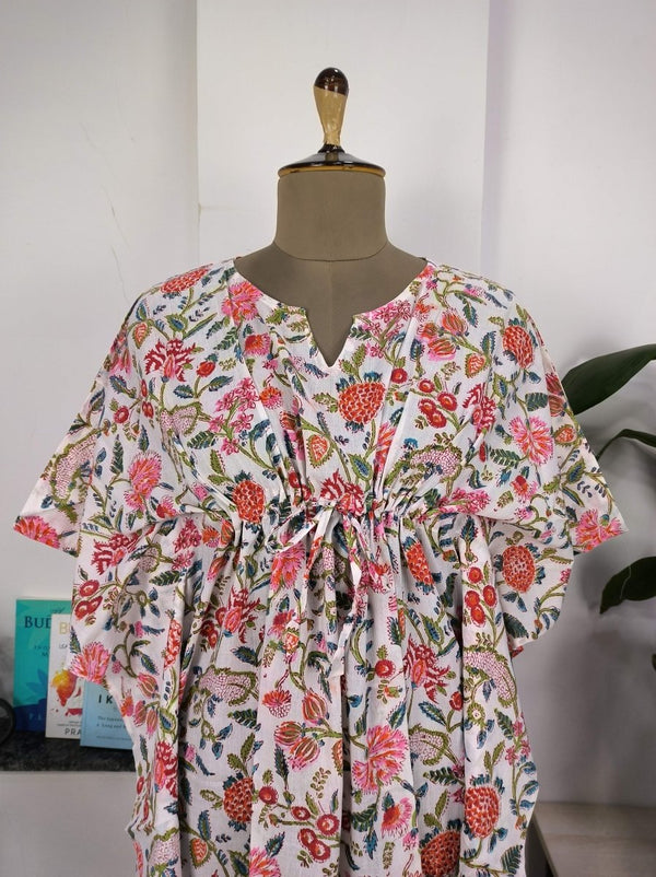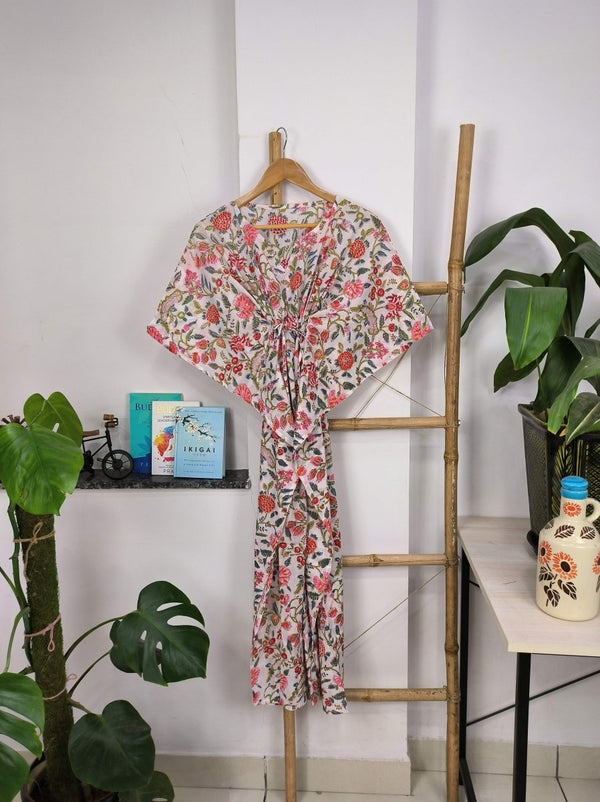 Robe Kaftan de style Boho | Indien imprimé à la main avec des fleurs roses blanches | Tissu en coton léger et respirant, look d'été chic et confortable.