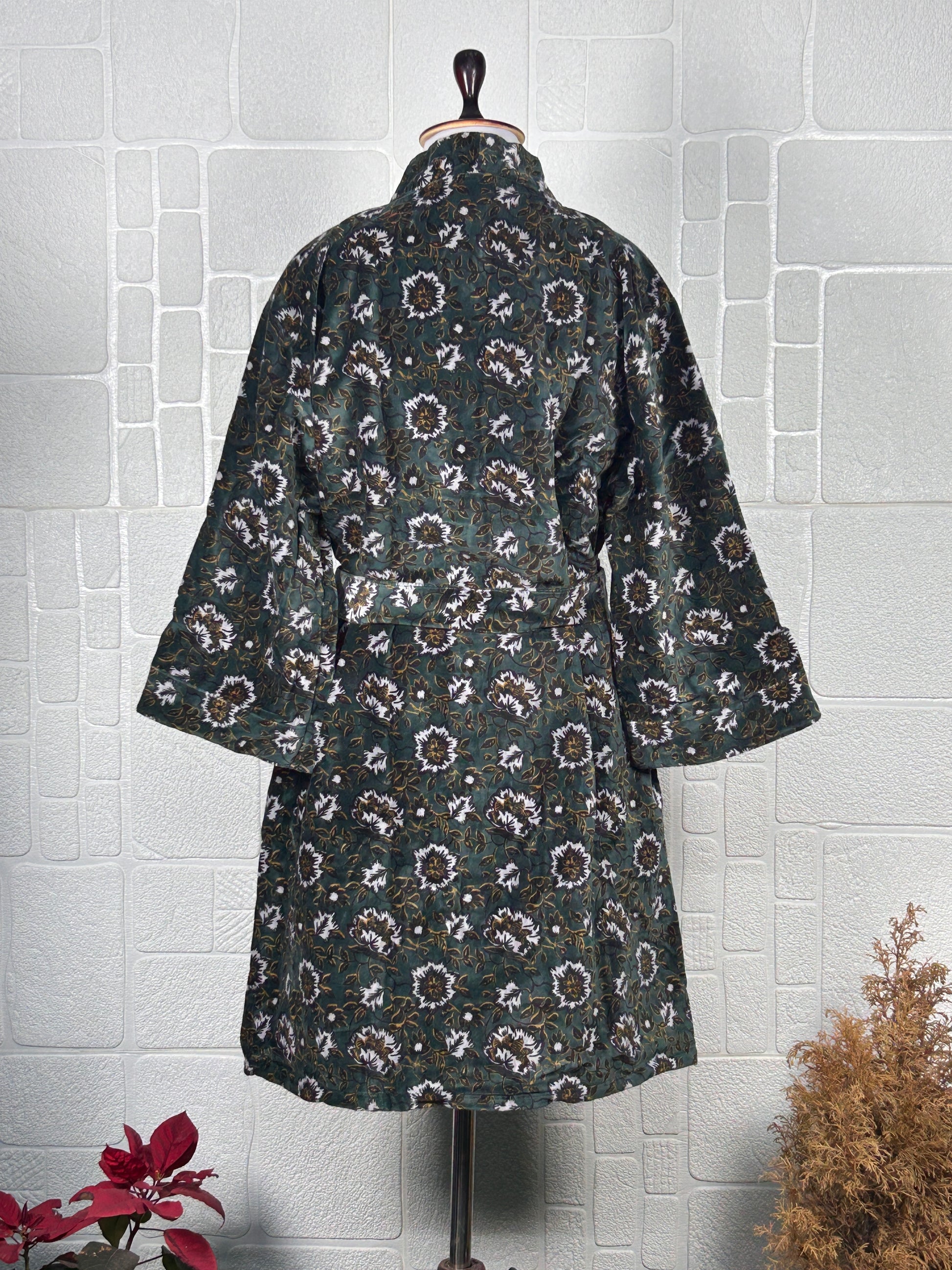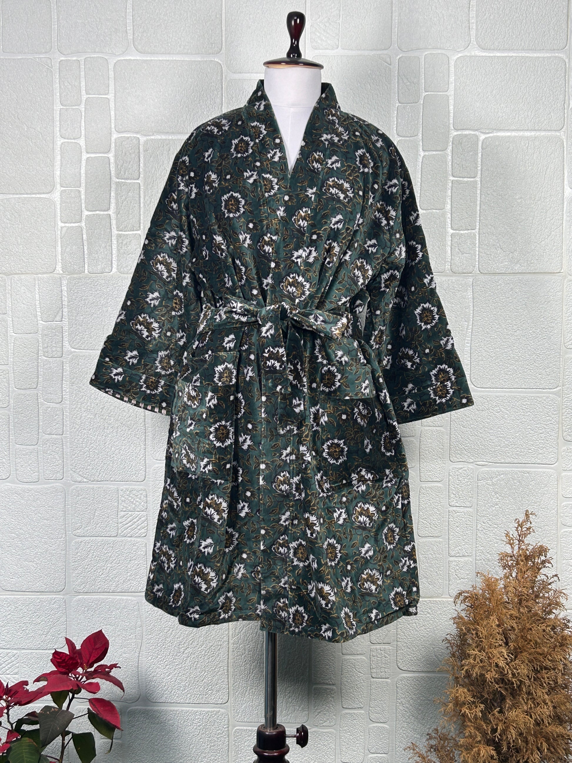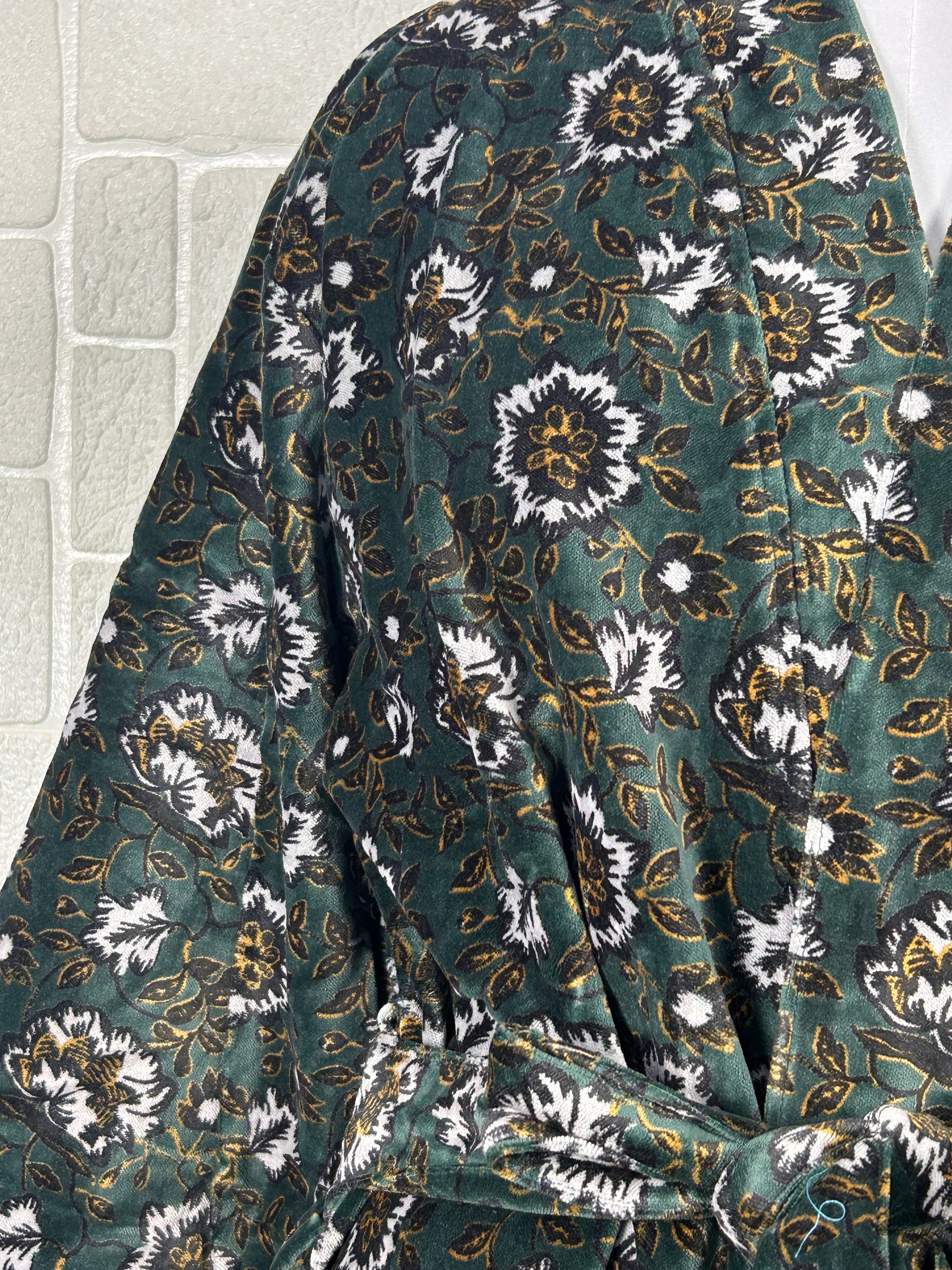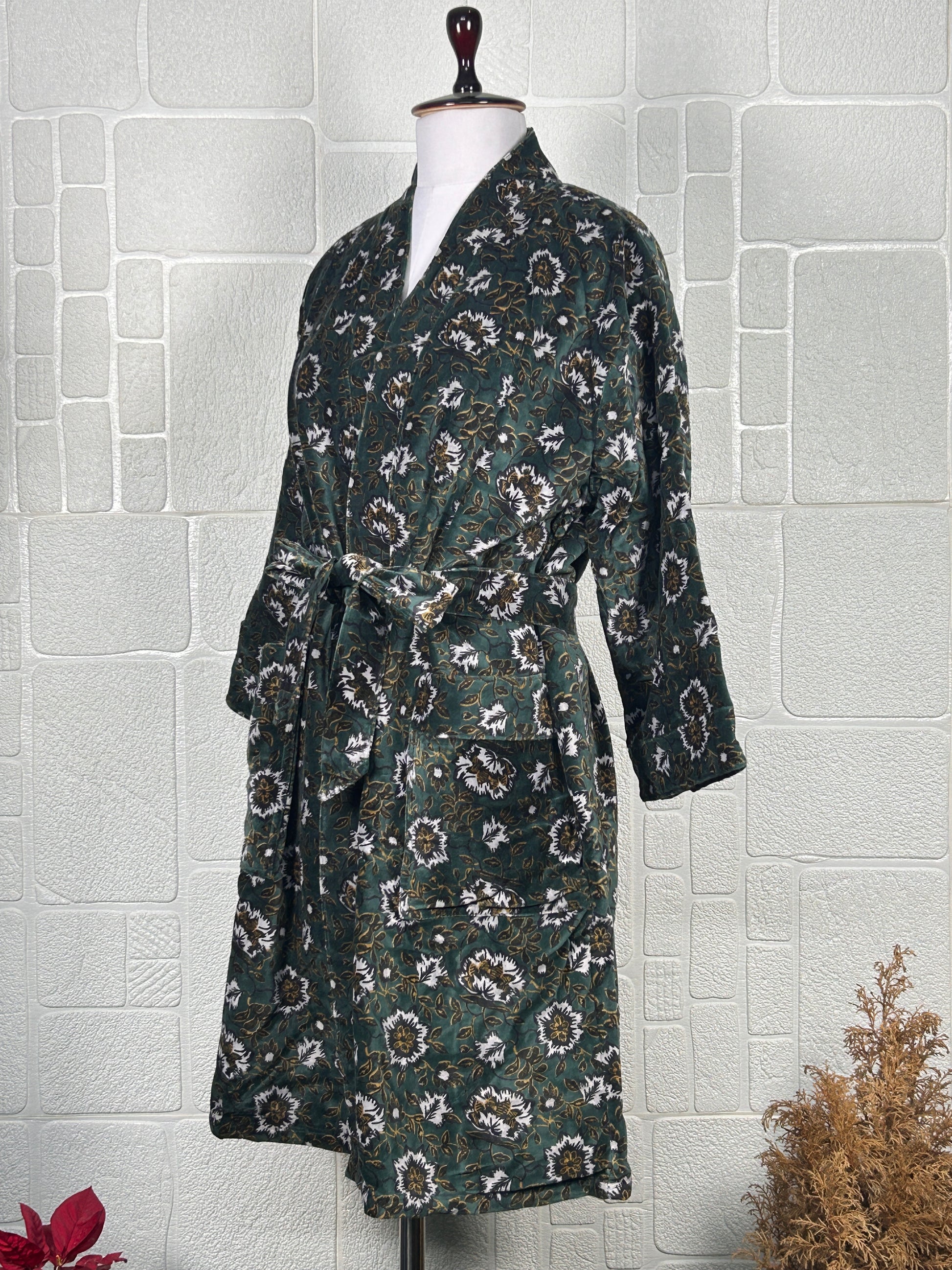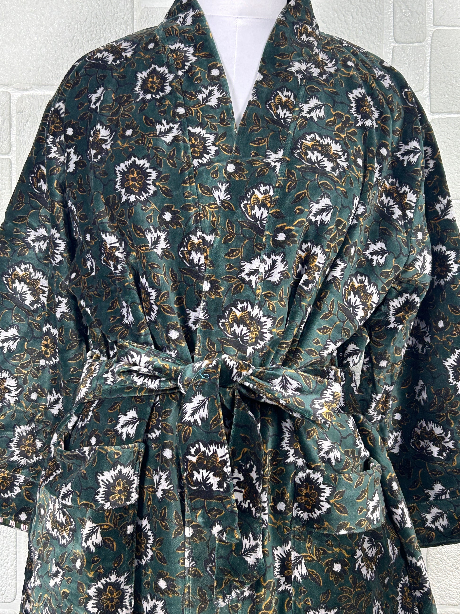 Luxury Velvet Kimono Unisex House Robe | Boho Jacket Autumn Winter Christmas Gift Elegant Reversible Cotton Lined | Quirky Gown Green Floral