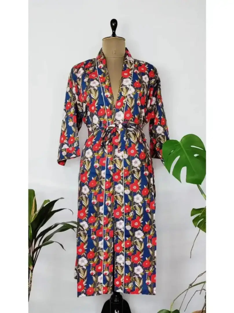 Robes de maison imprimées à la main en pur coton Kimono d’été Cool Bleu Rouge Blanc Floral Beach Coverup/Confortable Maternité Maman Cadeau Elle/Petite amie/Soeur