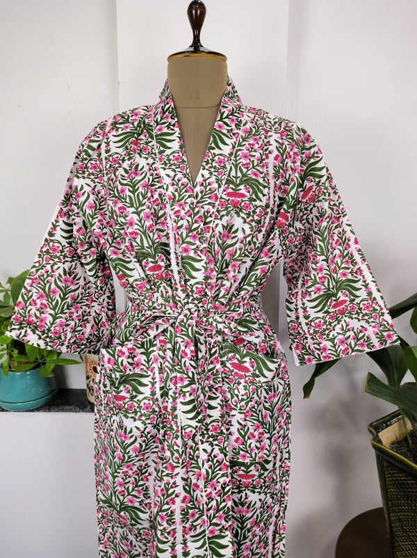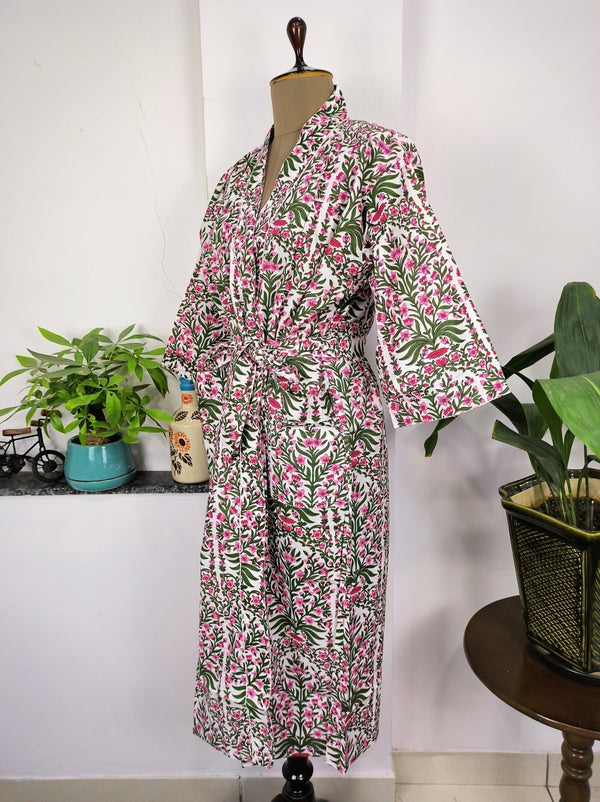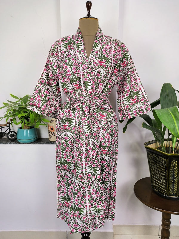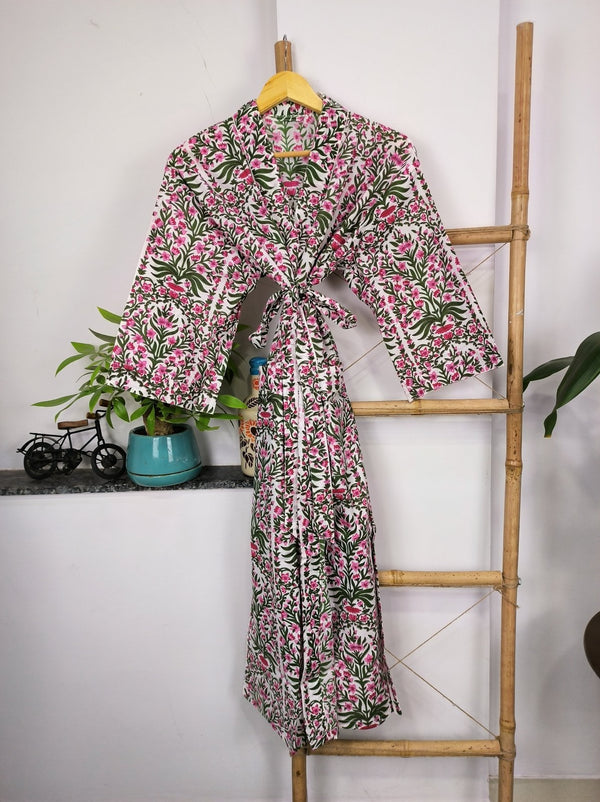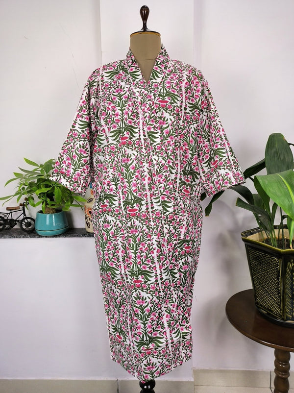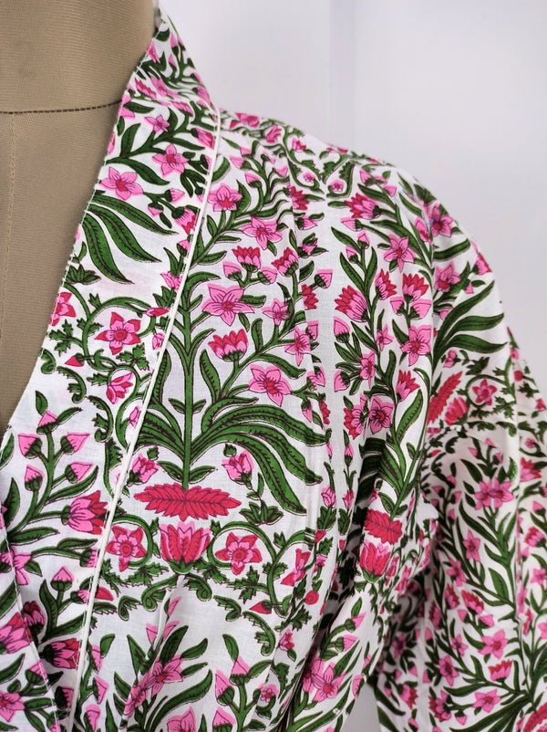 Pur coton Kimono indien imprimé à la main Boho House Robe Robe d’été | Couverture luxueuse de plage florale de jardin rose blanc, mariée de maman de maternité