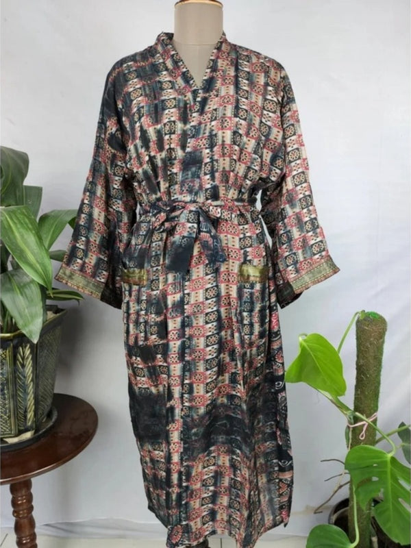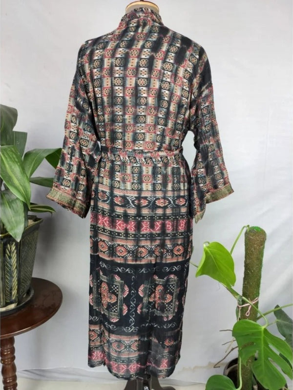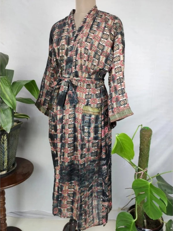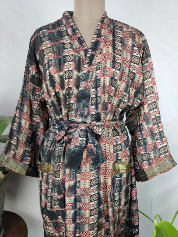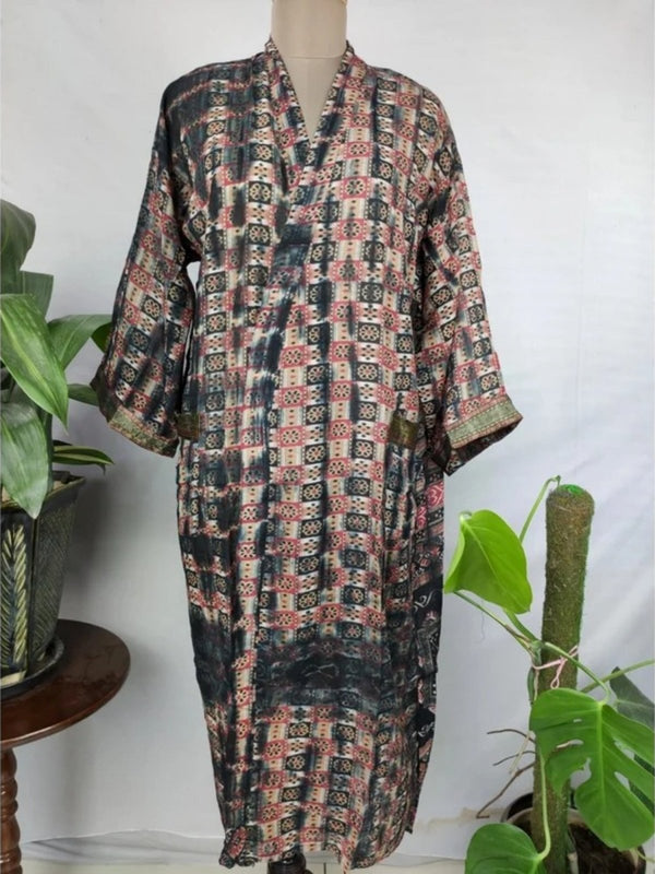 Veste ouverte kimono vintage en coton pur recyclé Boho Summer TieDye House Robe, Beach Coverup | Feuille géométrique rouge sur impression de style bord