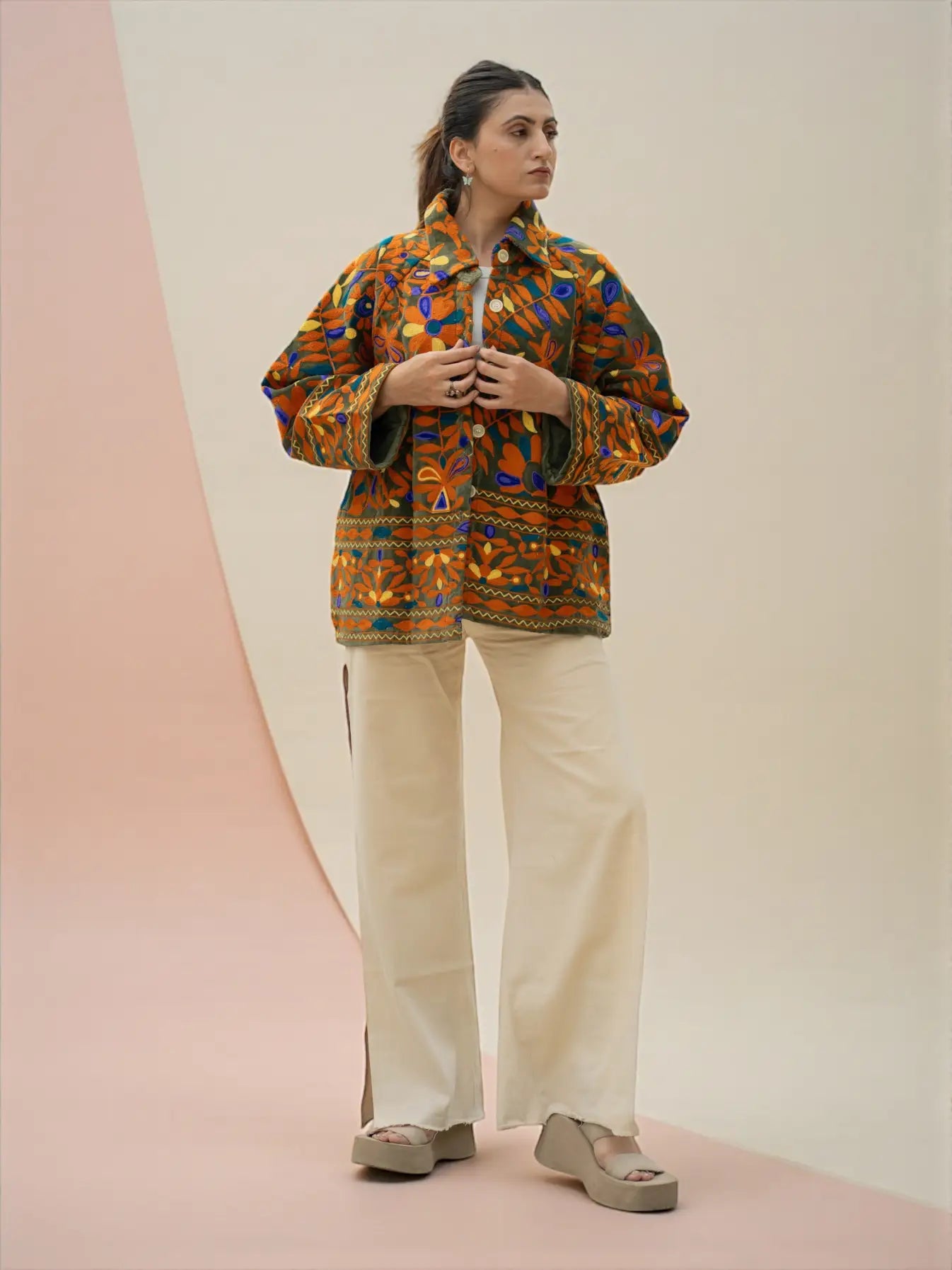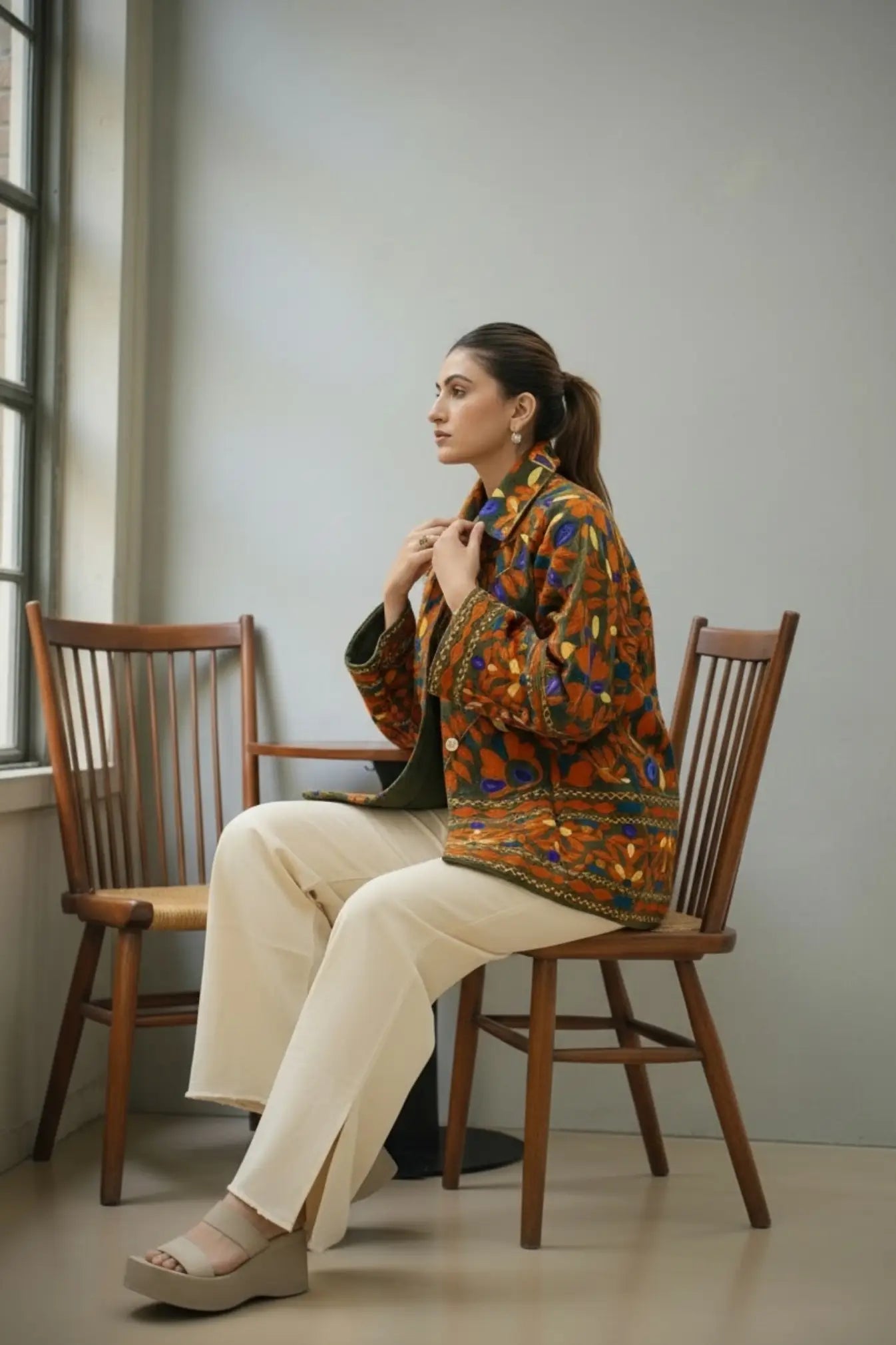 Suzani is a traditional form of embroidery that has been passed down through generations, and we are deeply committed to preserving and continuing this heritage. This jacket features newly embroidered Suzani work, created using traditional techniques that honor the craft while keeping it relevant for contemporary wear. The word Suzani comes from Central Asia and translates to needle, a reflection of the intricate handwork involved in every piece.