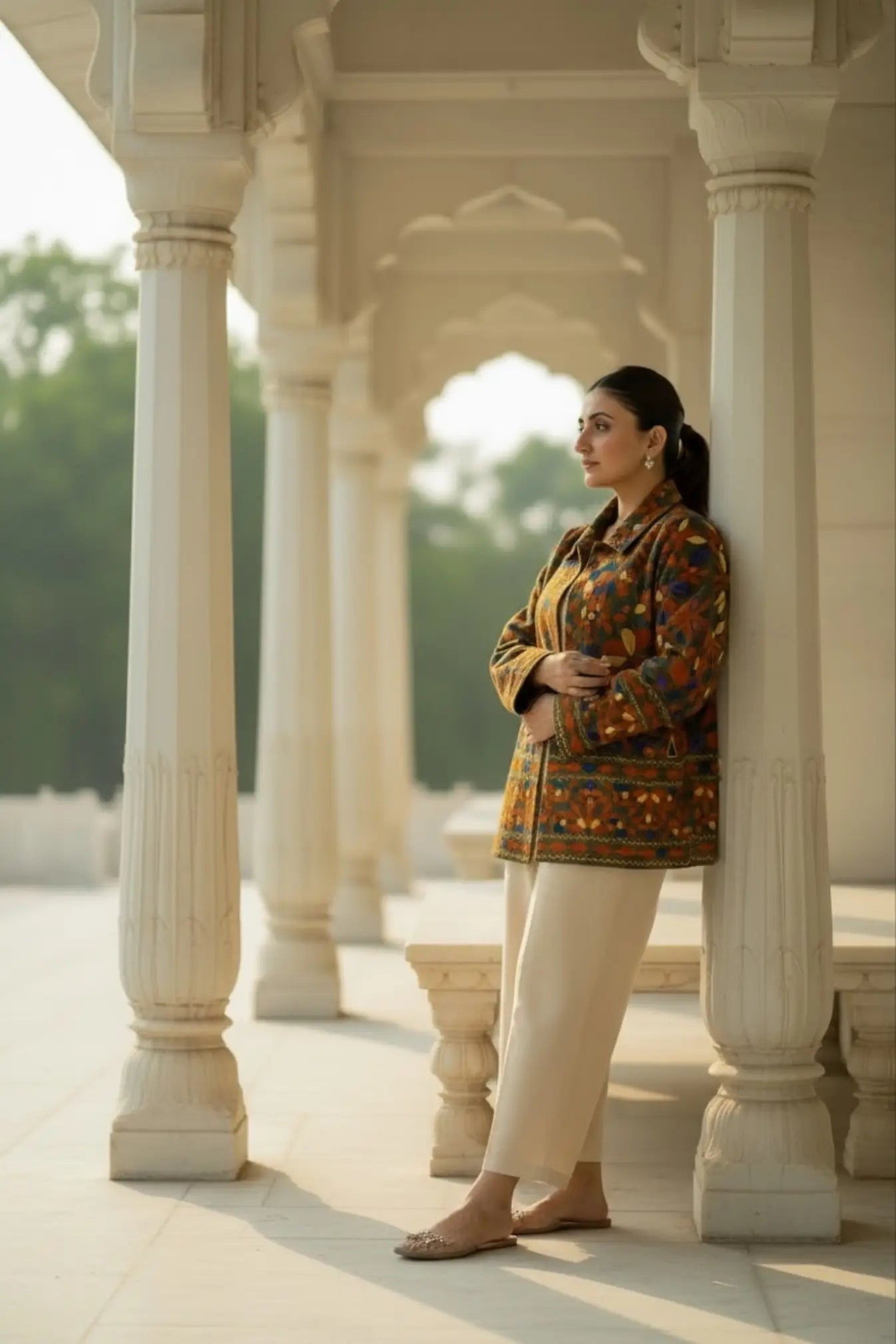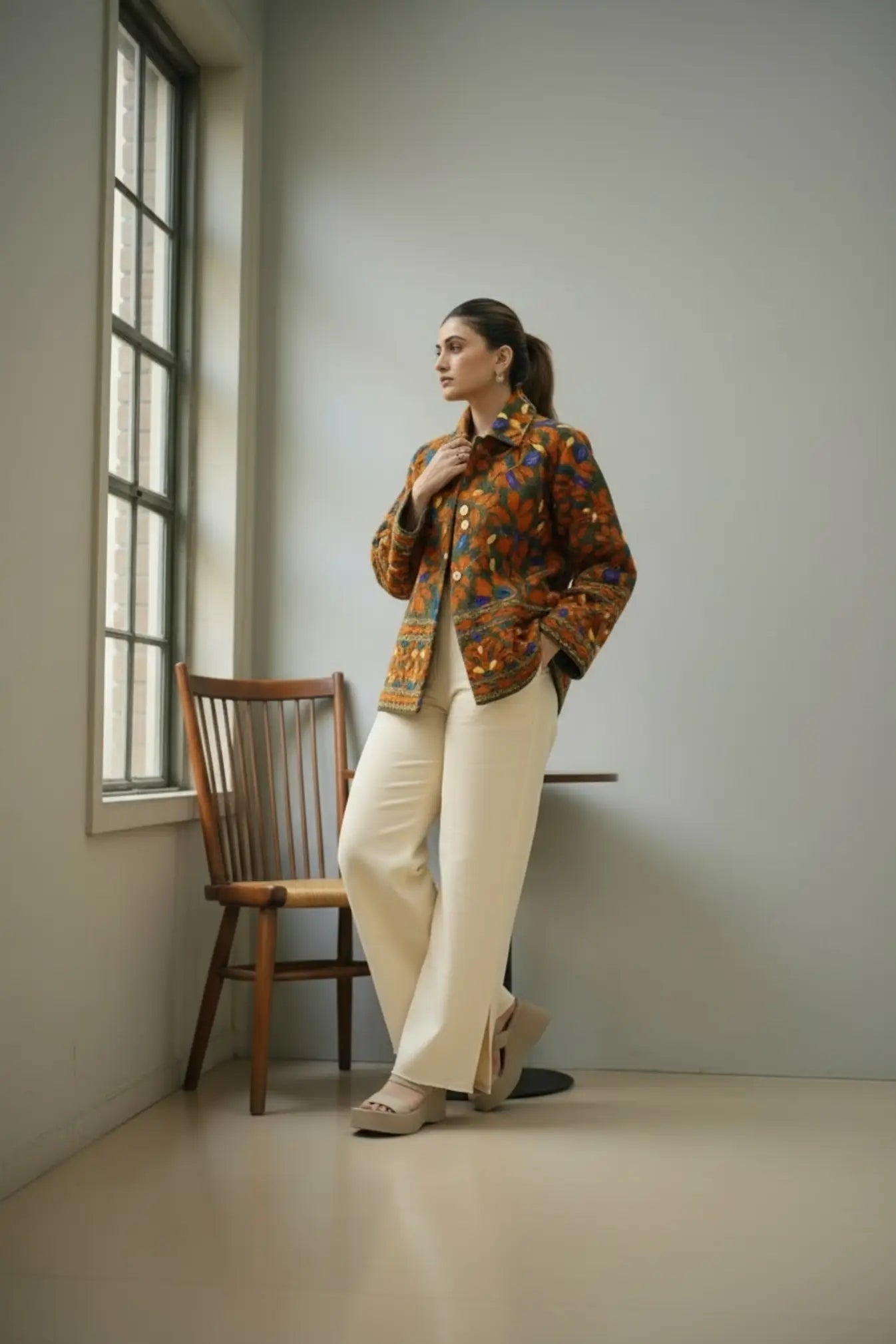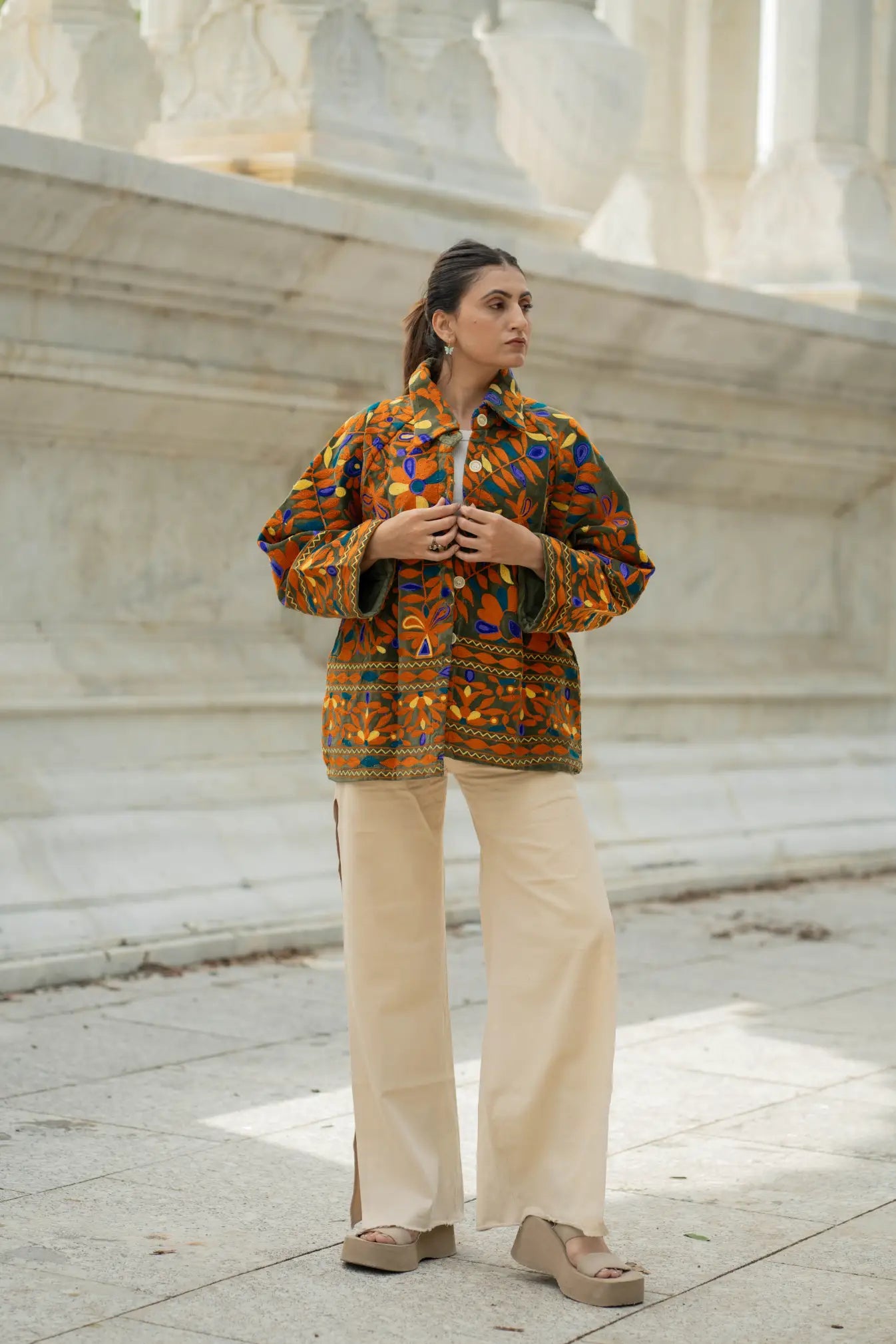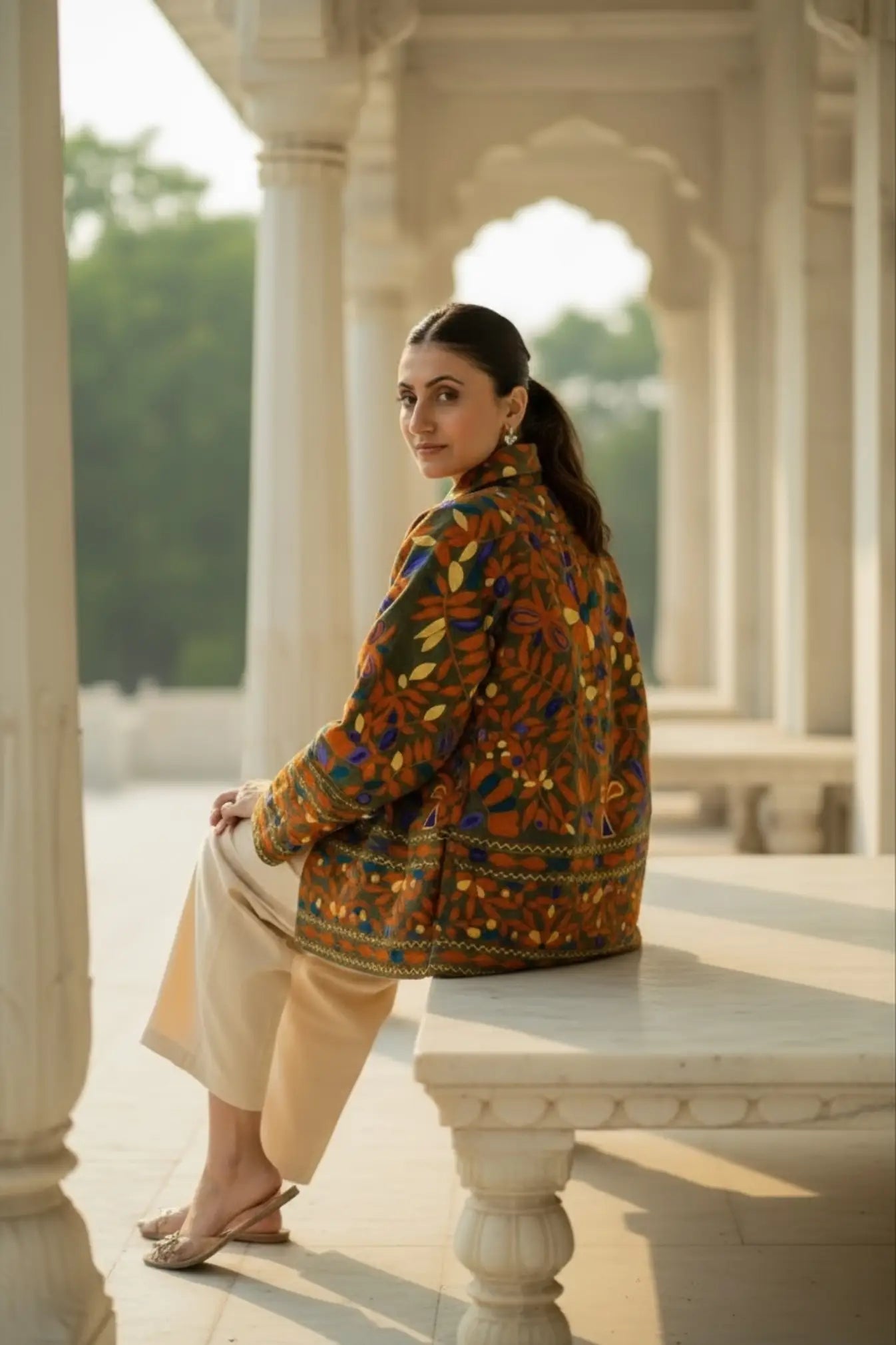 Thoughtfully crafted with exceptional attention to detail and designed to feel both timeless and wearable. It is fully lined on the inside to offer gentle warmth and structure, making it suitable for year‑round layering. Each piece is hand embroidered with wool thread and hand stitched in very small batches, ensuring no two jackets are exactly alike. The placement of motifs varies on every garment, celebrating its handmade and artisanal nature.