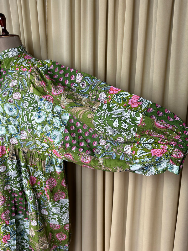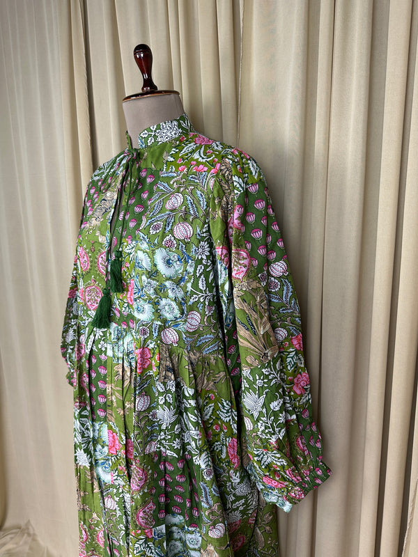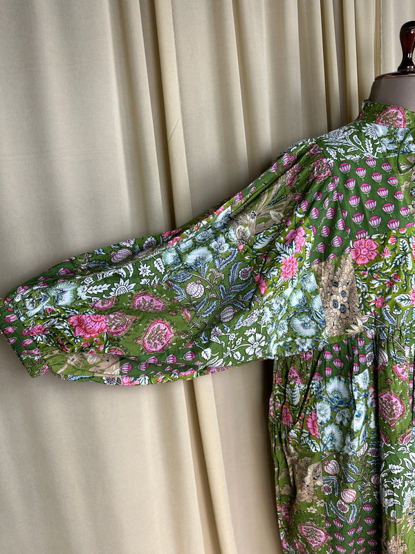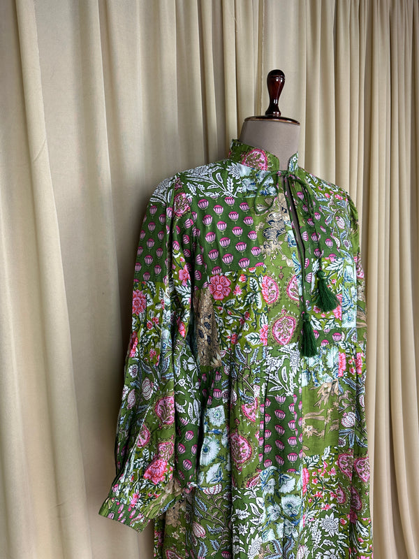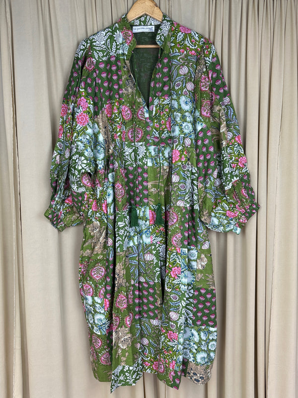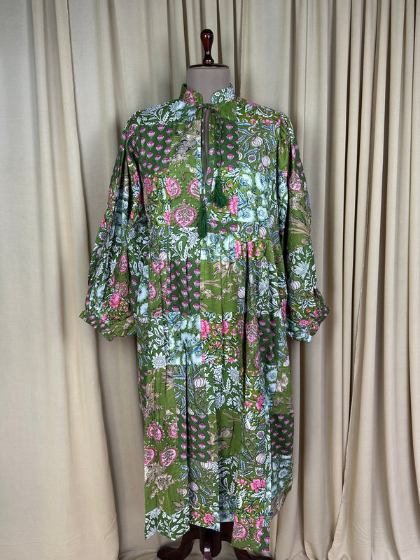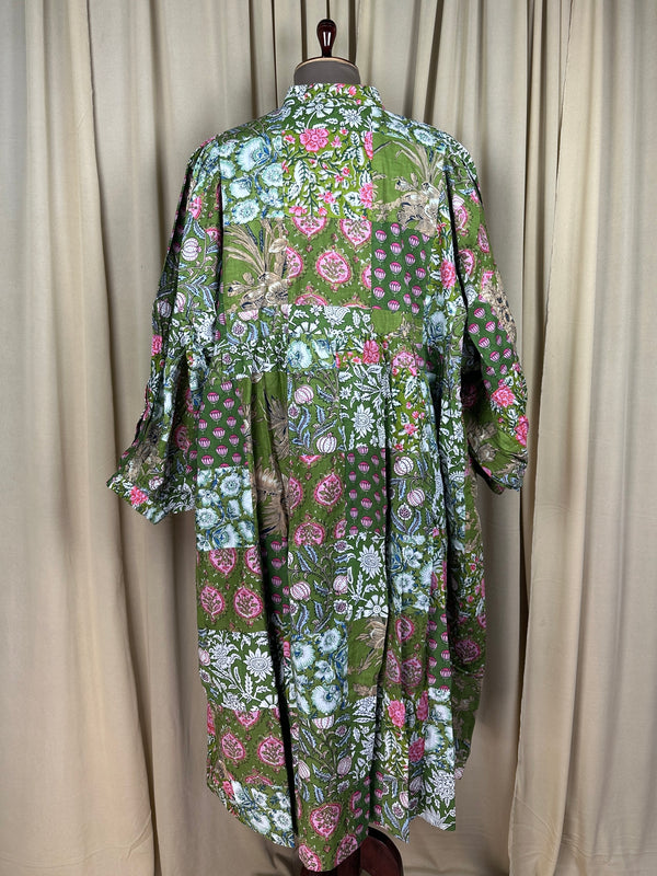 Green Patchwork Cotton Dress: Hand-Stitched Block Print, Fits XXL