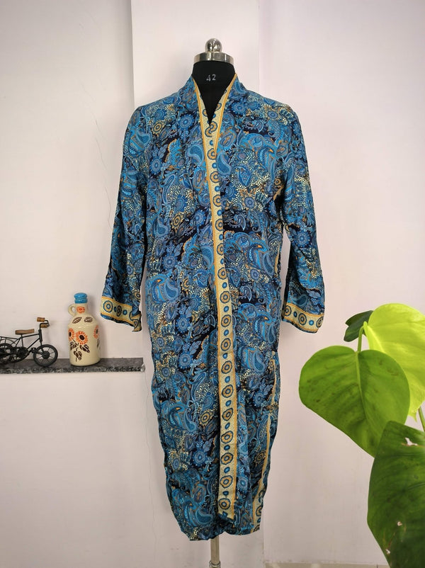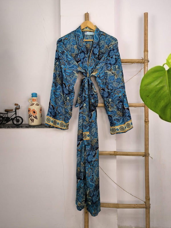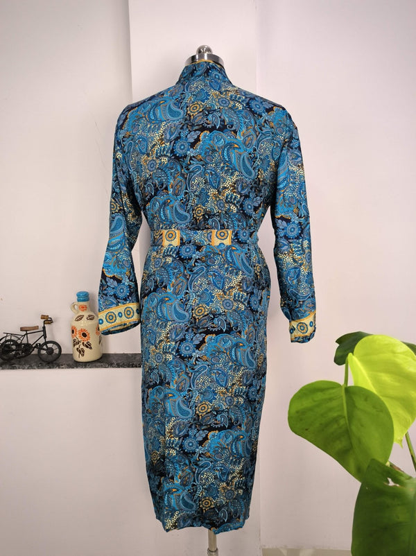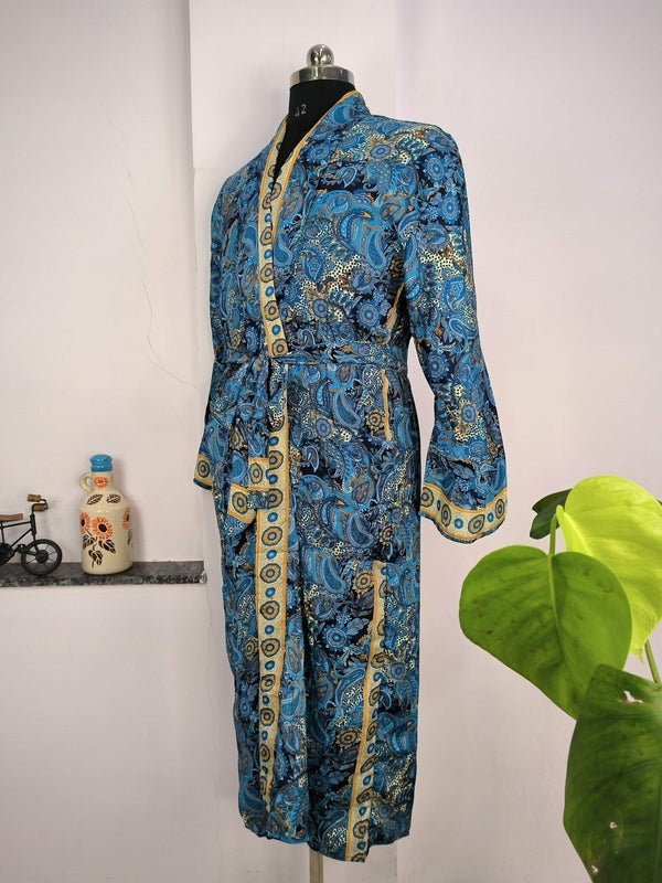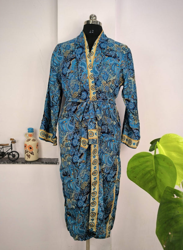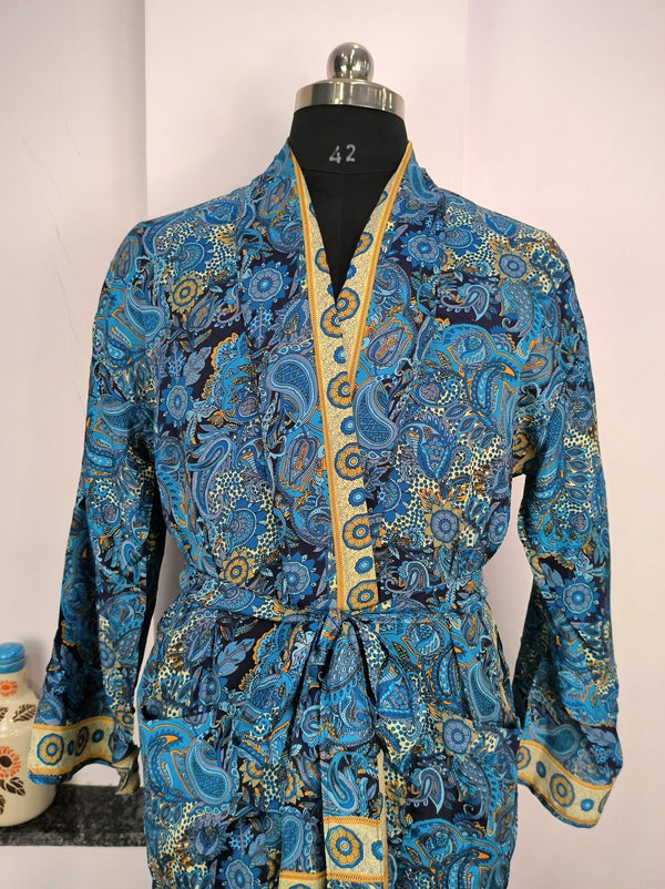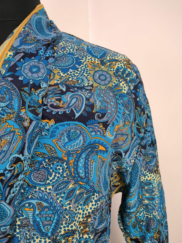 Boho Men's Soft Silk Kimono, Man Regal House Beach Robe, Persian King Paisley Elegant Blue Yellow Hues