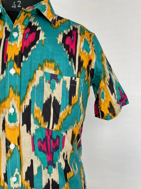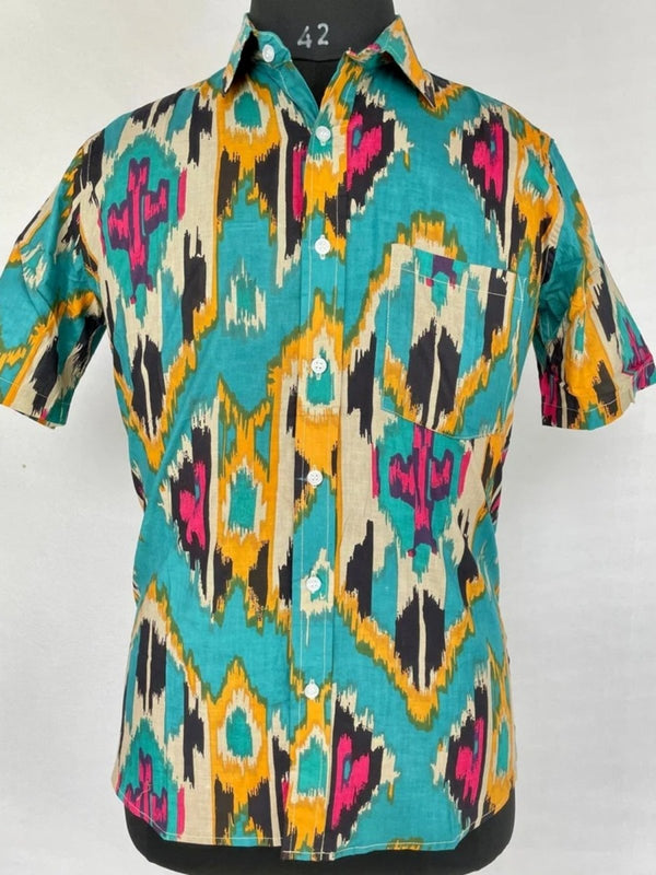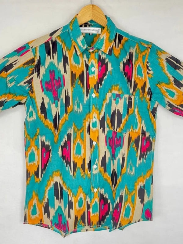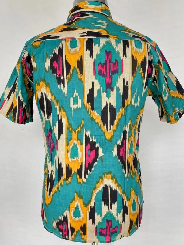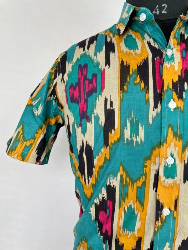 Men's Shirt Pure Cotton Handblock Print | Summer Cool Casual Beach Wear, Comfortable Garden Picnic Urban Man Dad Gift | Turquoise Ikat Print