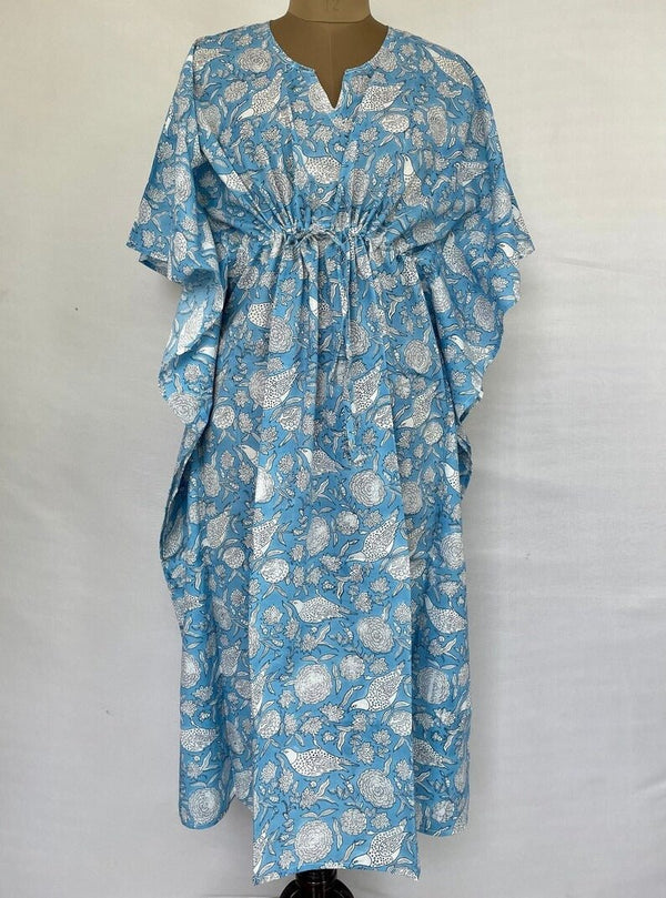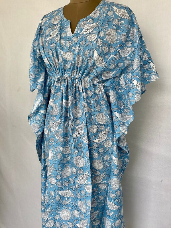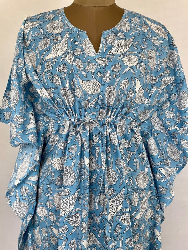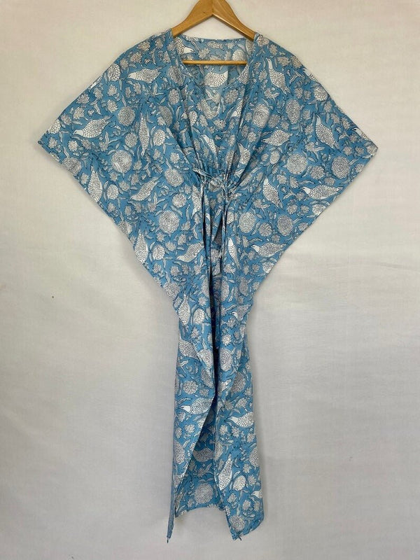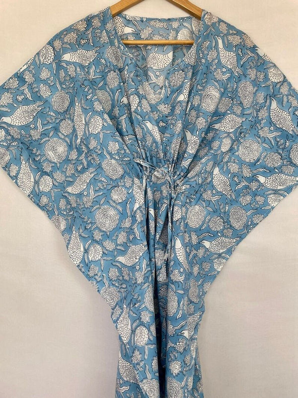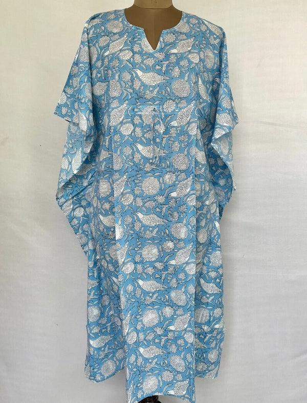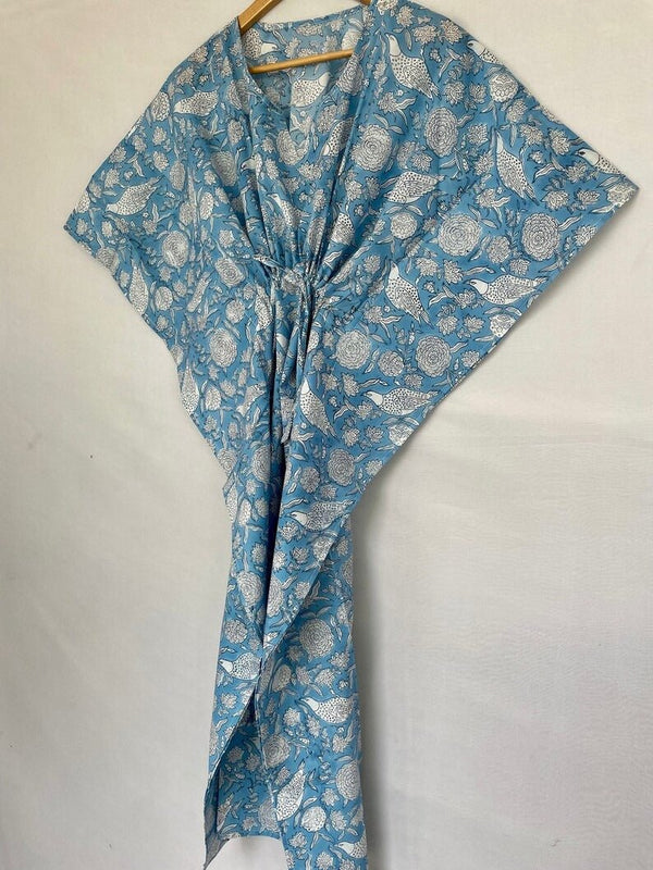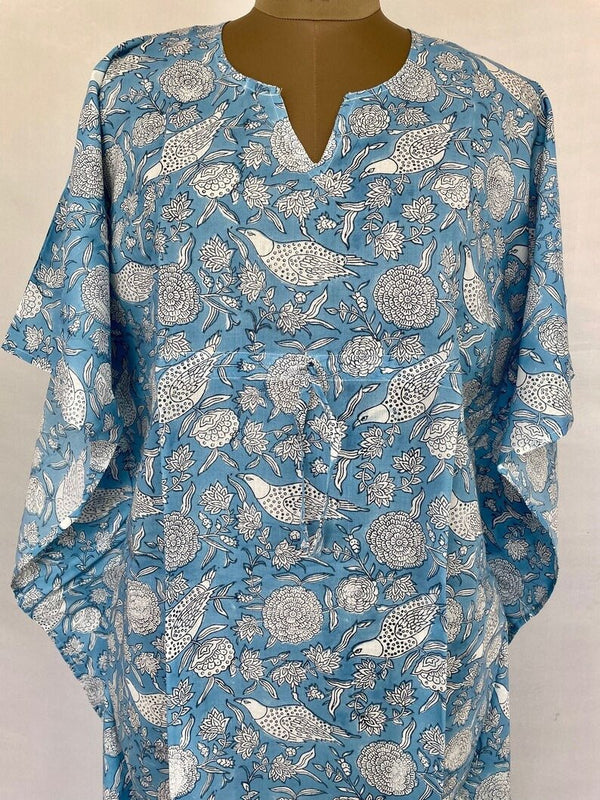 Pure Cotton Kaftan Summer Kimono Indian Block Printed Floral Beach Coverup, Comfy Maternity Mom | Sky Blue Bird White Floral Summer Cloth